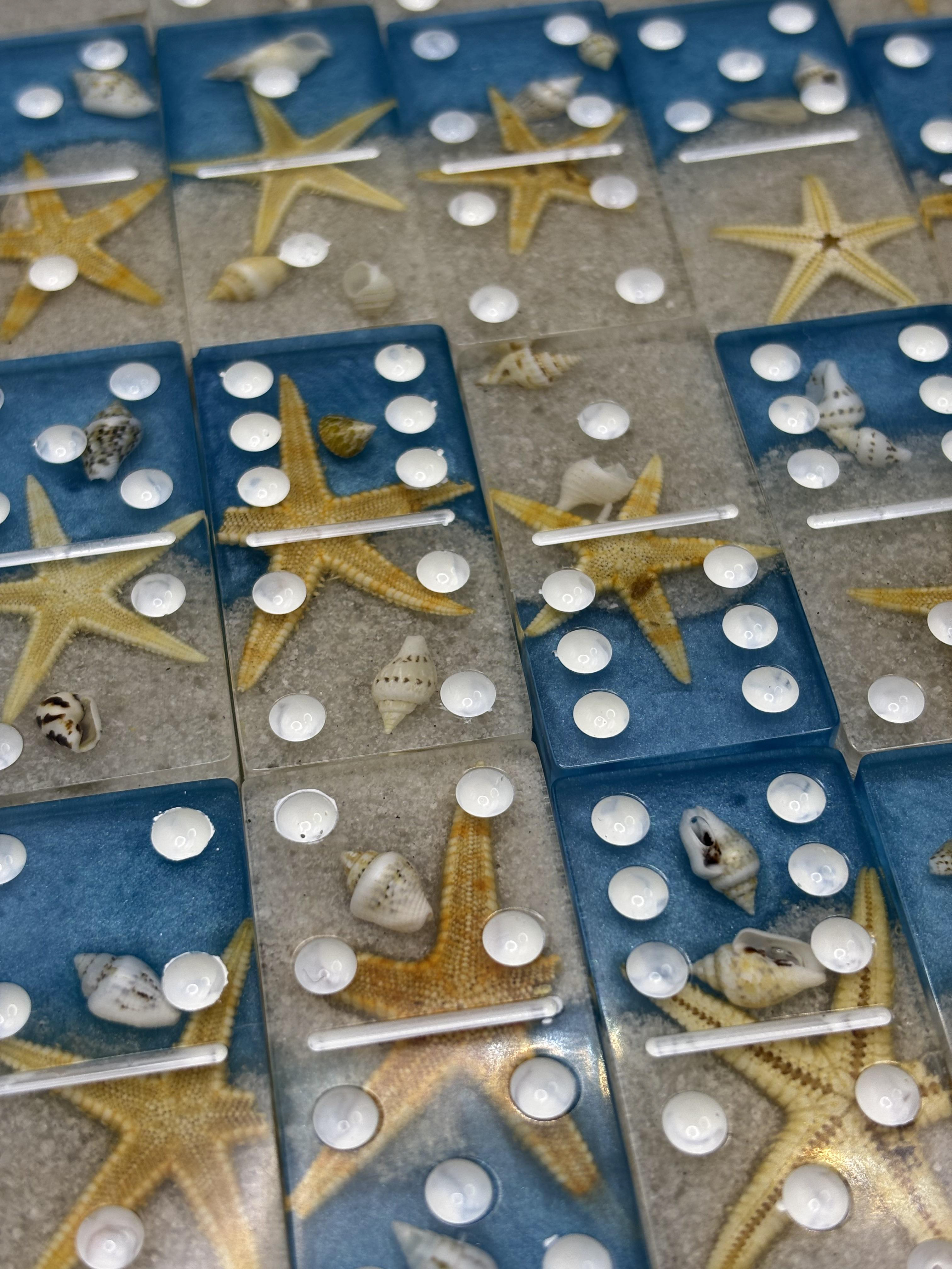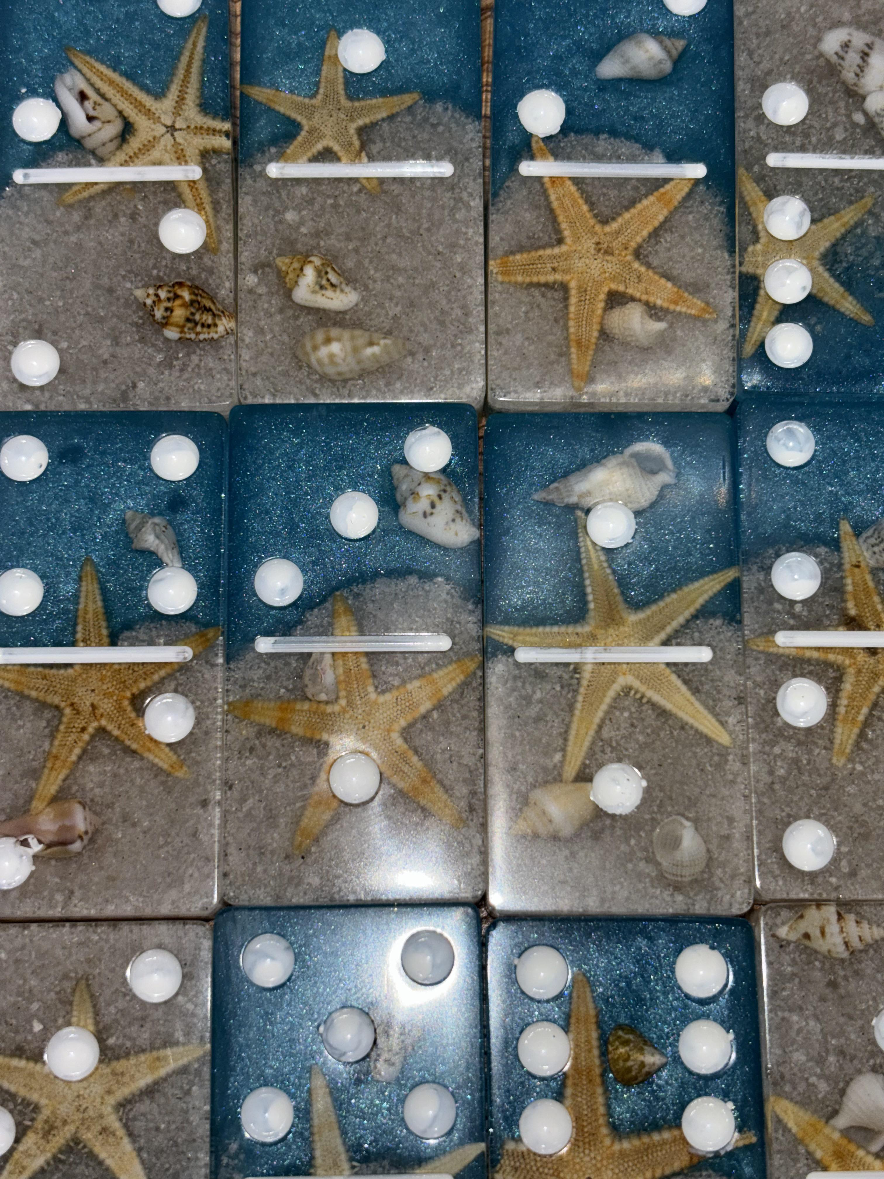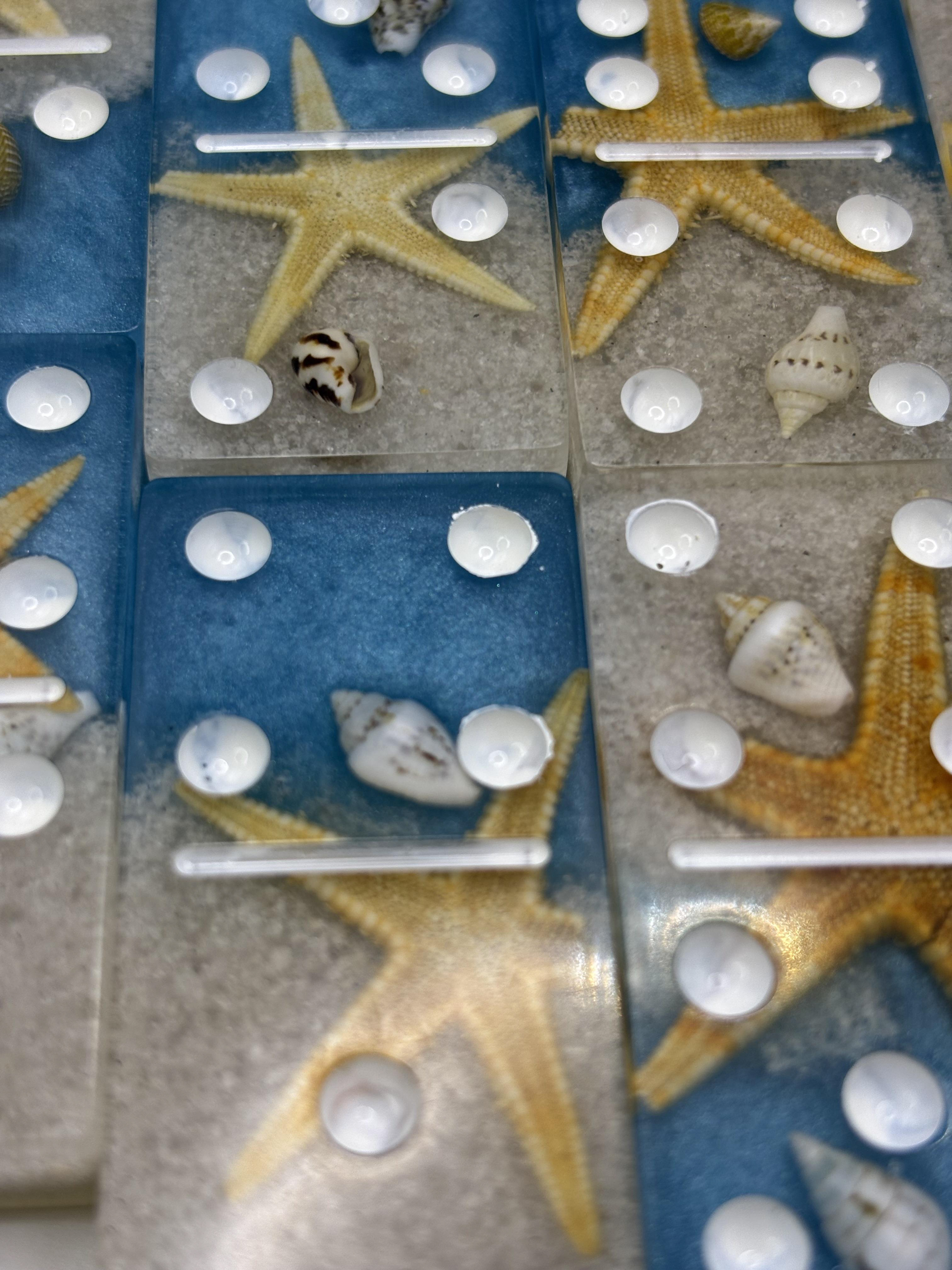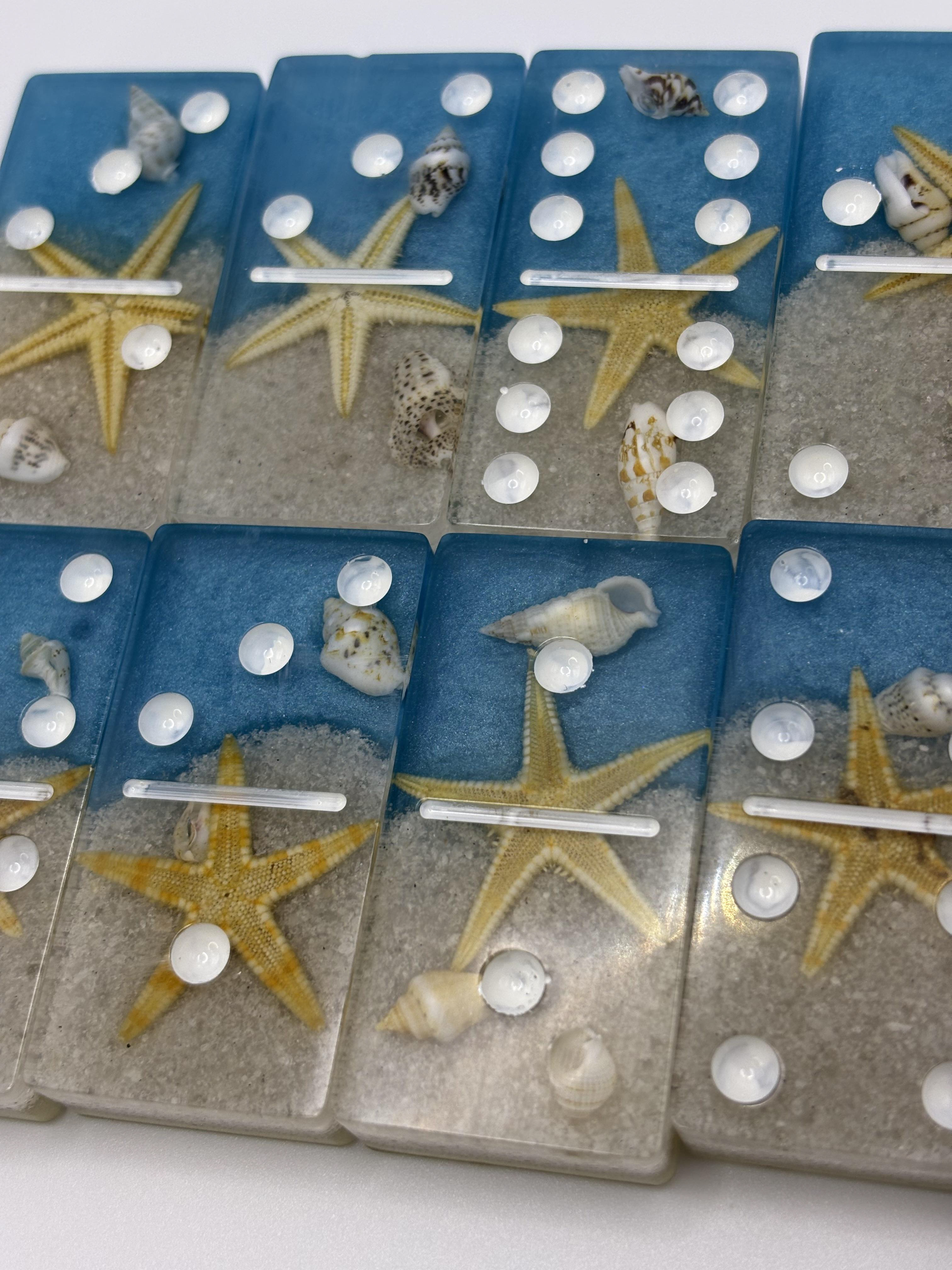 Each domino is crafted with real starfish, seashells, and beach sand suspended in crystal-clear resin, creating a miniature beach scene in every tile. The glittery blue ocean and soft sandy base make this set both a functional game and a coastal keepsake.