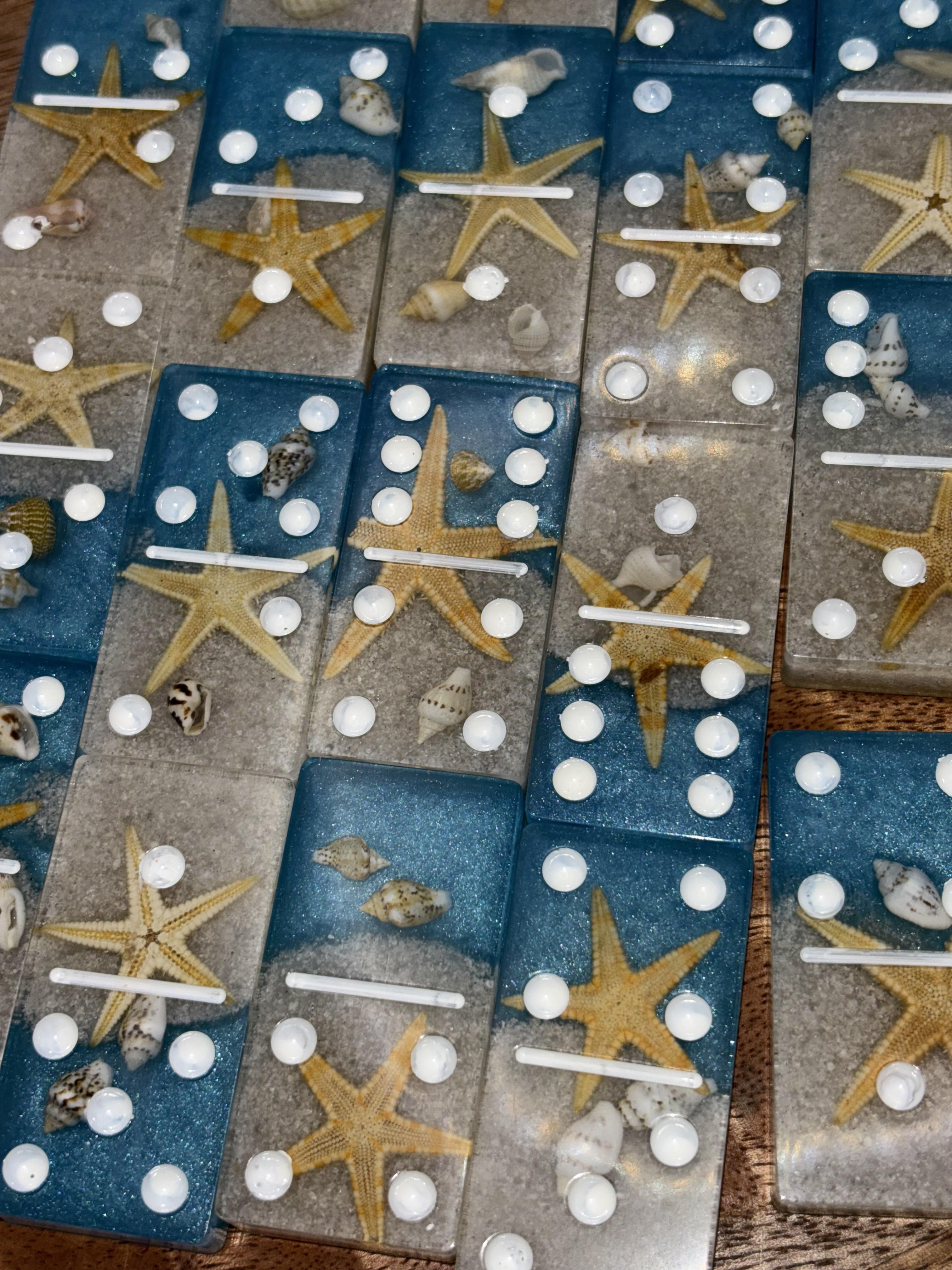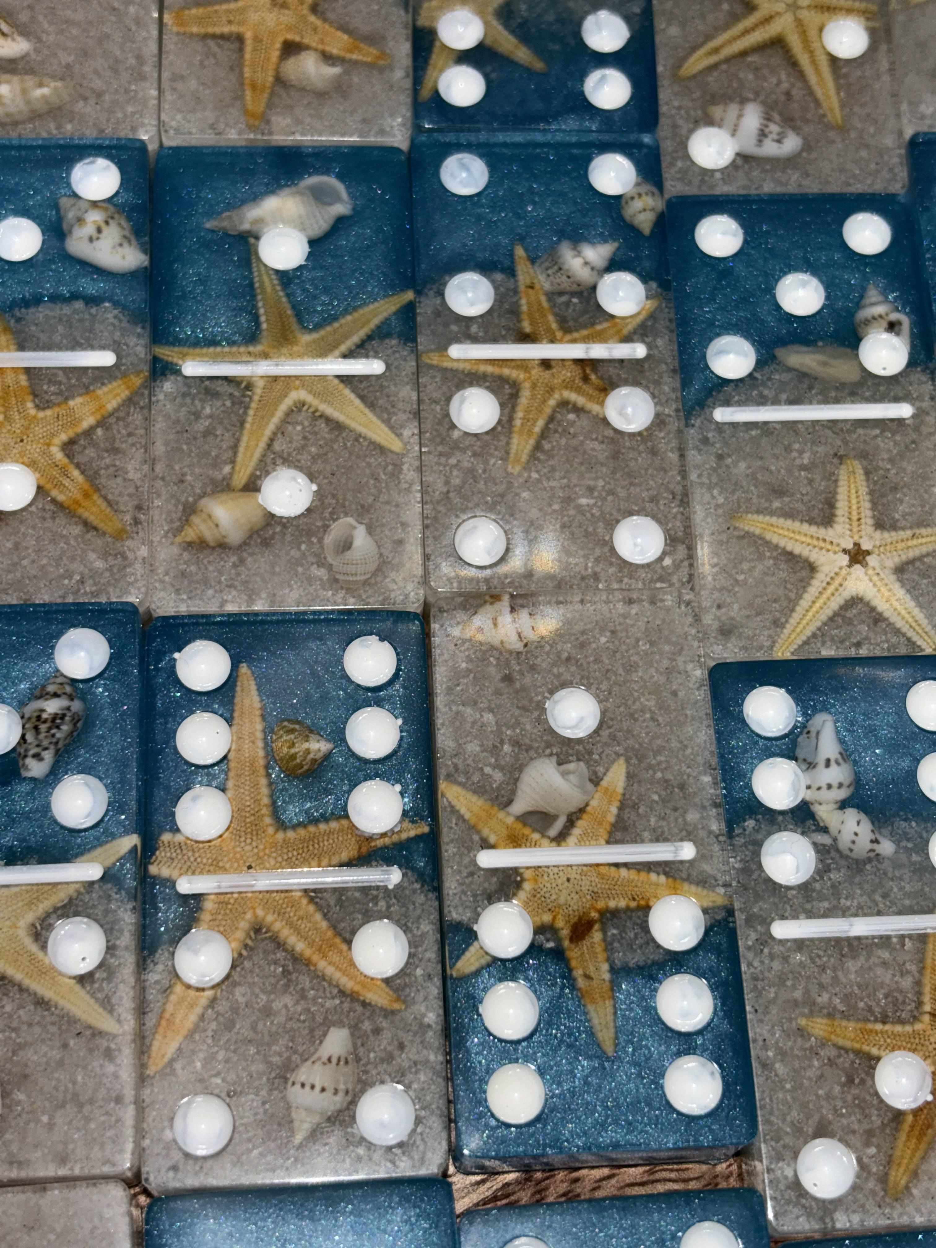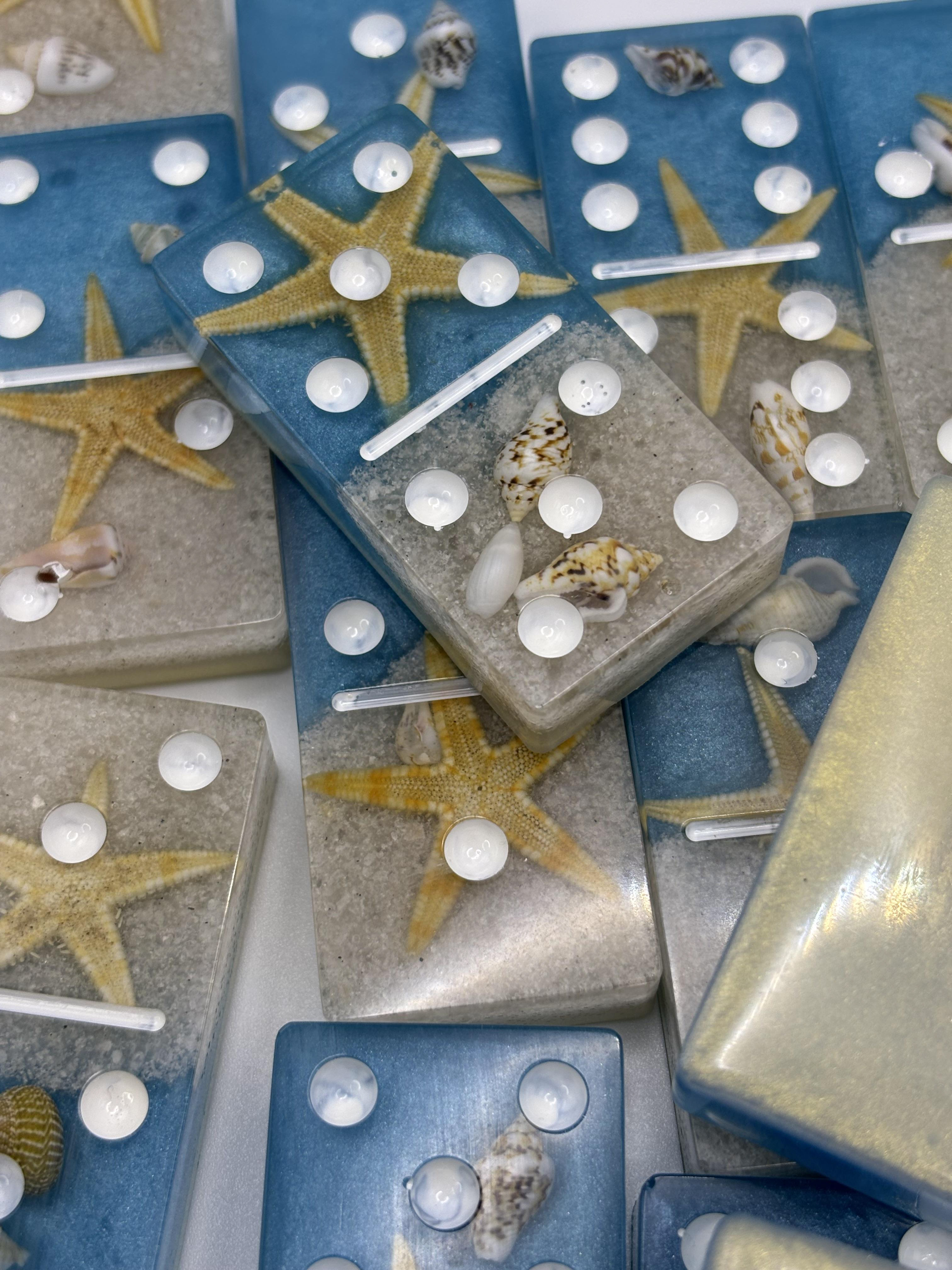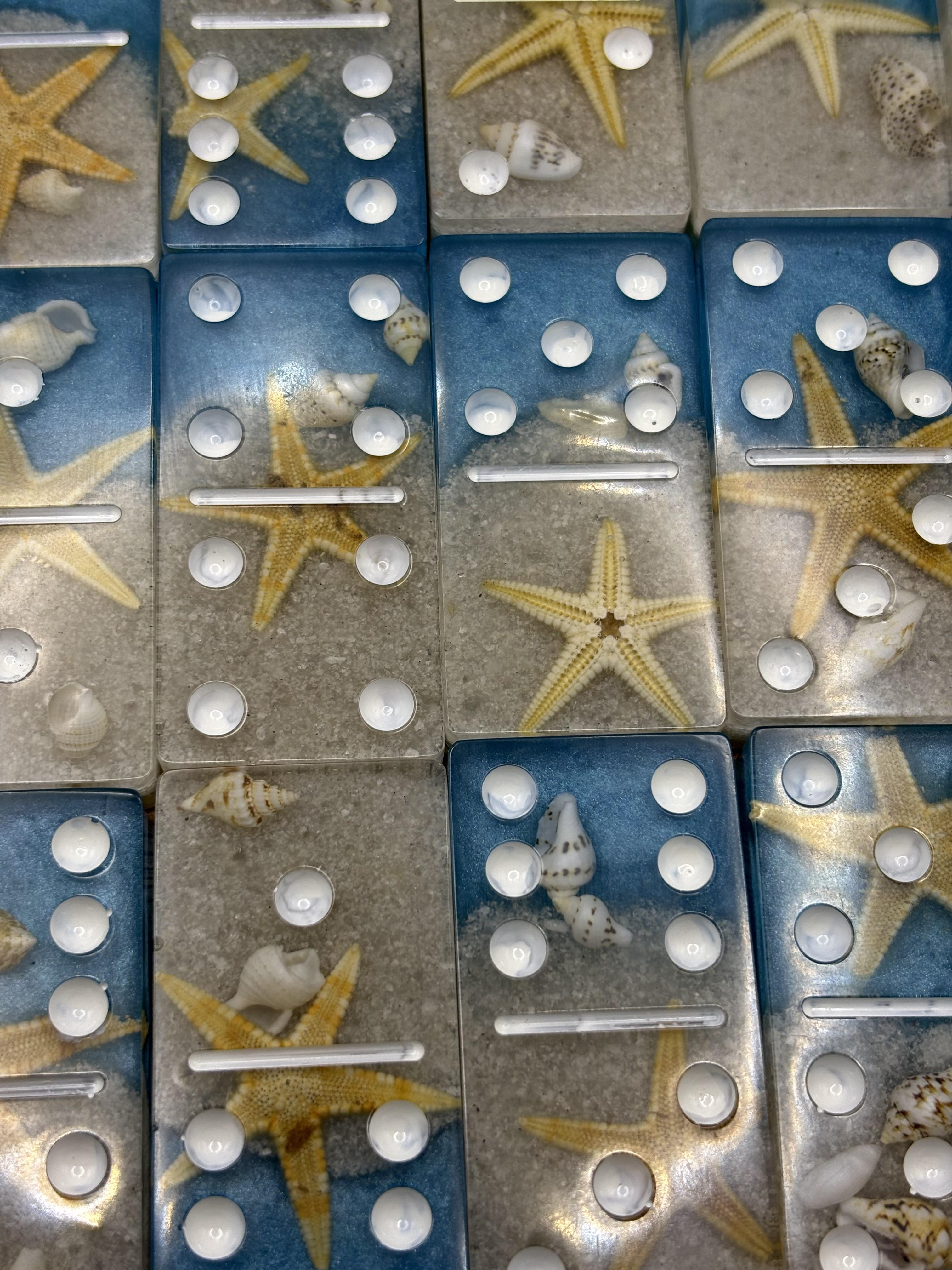 Each domino is crafted with real starfish, seashells, and beach sand suspended in crystal-clear resin, creating a miniature beach scene in every tile. The glittery blue ocean and soft sandy base make this set both a functional game and a coastal keepsake.