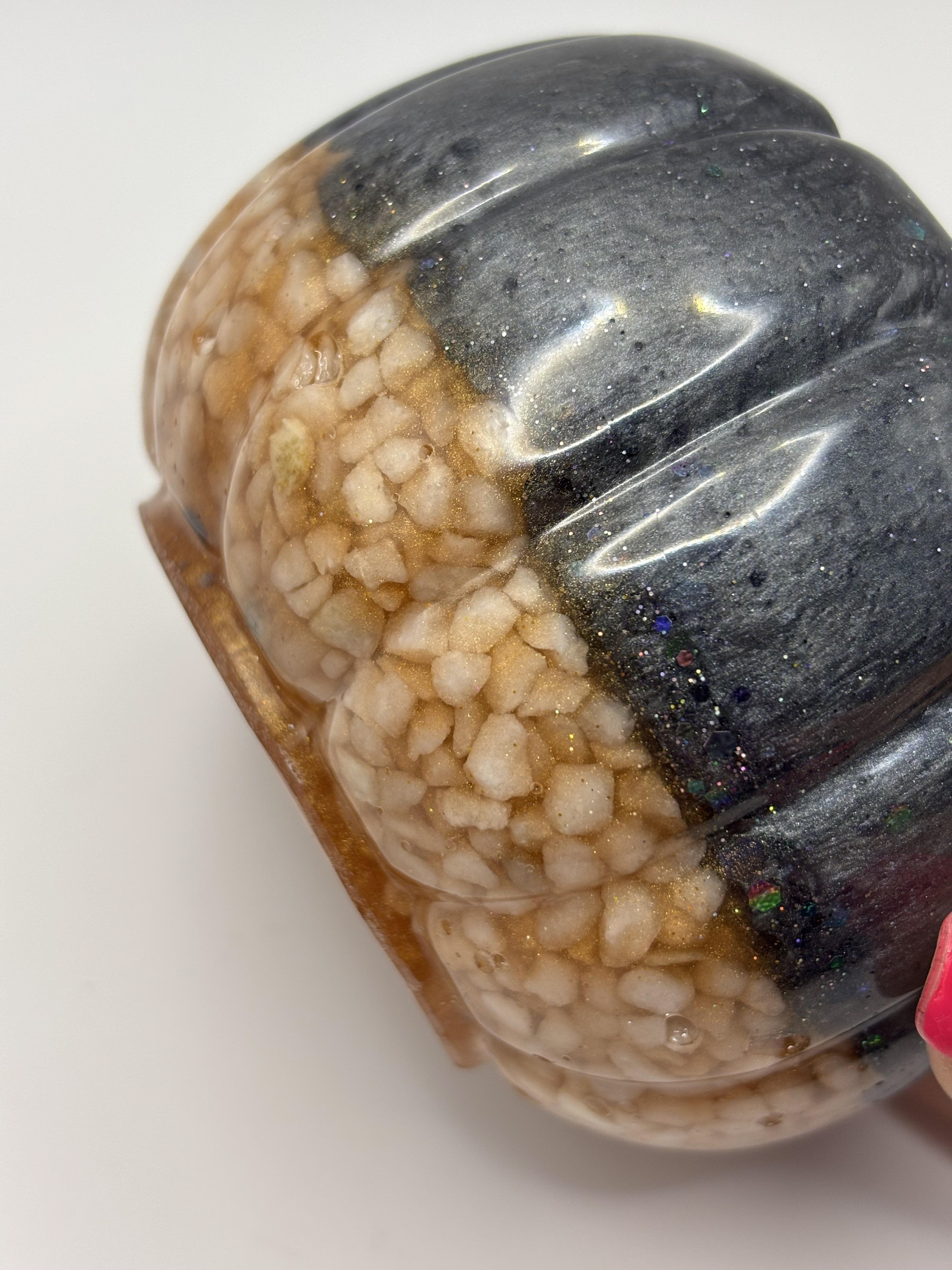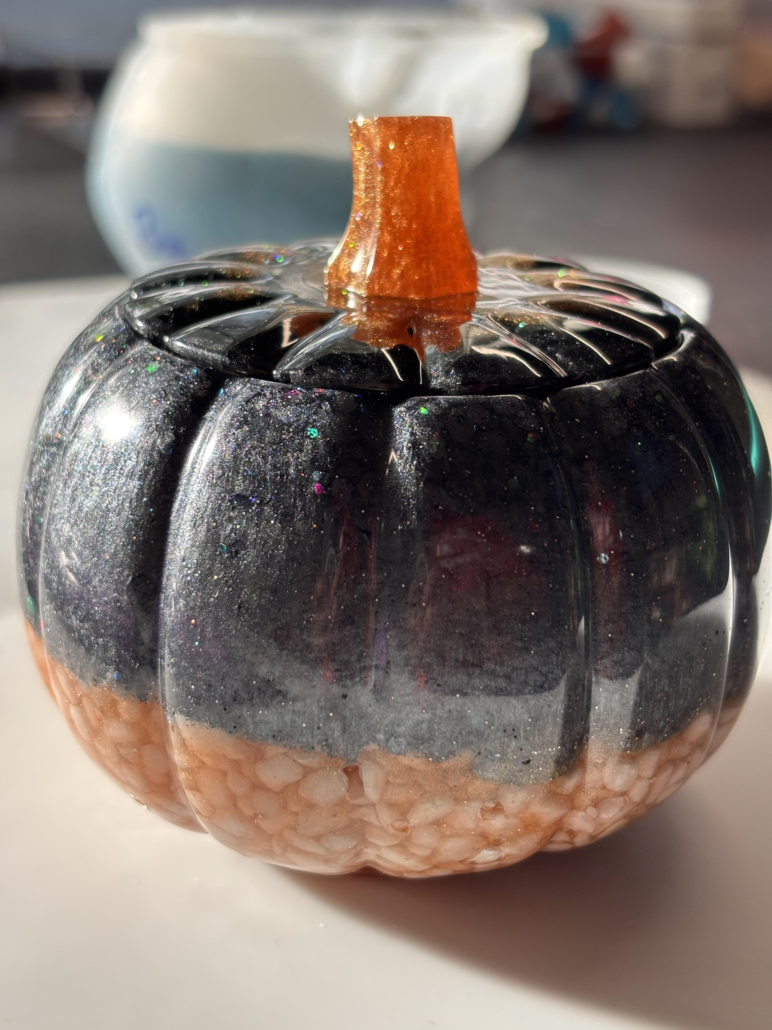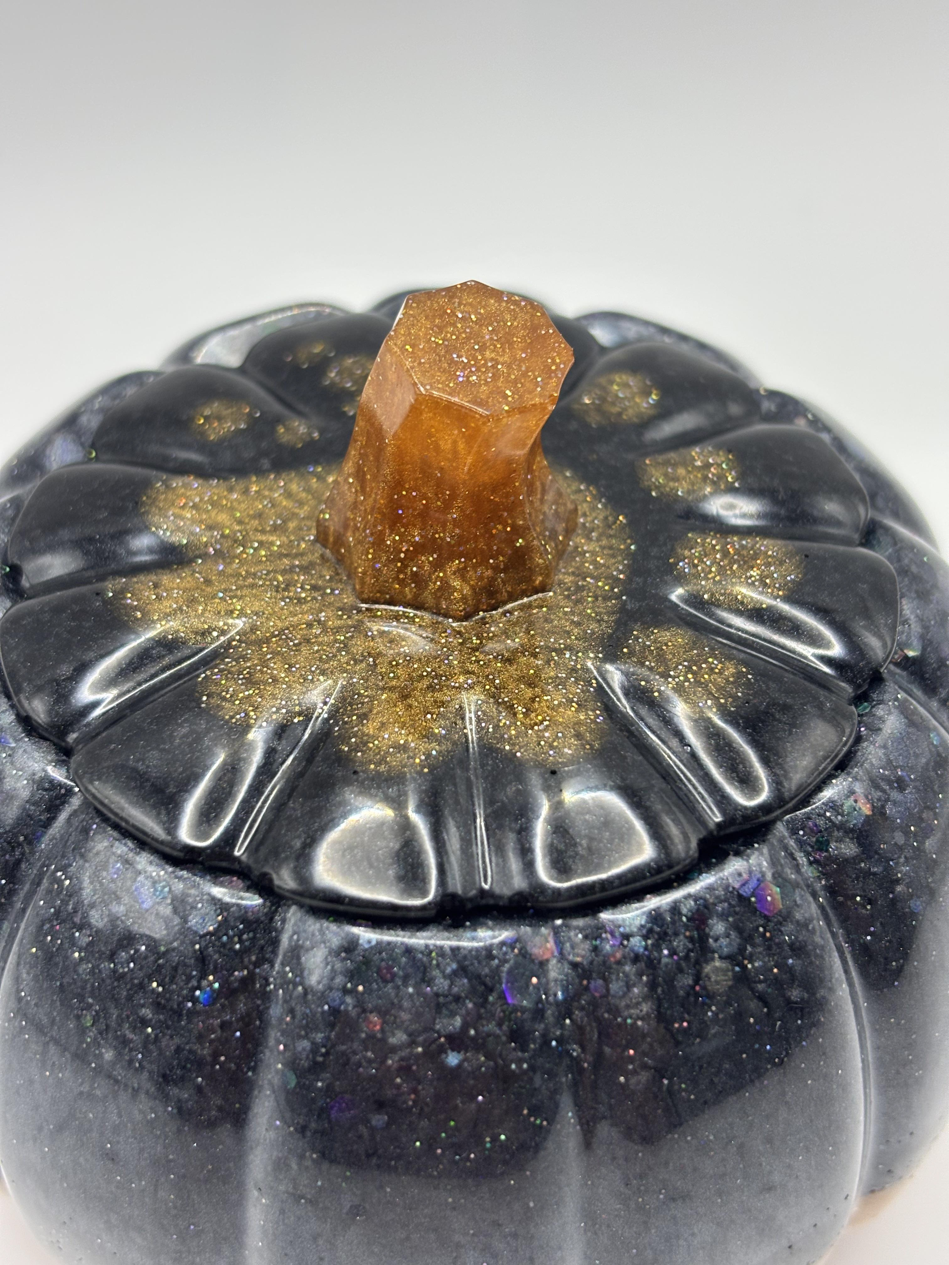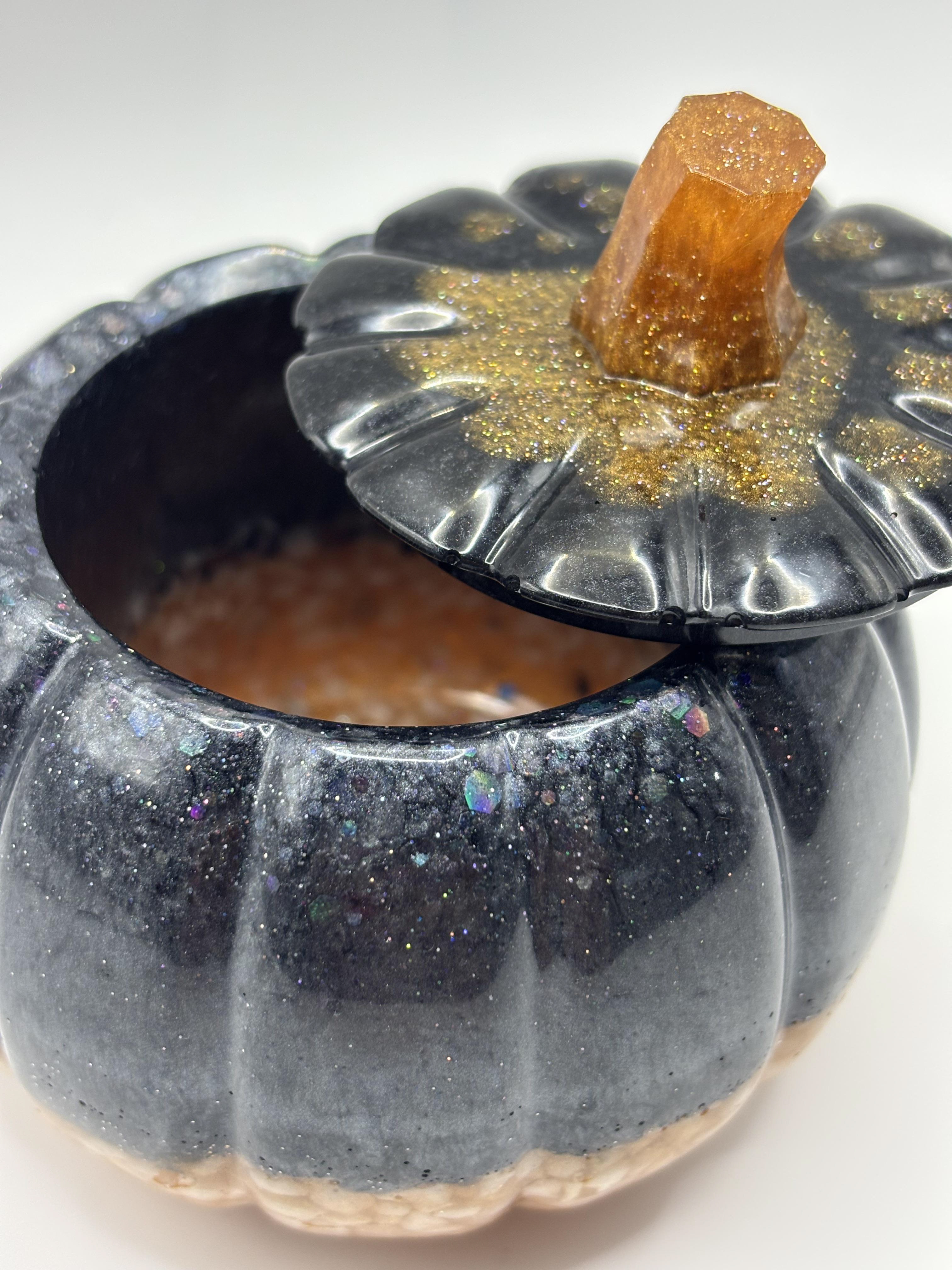 Celebrate spooky season in style with this handmade resin Halloween pumpkin! Featuring a glossy black shimmer body, a glowing orange stem, and a textured base, this pumpkin doubles as festive décor and a functional storage jar. The removable lid makes it perfect for holding candy, jewelry, crystals, or other small treasures.