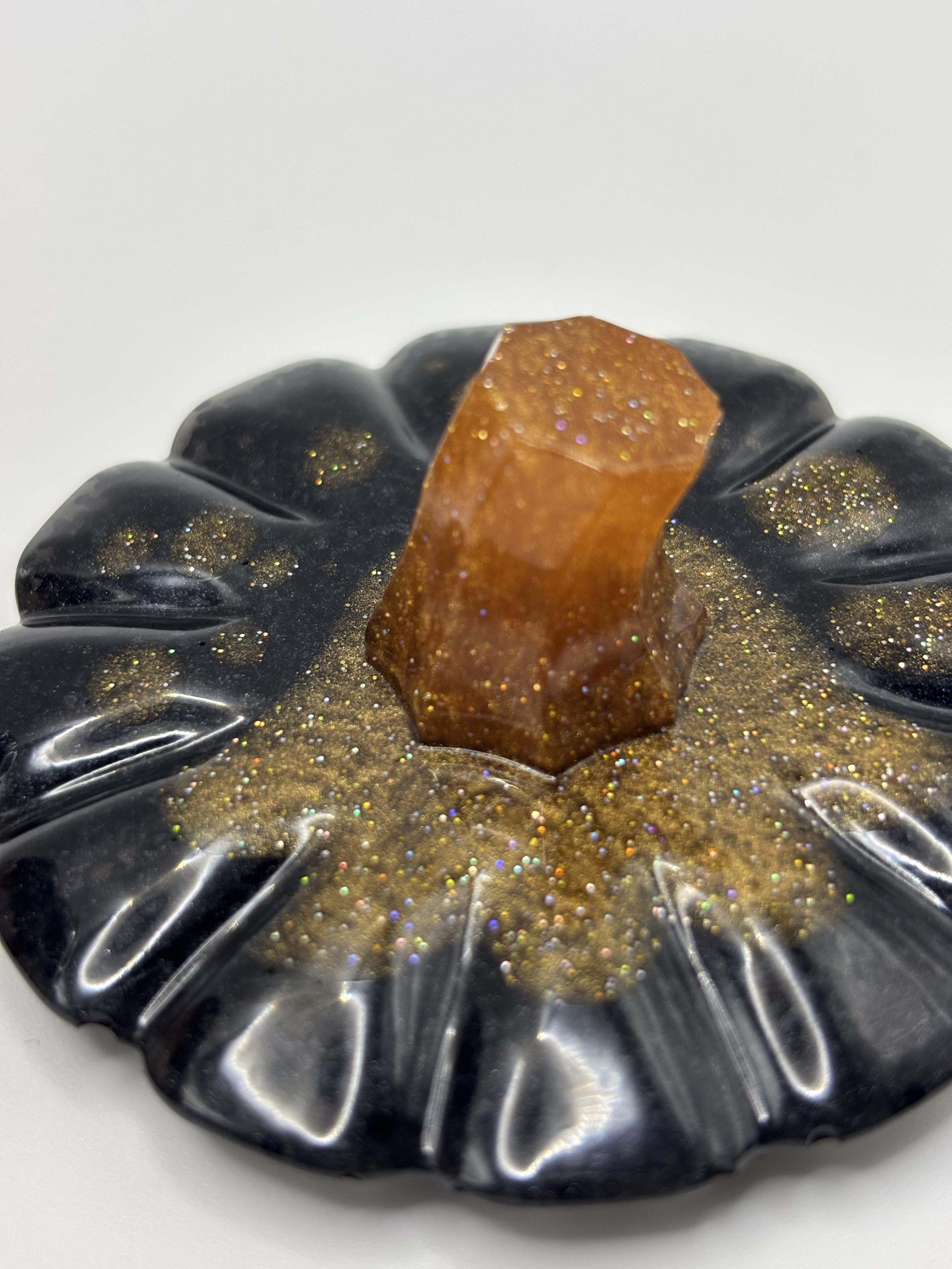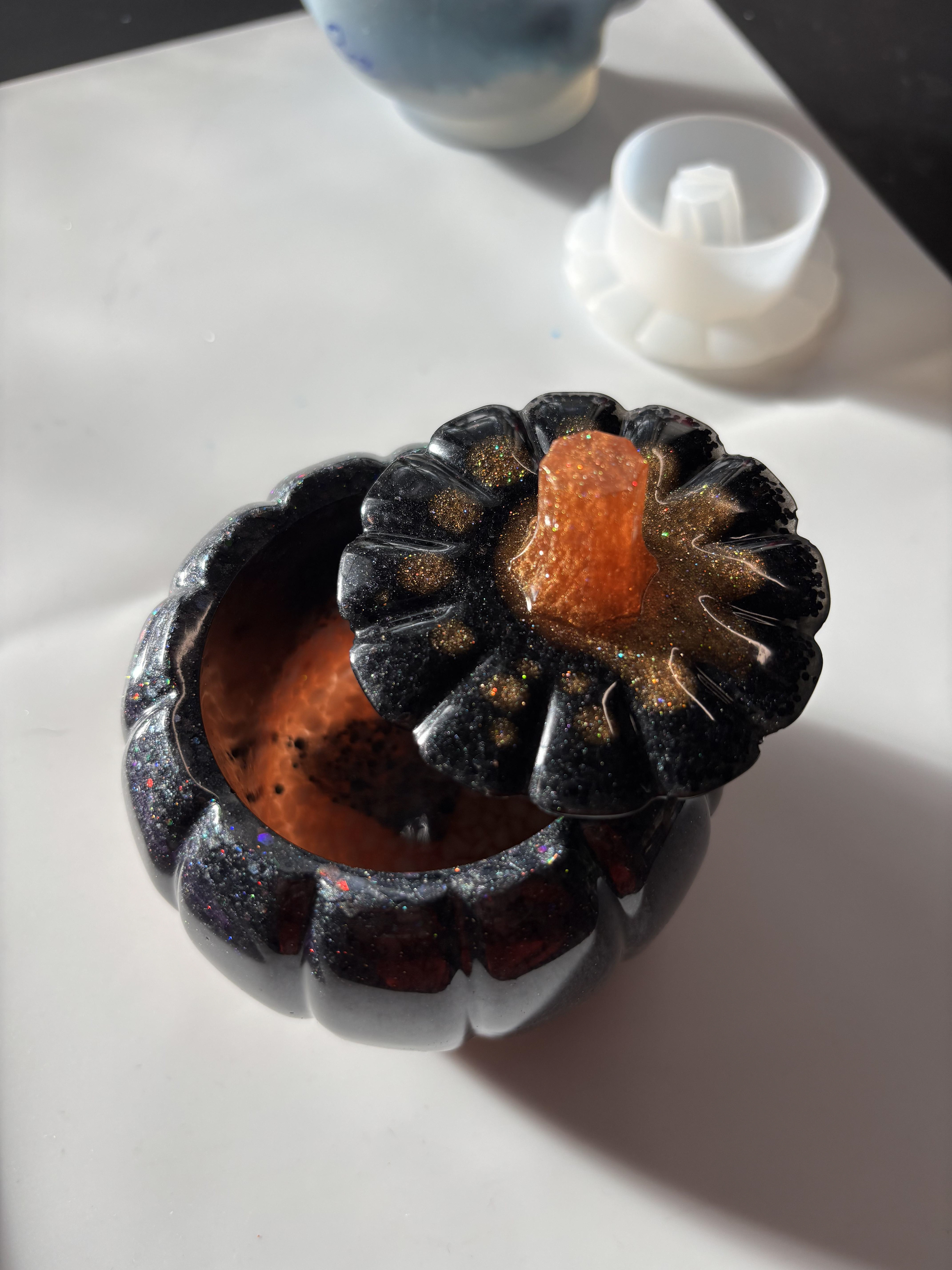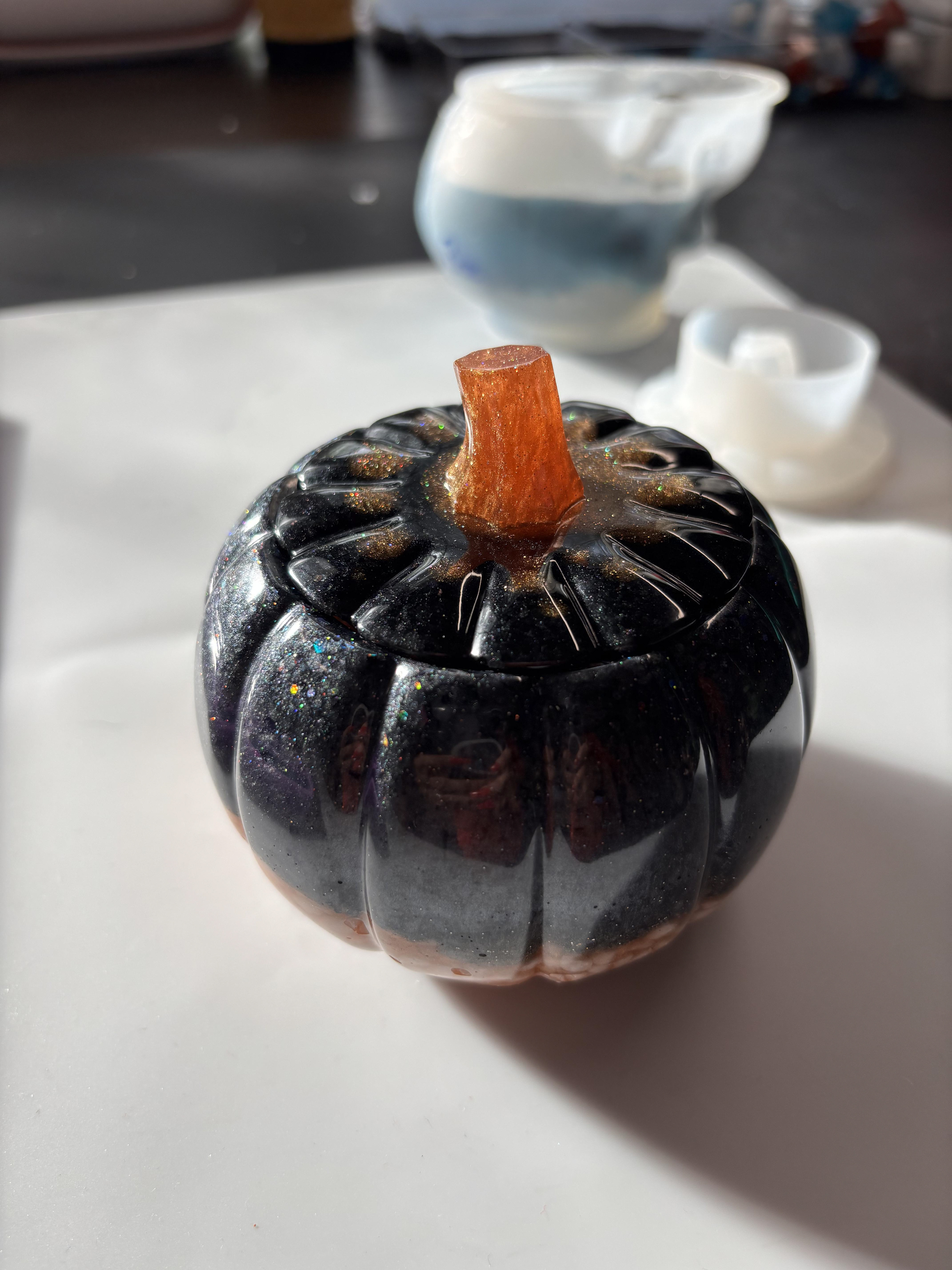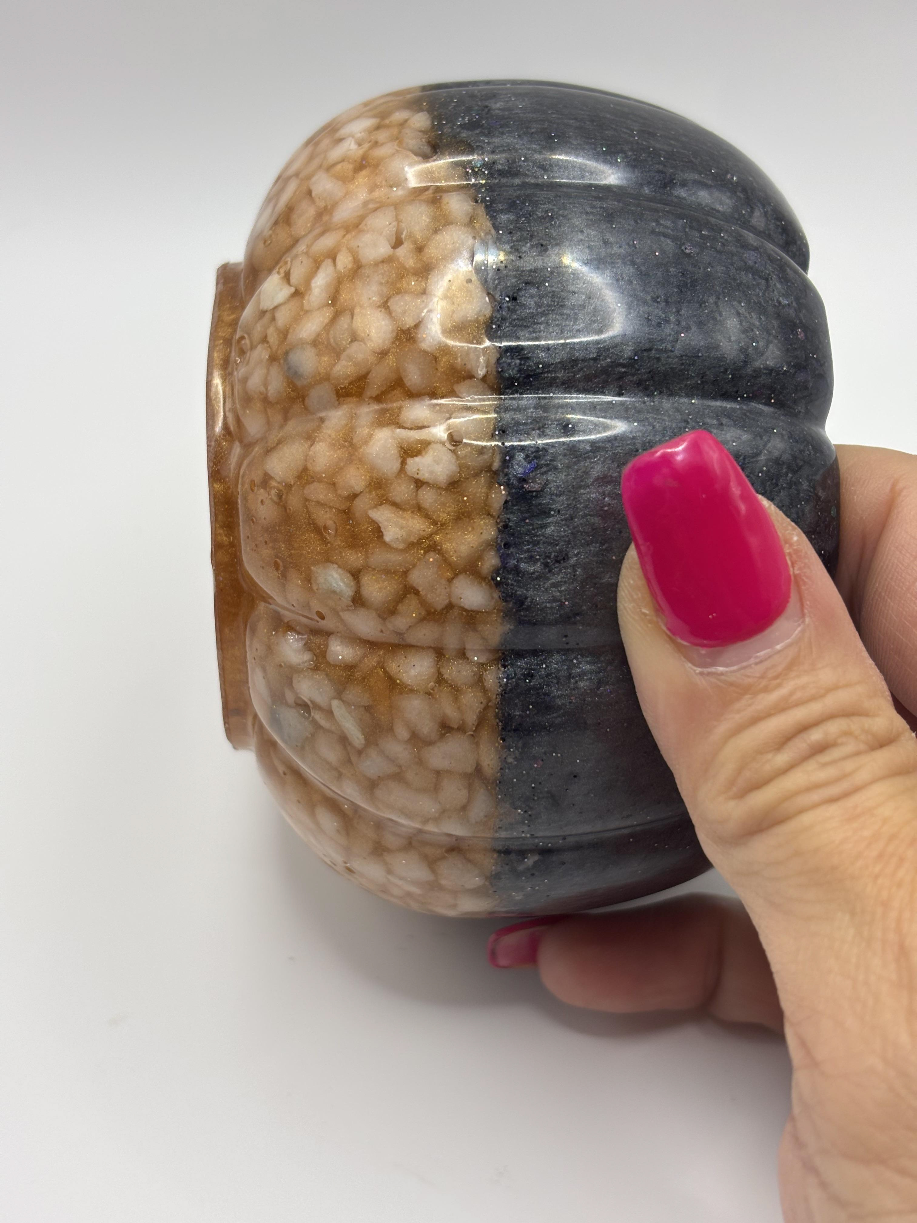 Celebrate spooky season in style with this handmade resin Halloween pumpkin! Featuring a glossy black shimmer body, a glowing orange stem, and a textured base, this pumpkin doubles as festive décor and a functional storage jar. The removable lid makes it perfect for holding candy, jewelry, crystals, or other small treasures.