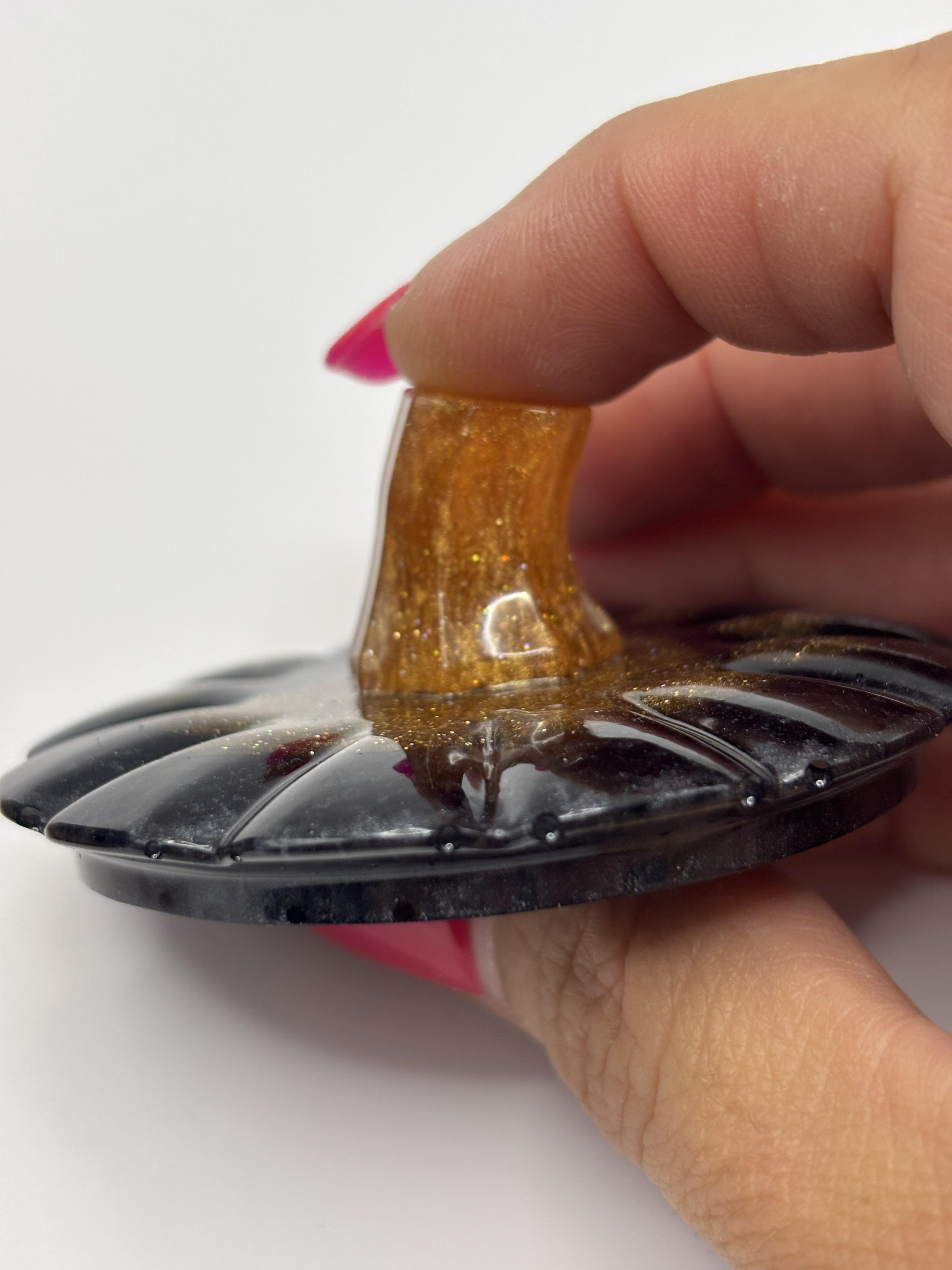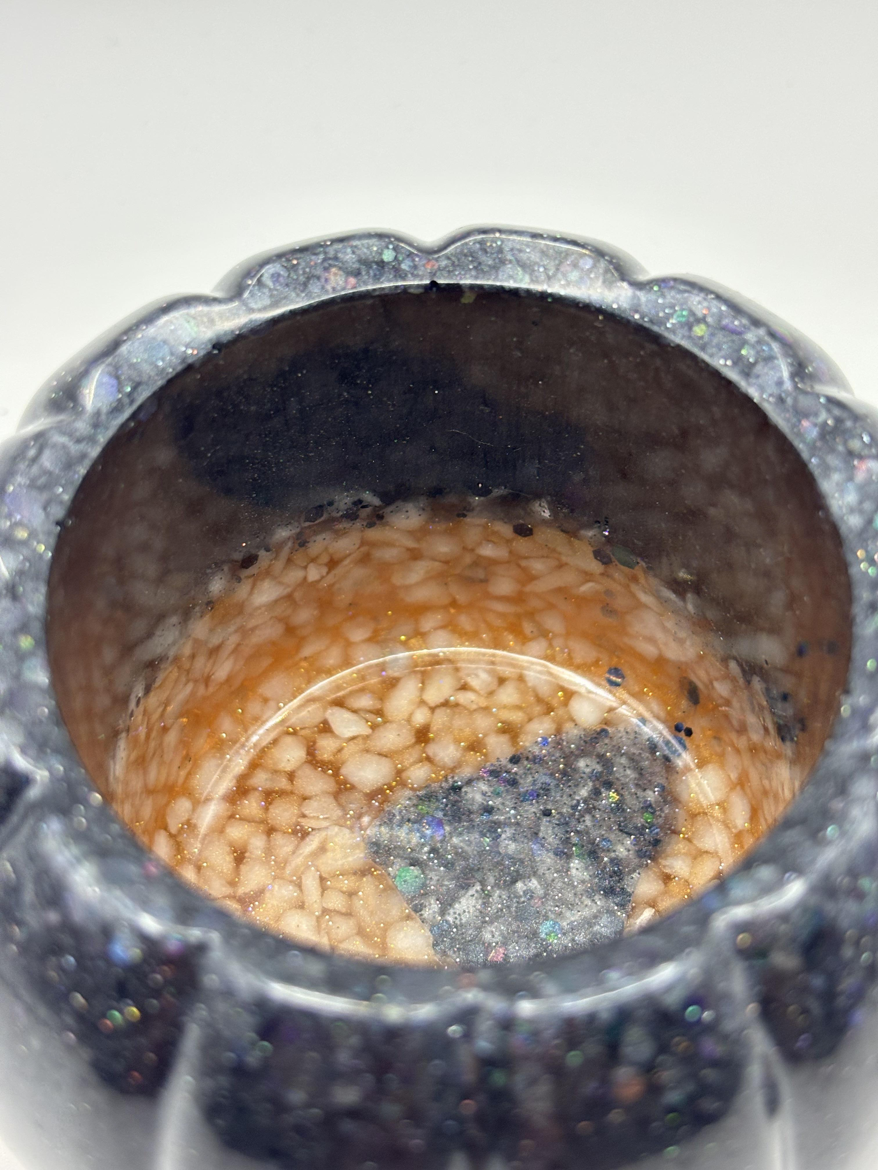 Designed with Halloween lovers in mind, this unique resin piece is ideal as a gothic fall centerpiece, an accent for your haunted home, or a thoughtful seasonal gift. The glossy finish and embedded sparkle catch the light beautifully, making it a standout addition to your Halloween décor.