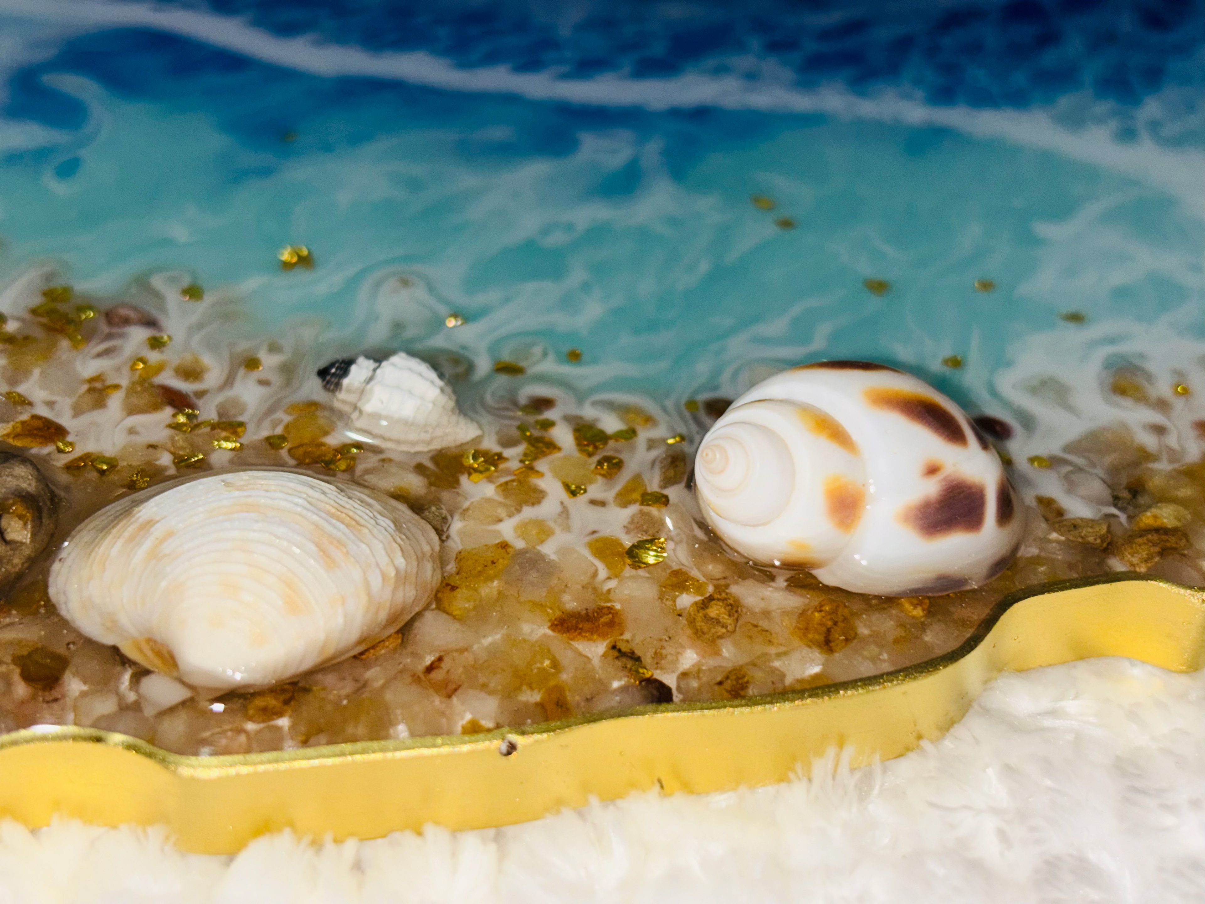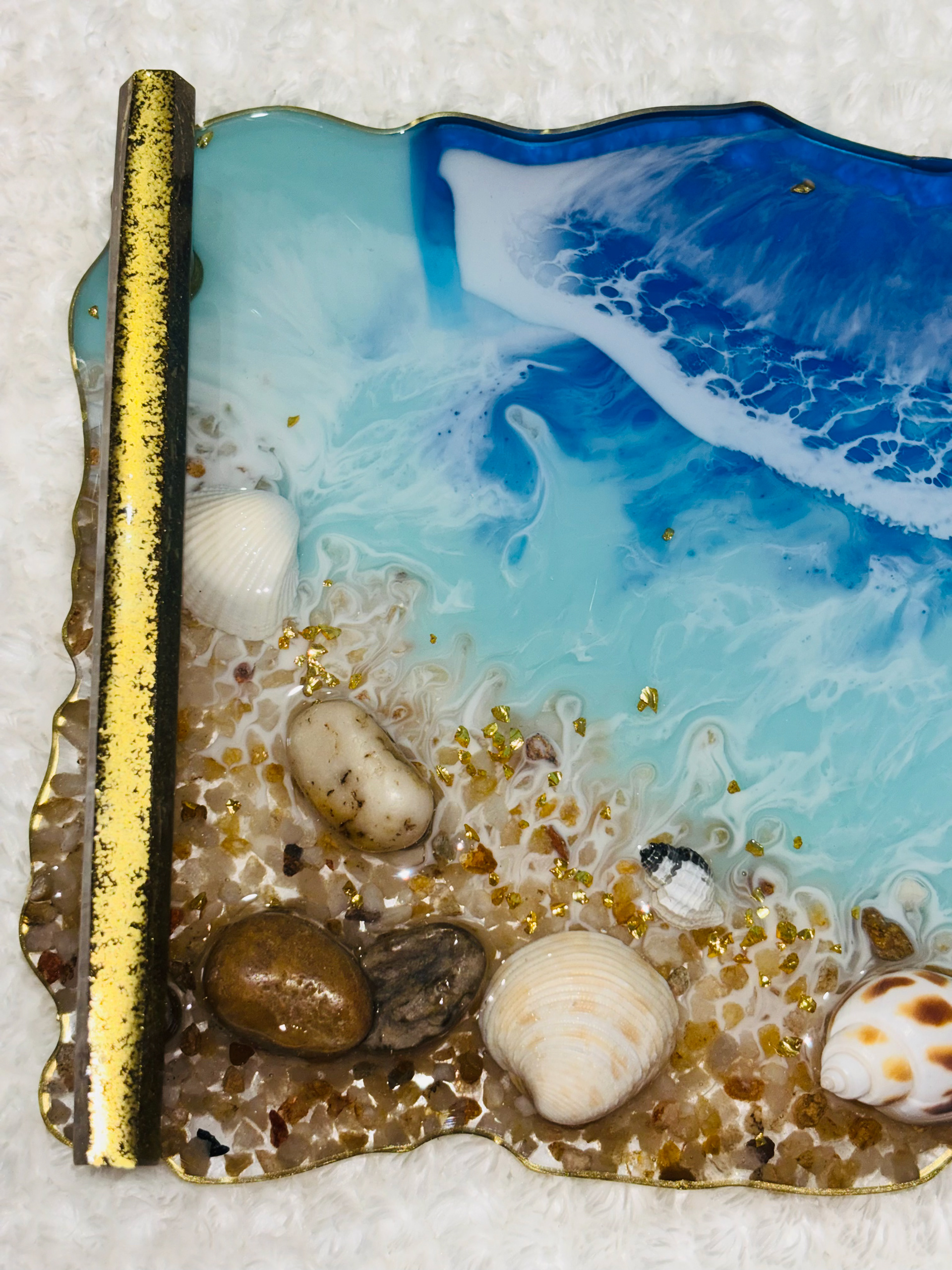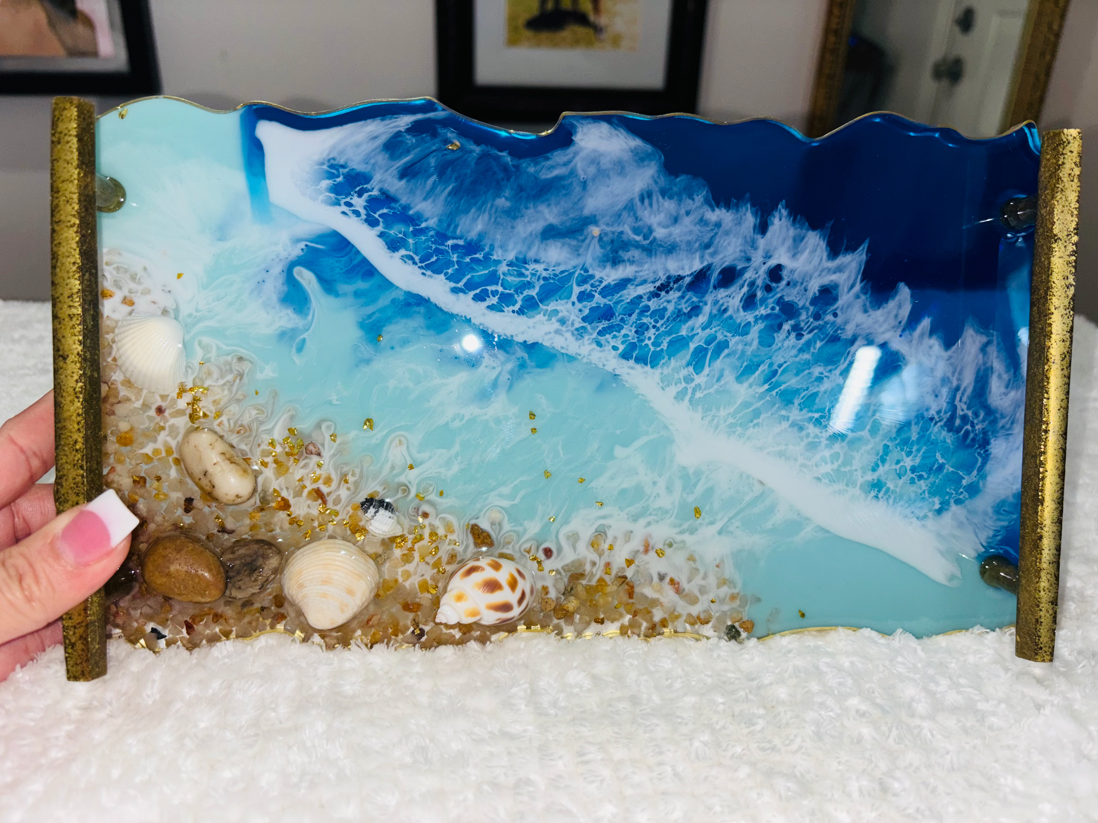 Bring the beauty of the shoreline into your home with this handmade ocean resin tray, featuring layered blue waves, foamy white surf, and a realistic sandy shoreline complete with shells and stone details. Finished with gold-accented handles, this tray is both functional and a true piece of coastal art.