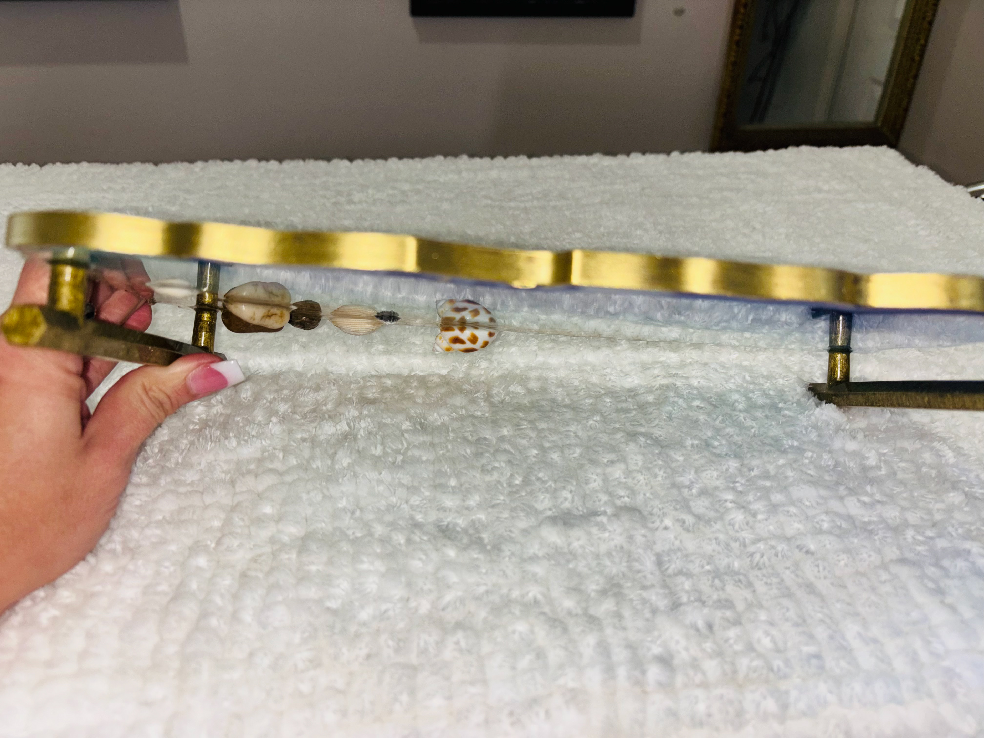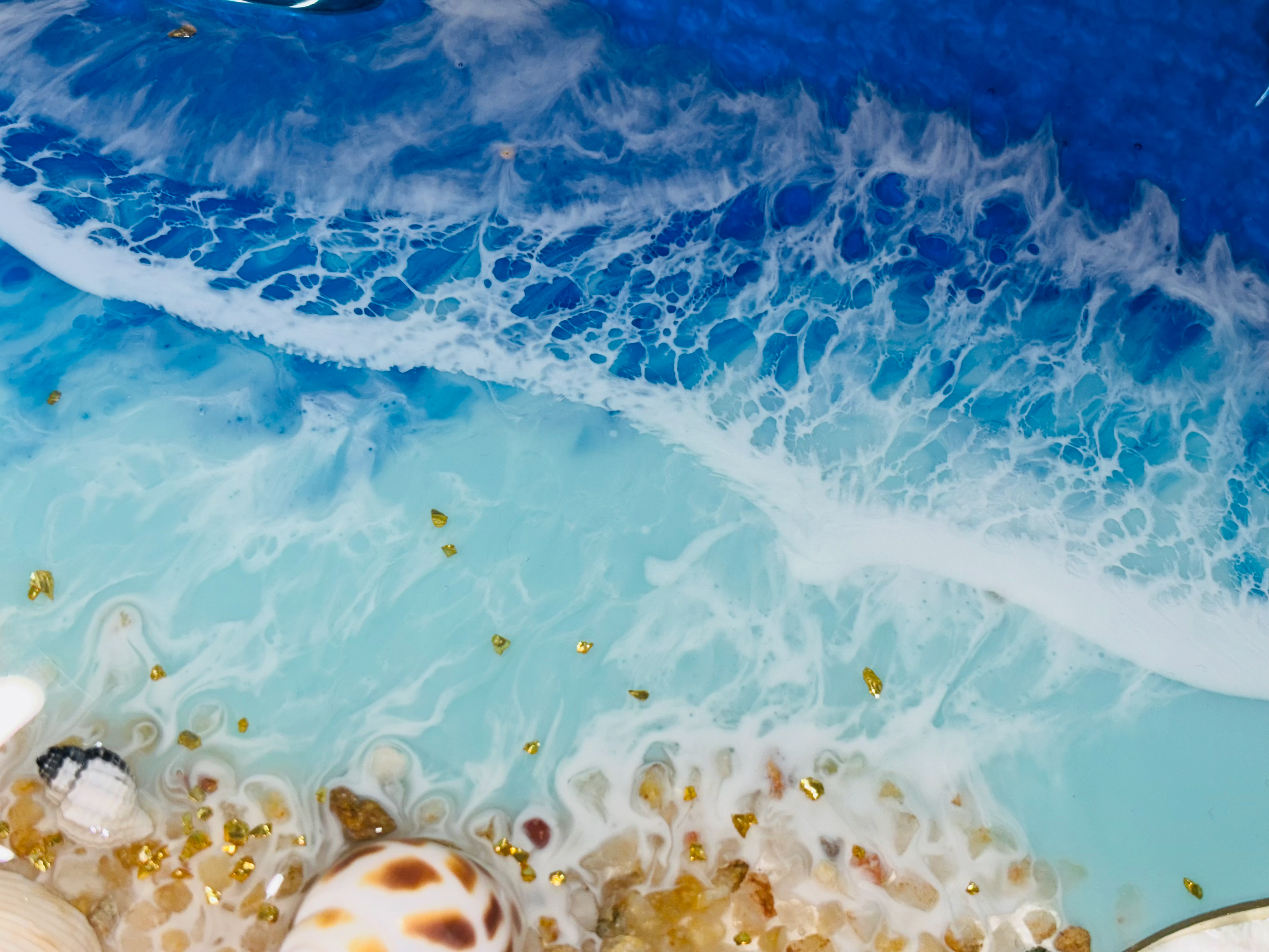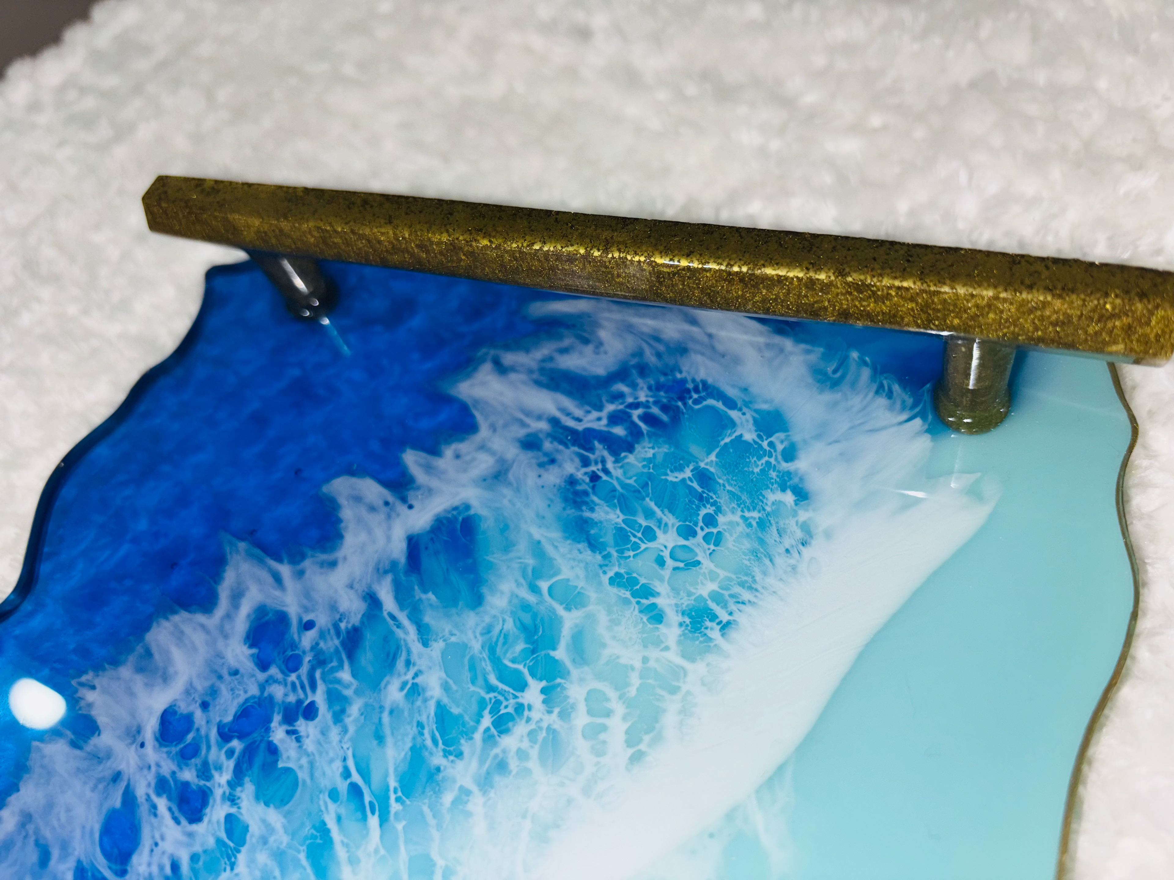 Bring the beauty of the shoreline into your home with this handmade ocean resin tray, featuring layered blue waves, foamy white surf, and a realistic sandy shoreline complete with shells and stone details. Finished with gold-accented handles, this tray is both functional and a true piece of coastal art.