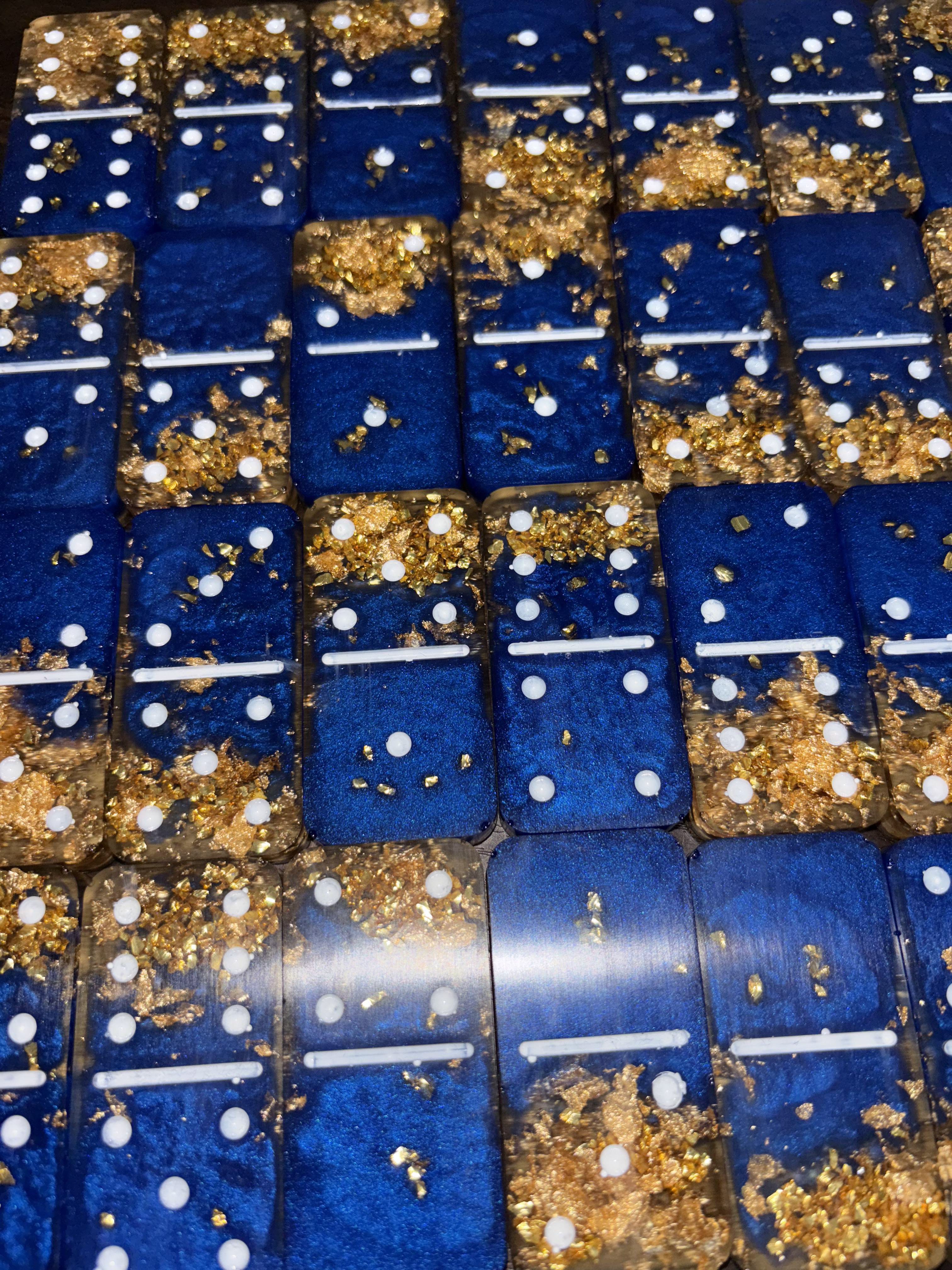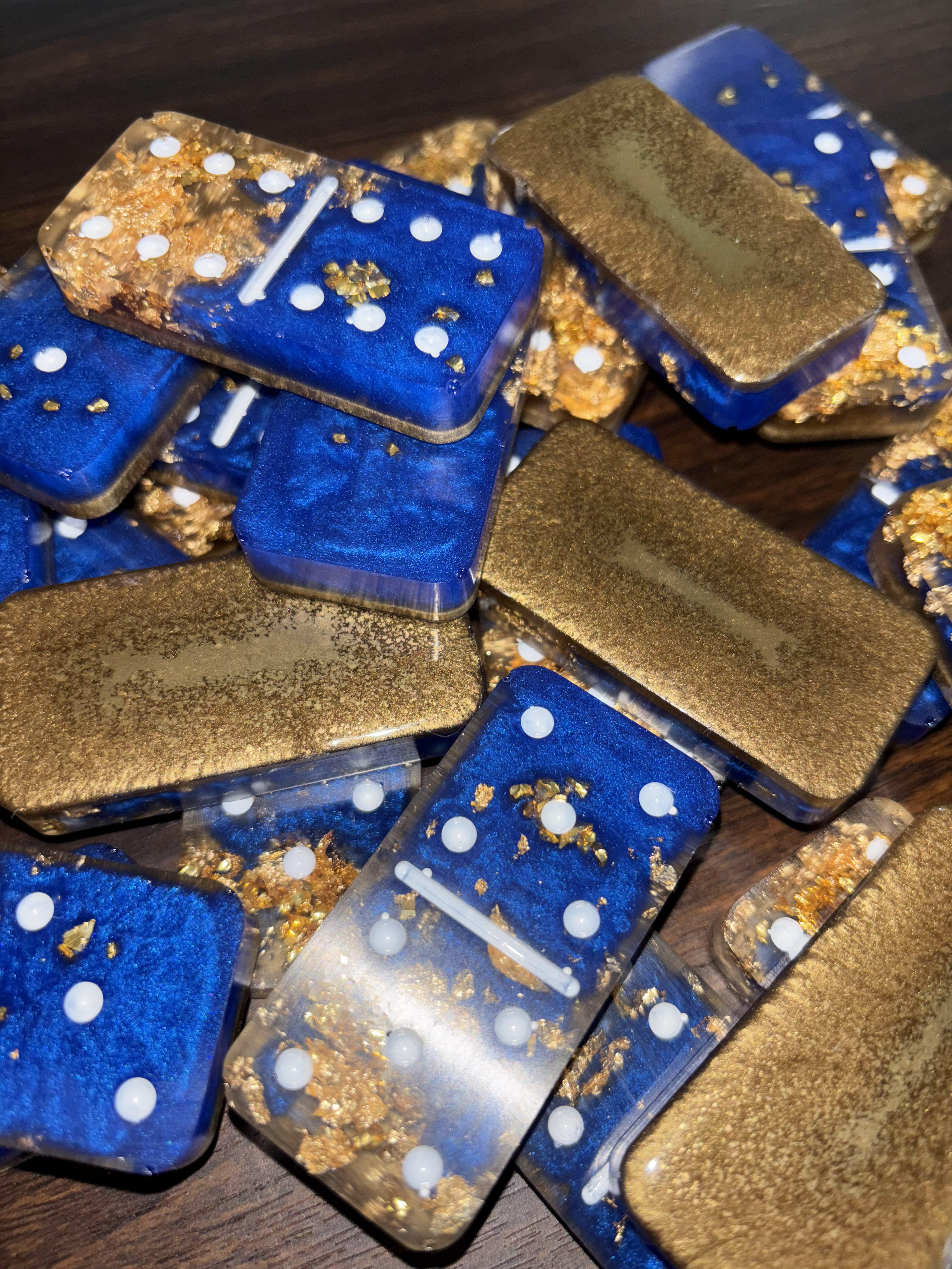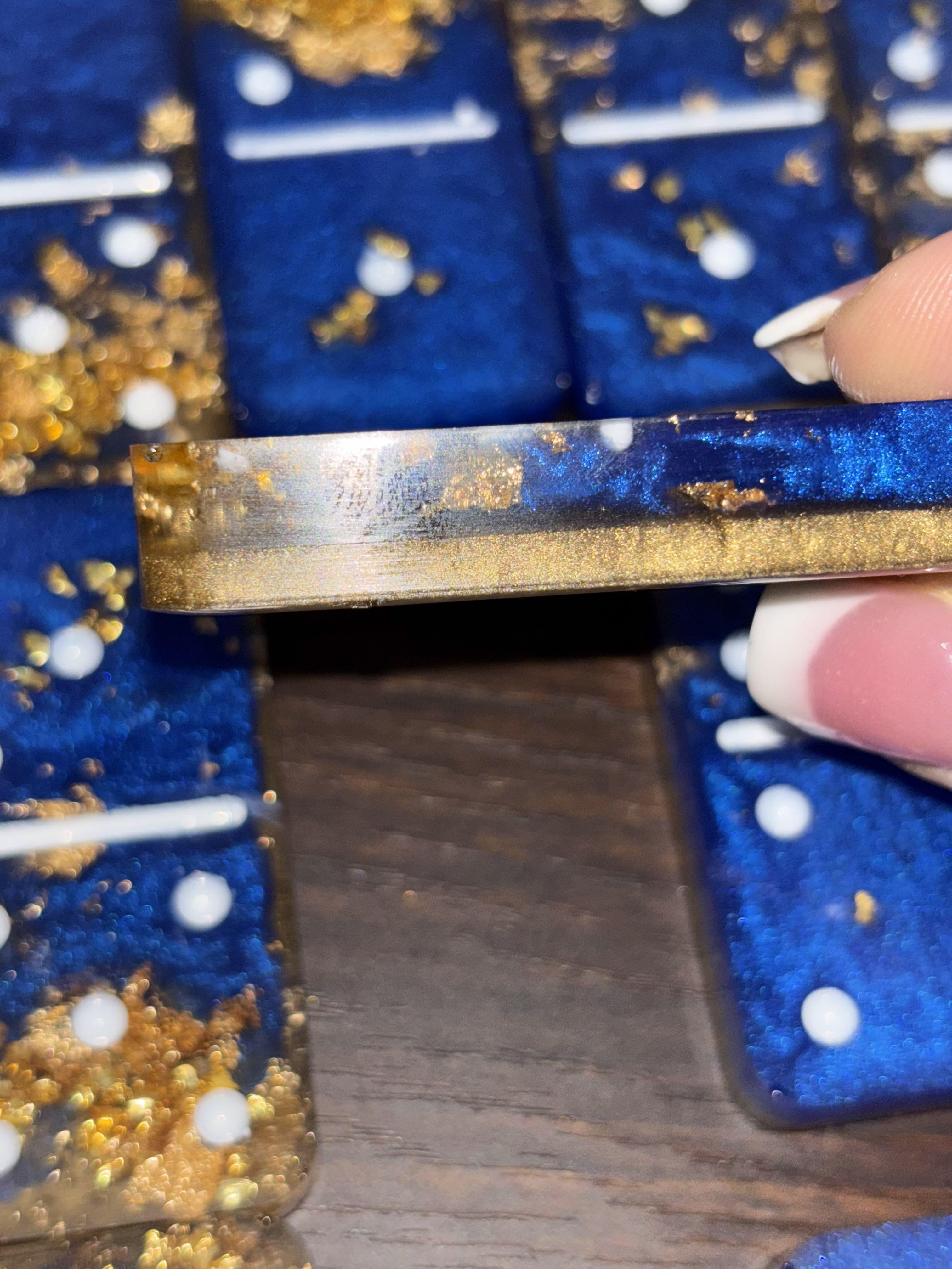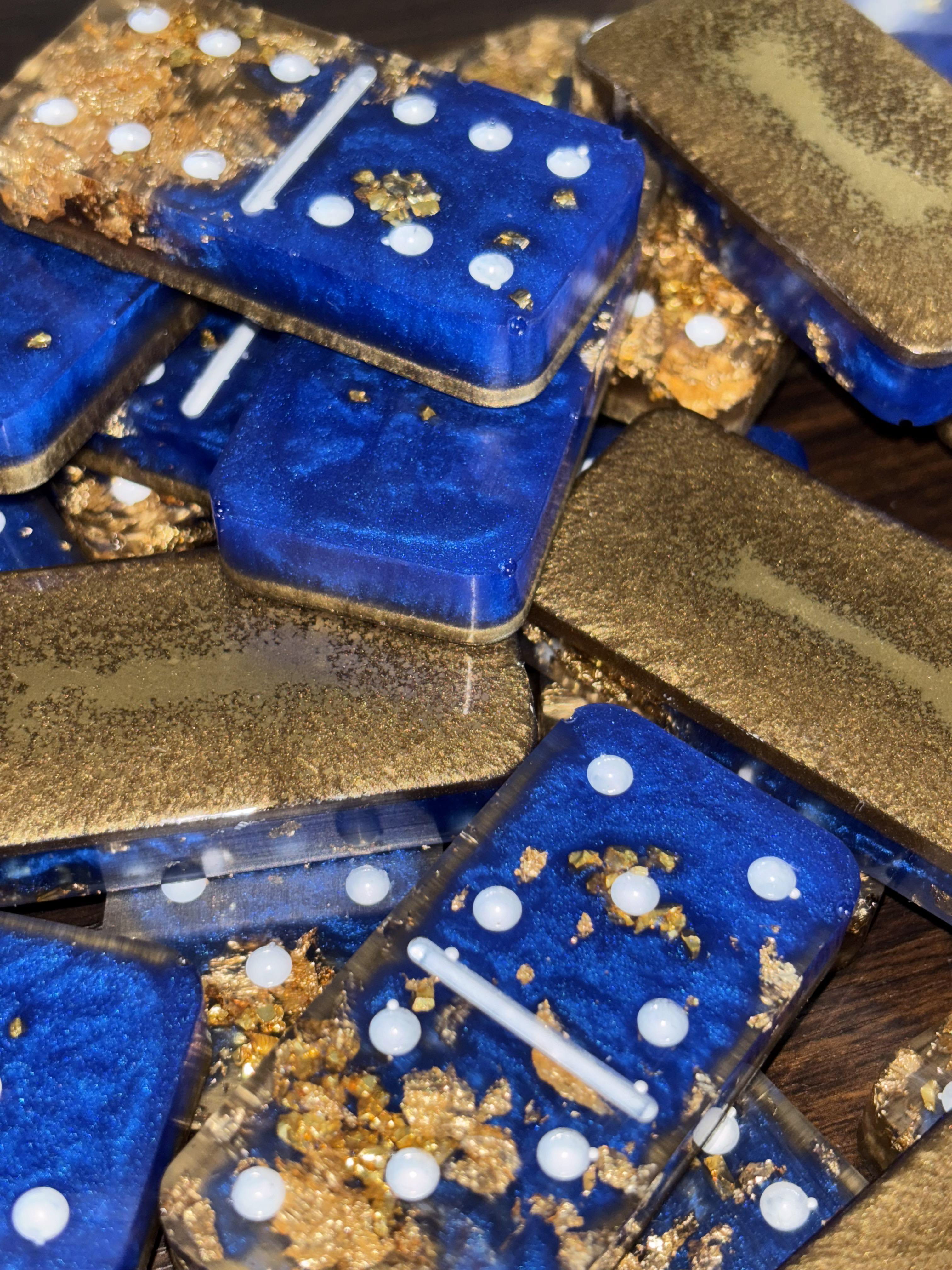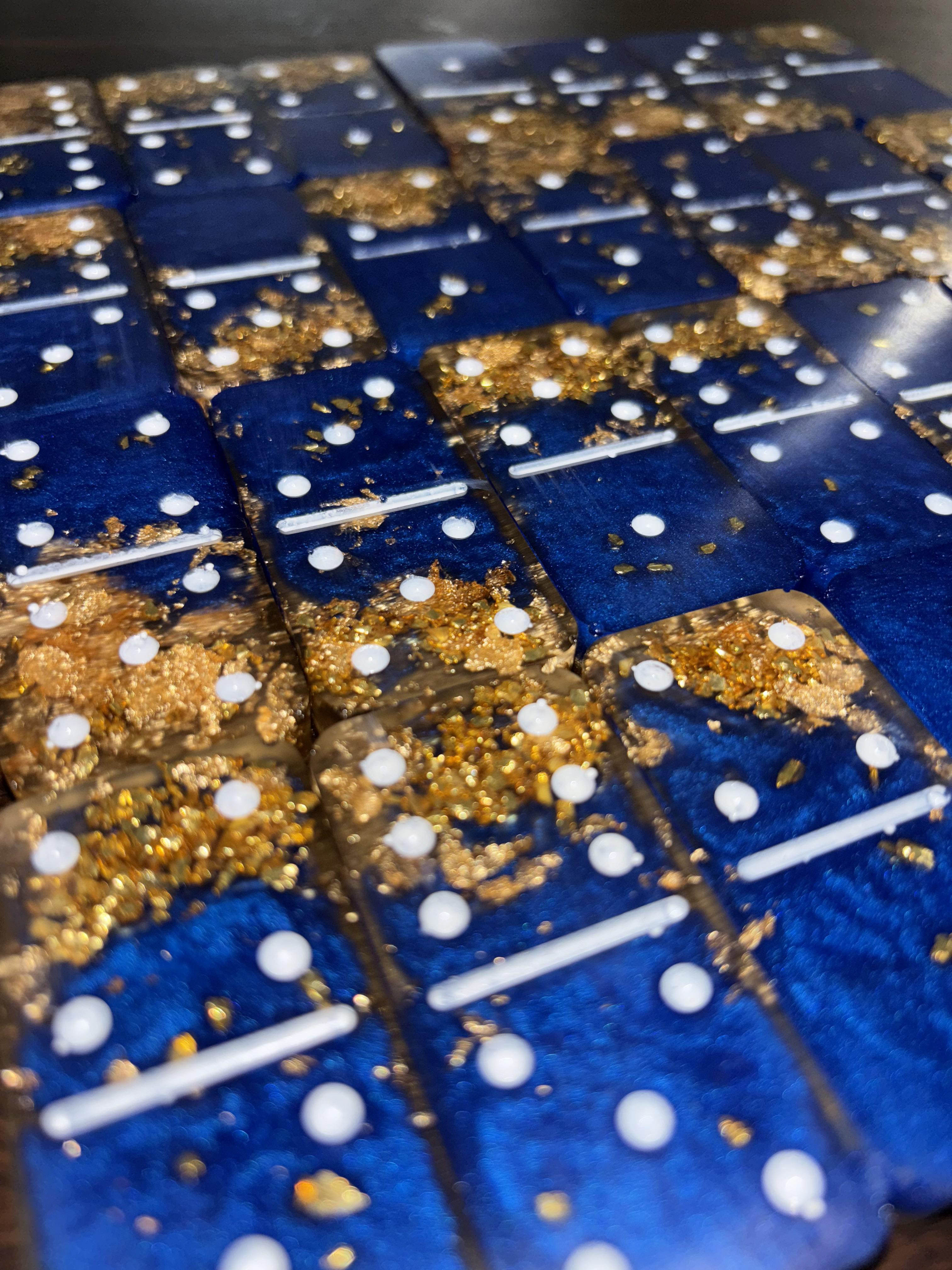 Upgrade your game night with this handmade Extra Large Resin Domino Set, designed in a rich deep blue mica shimmer and accented with real gold leaf and gold nuggets. Each piece in this Double-6 (28-piece) resin domino set is poured, sanded, detailed, and finished by hand — making every set completely unique.