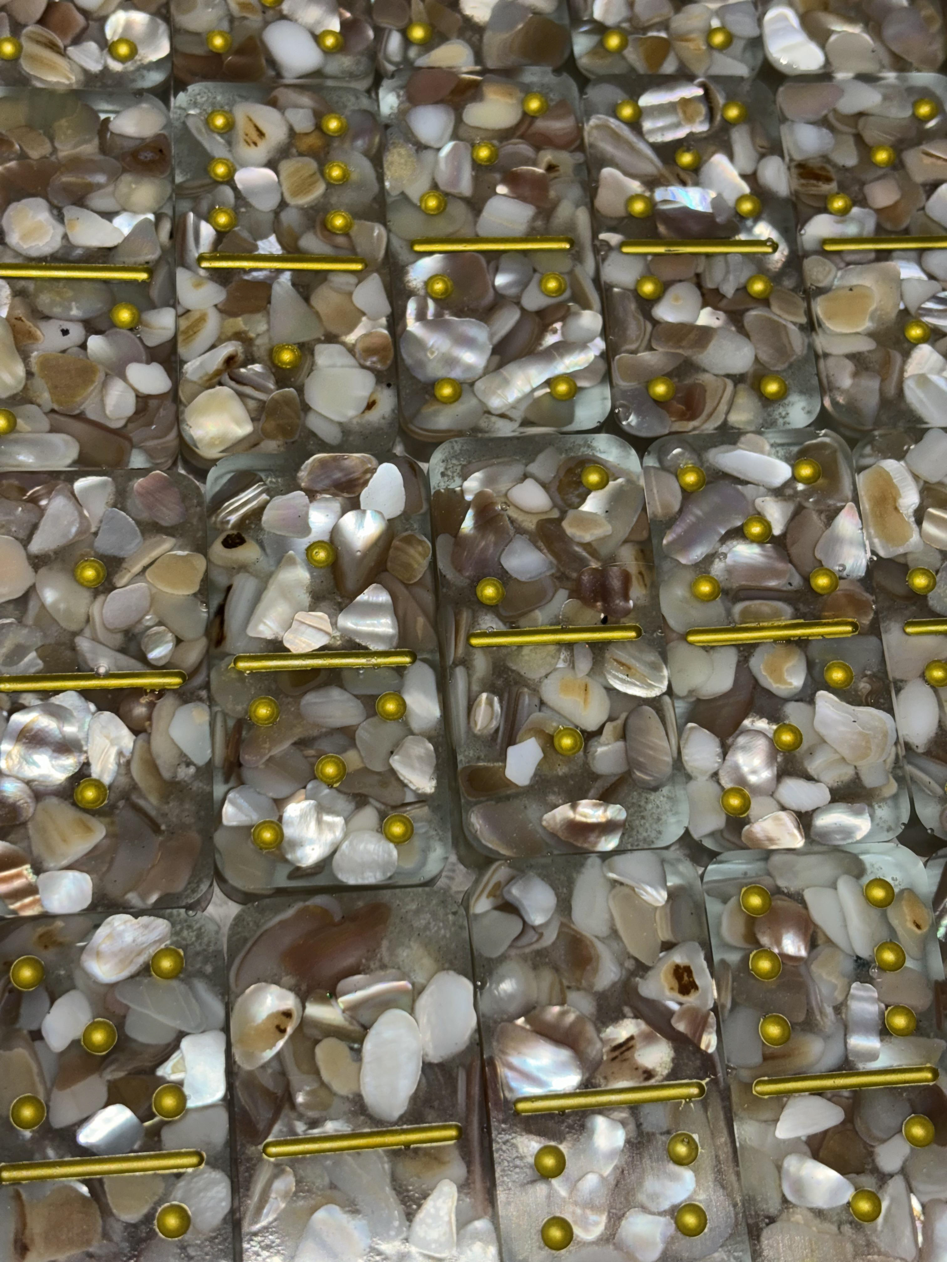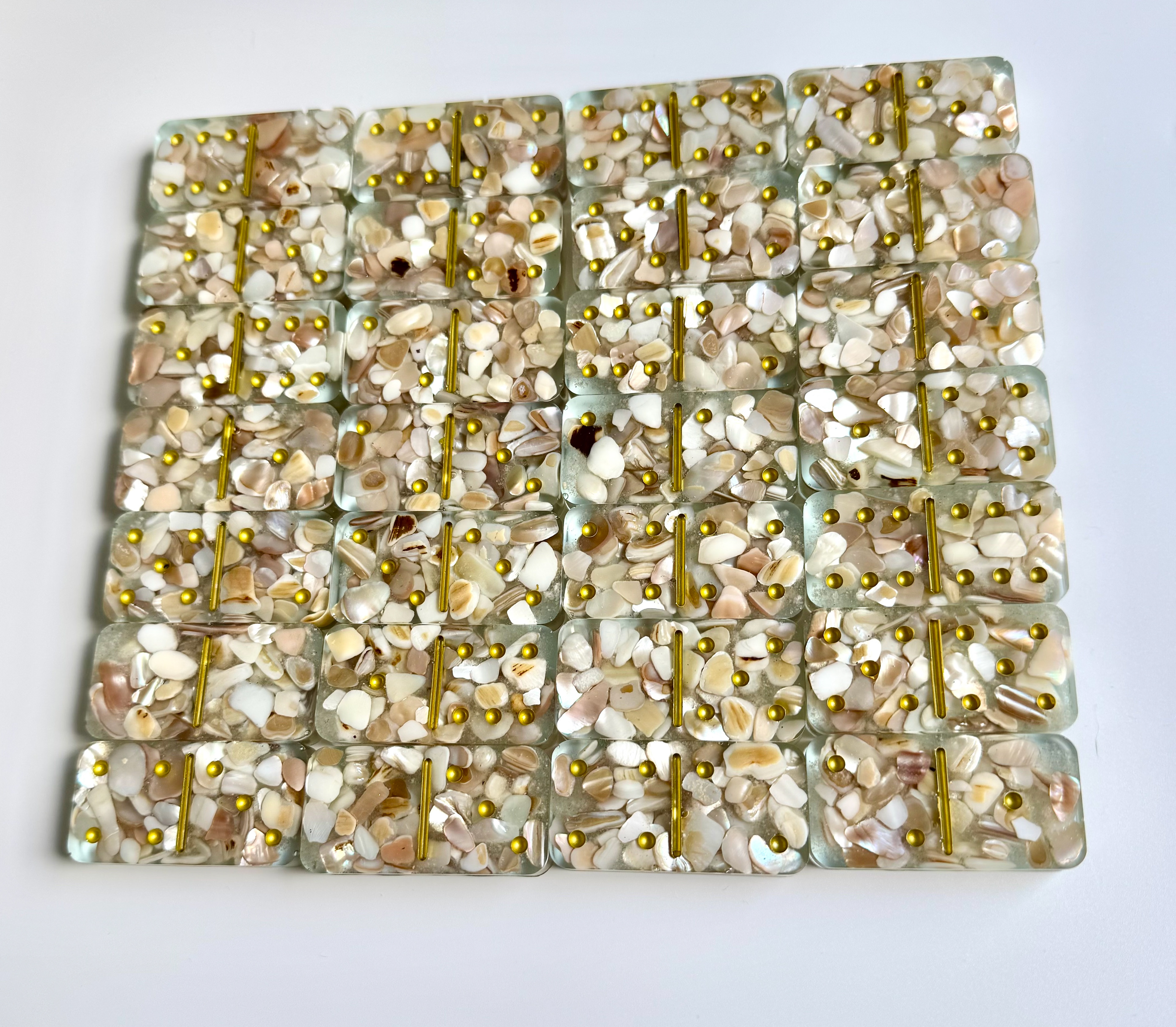 Play in style with this extra large handmade double-6 domino set, crafted with real seashells, shimmering gold accents, and clear resin. Perfect for both game nights and as a stunning display piece, these dominoes are as functional as they are artistic.