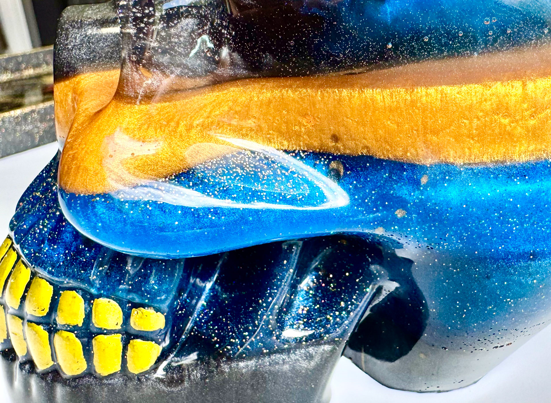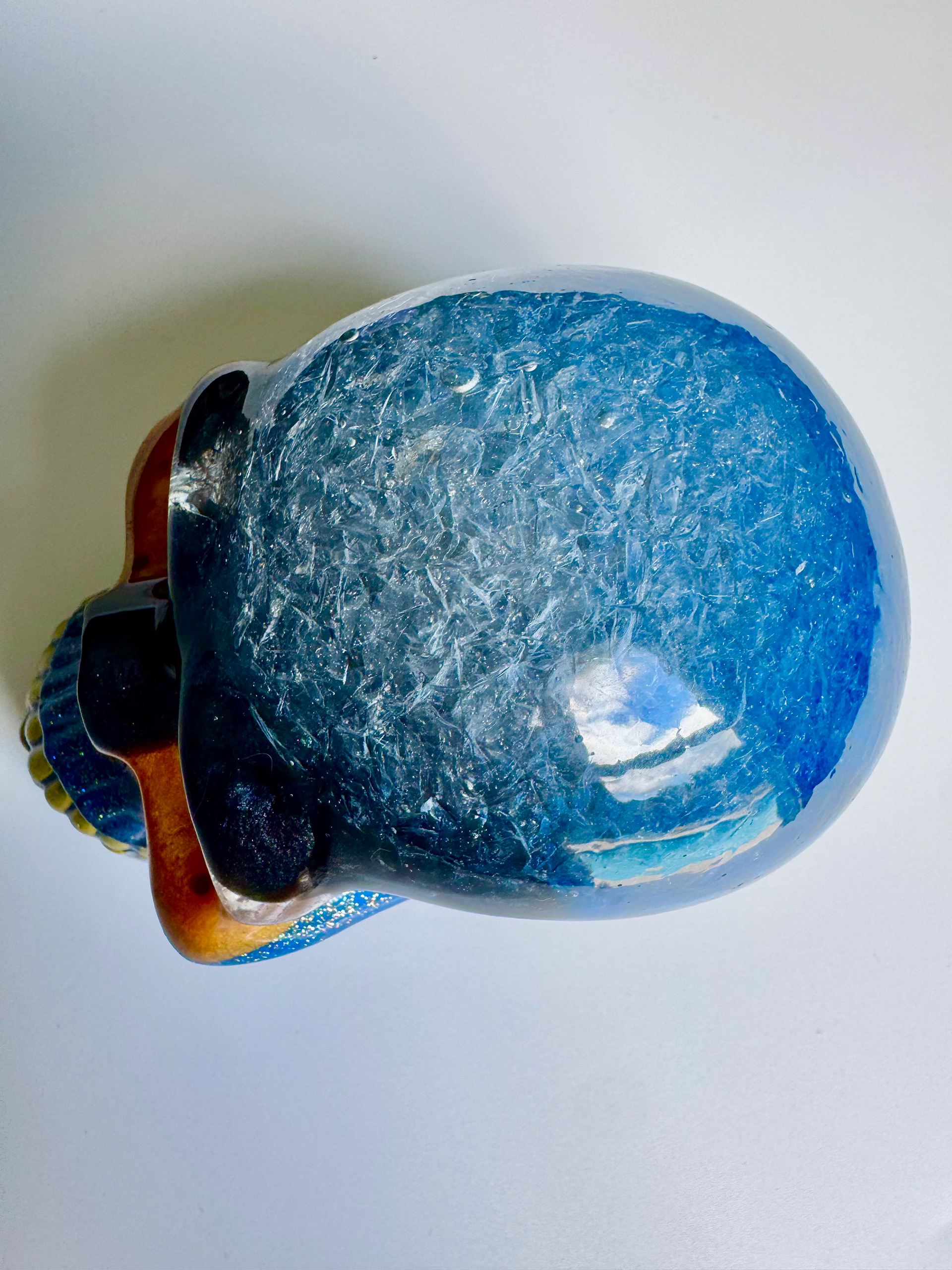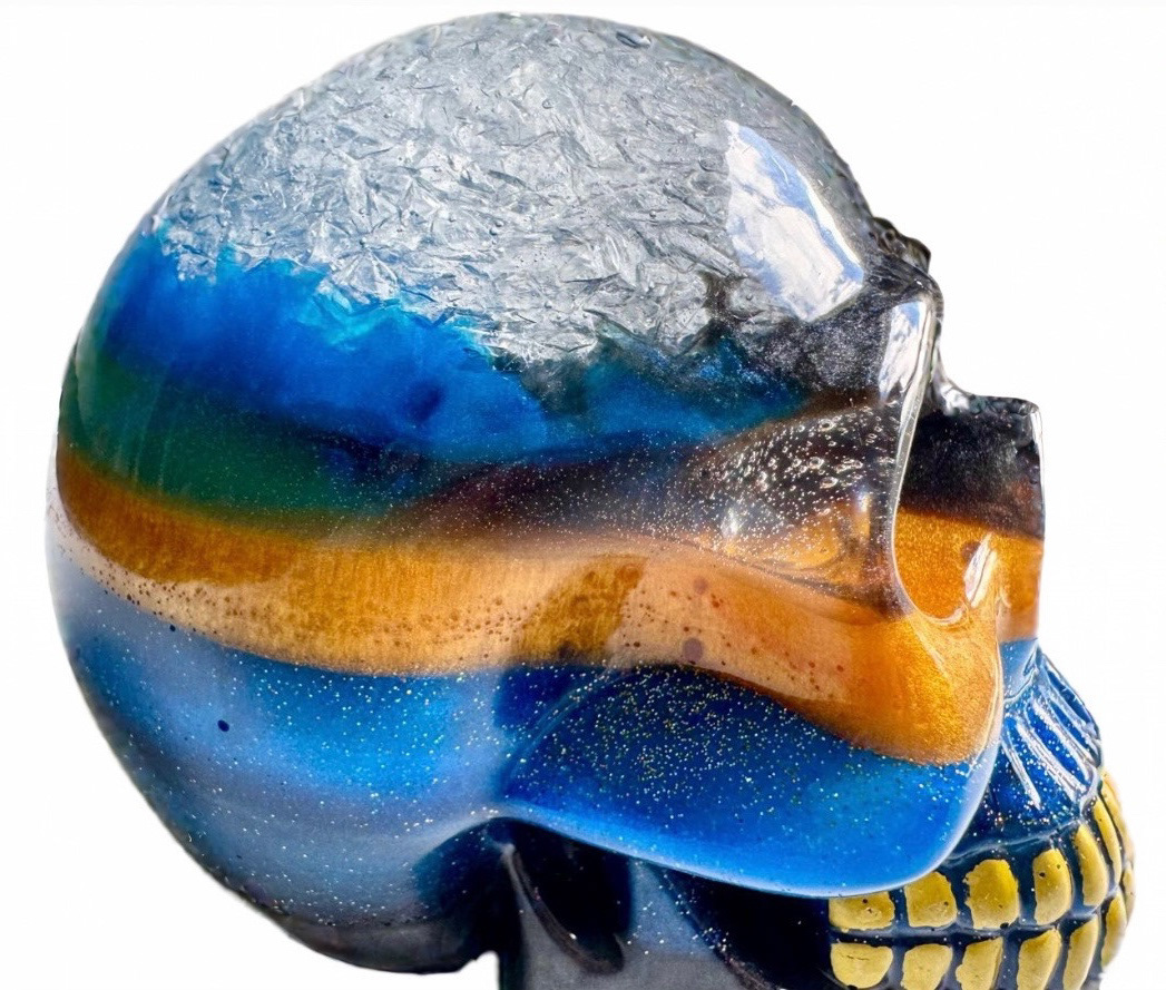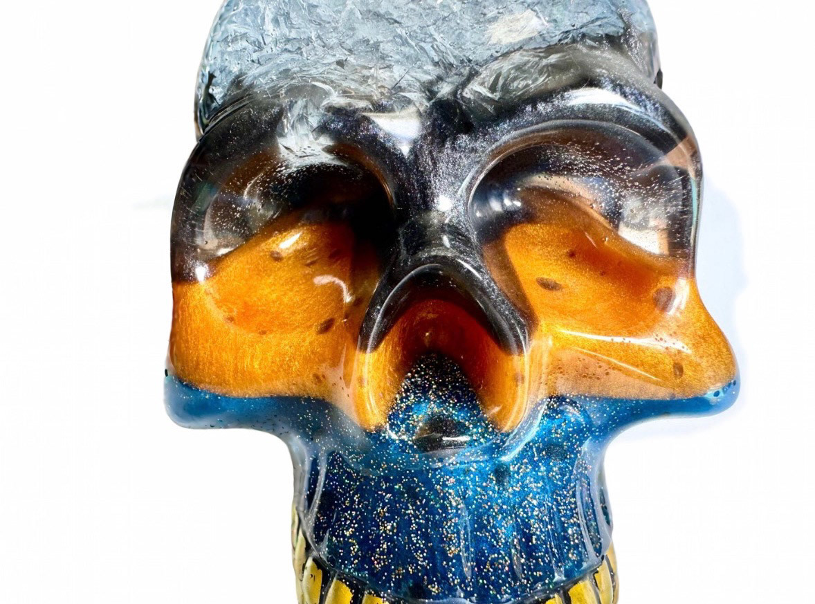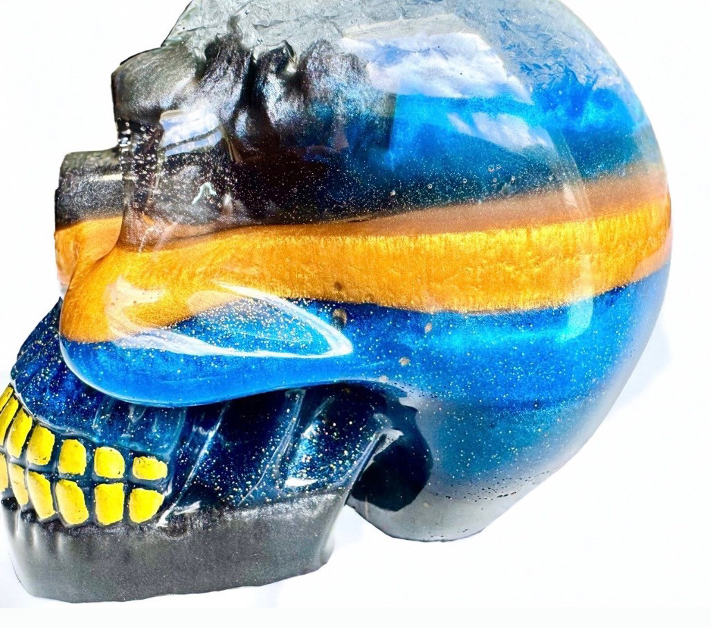 Bring bold, eerie vibes into your home with this extra large handcrafted resin skull sculpture. Perfect for Halloween decorating, gothic home décor, altar displays, or year-round statement art, this one-of-a-kind skull features mesmerizing swirls of deep blue, fiery amber, shimmering gold, and glitter accents.
