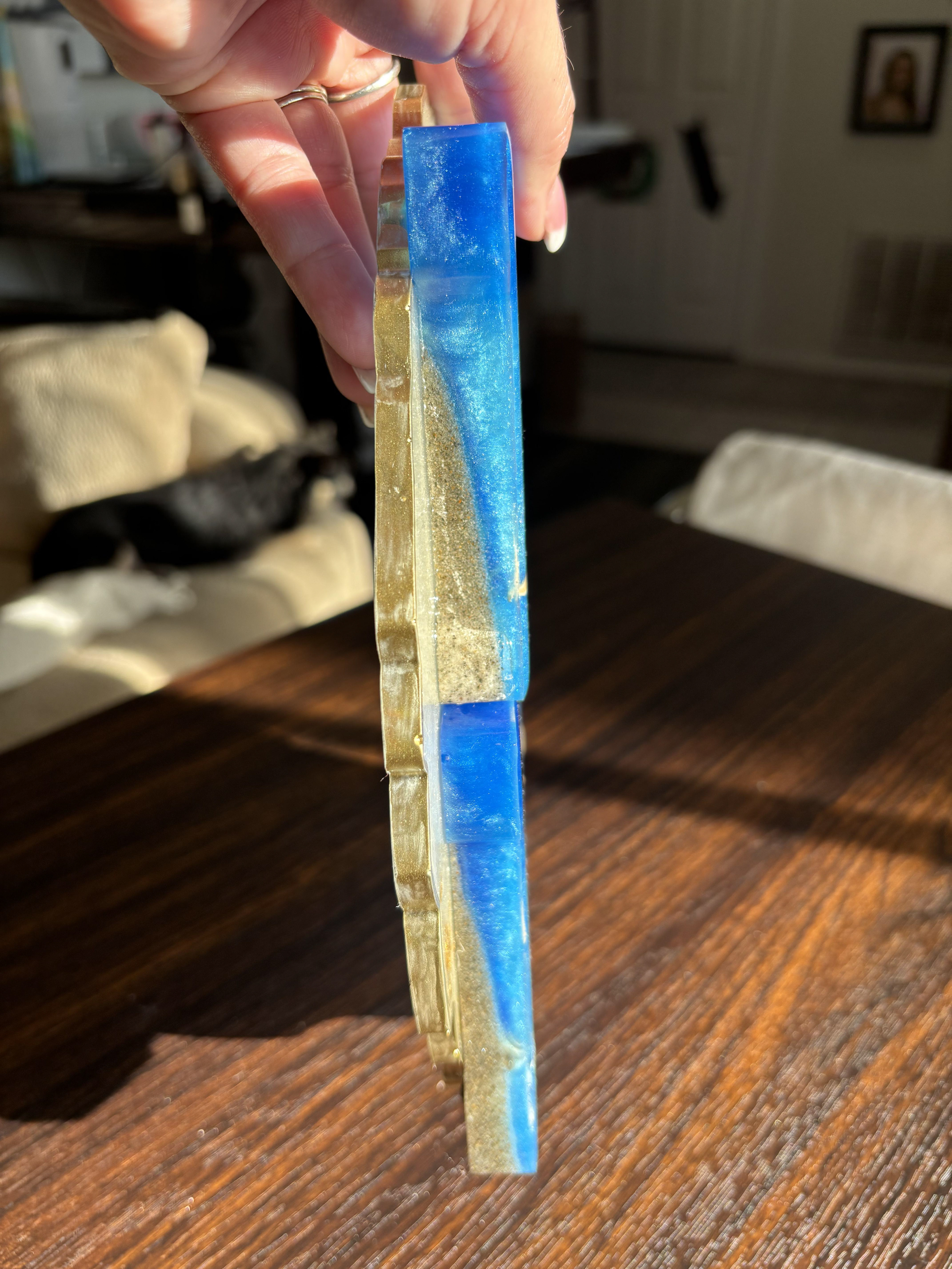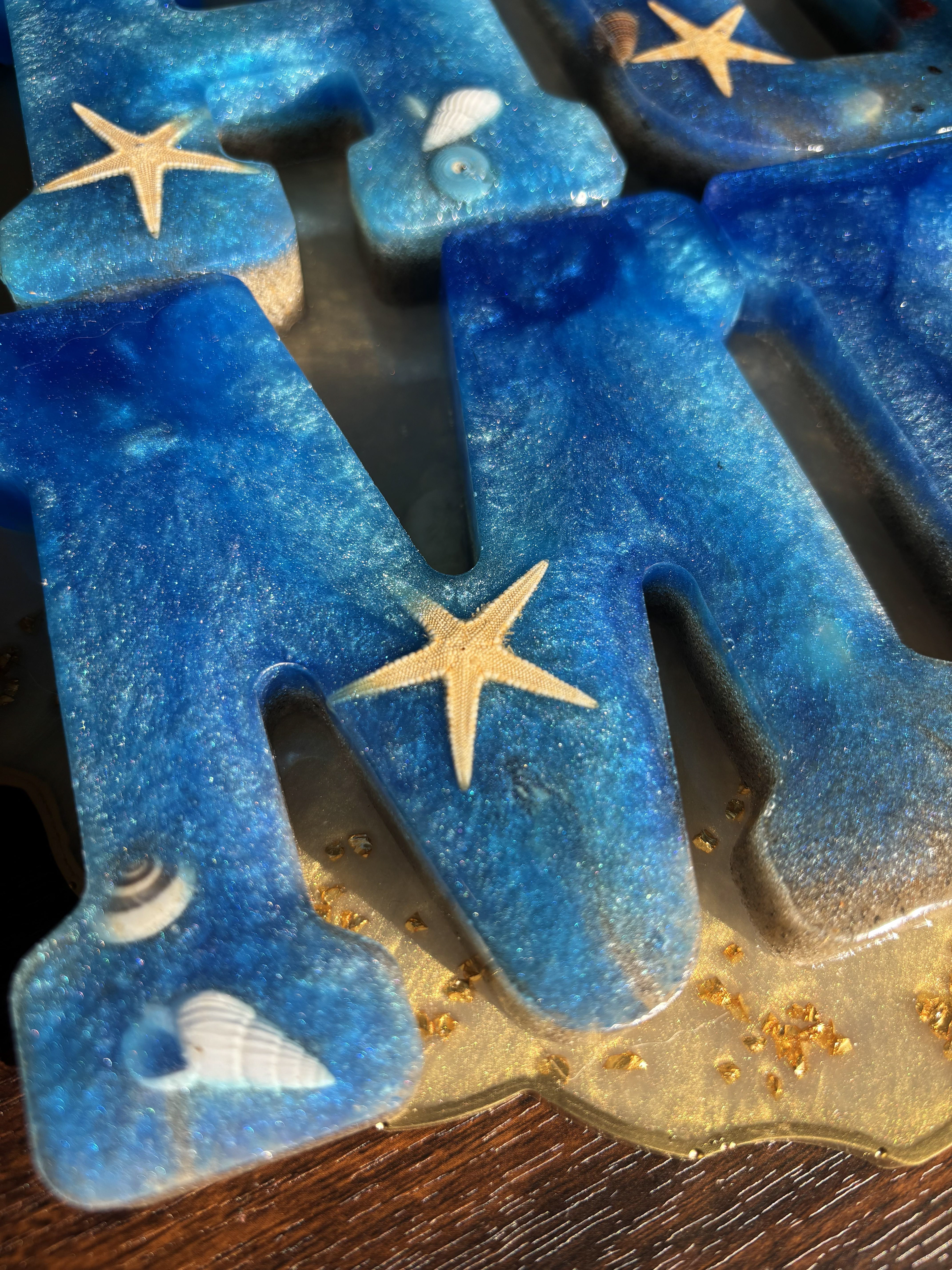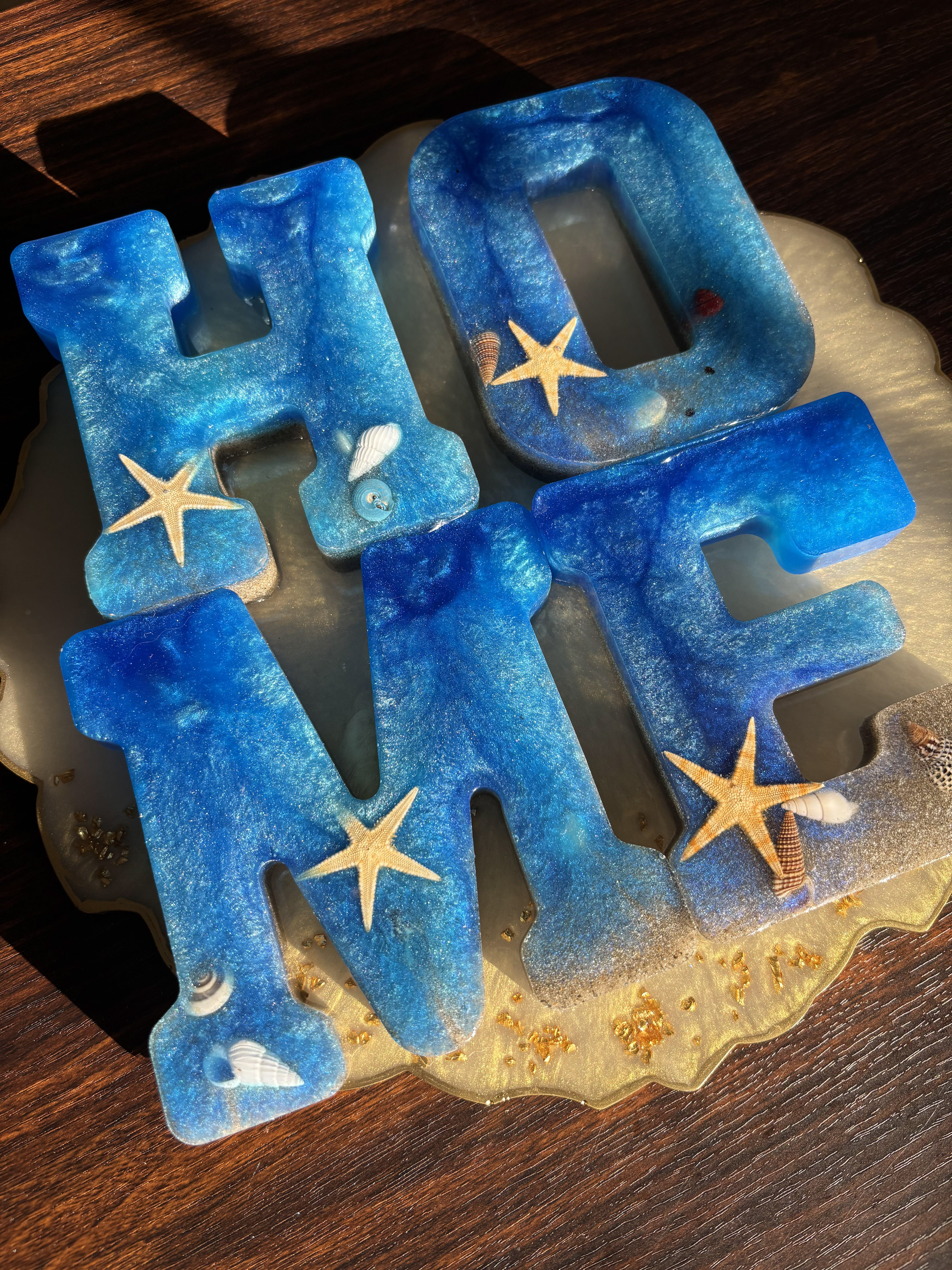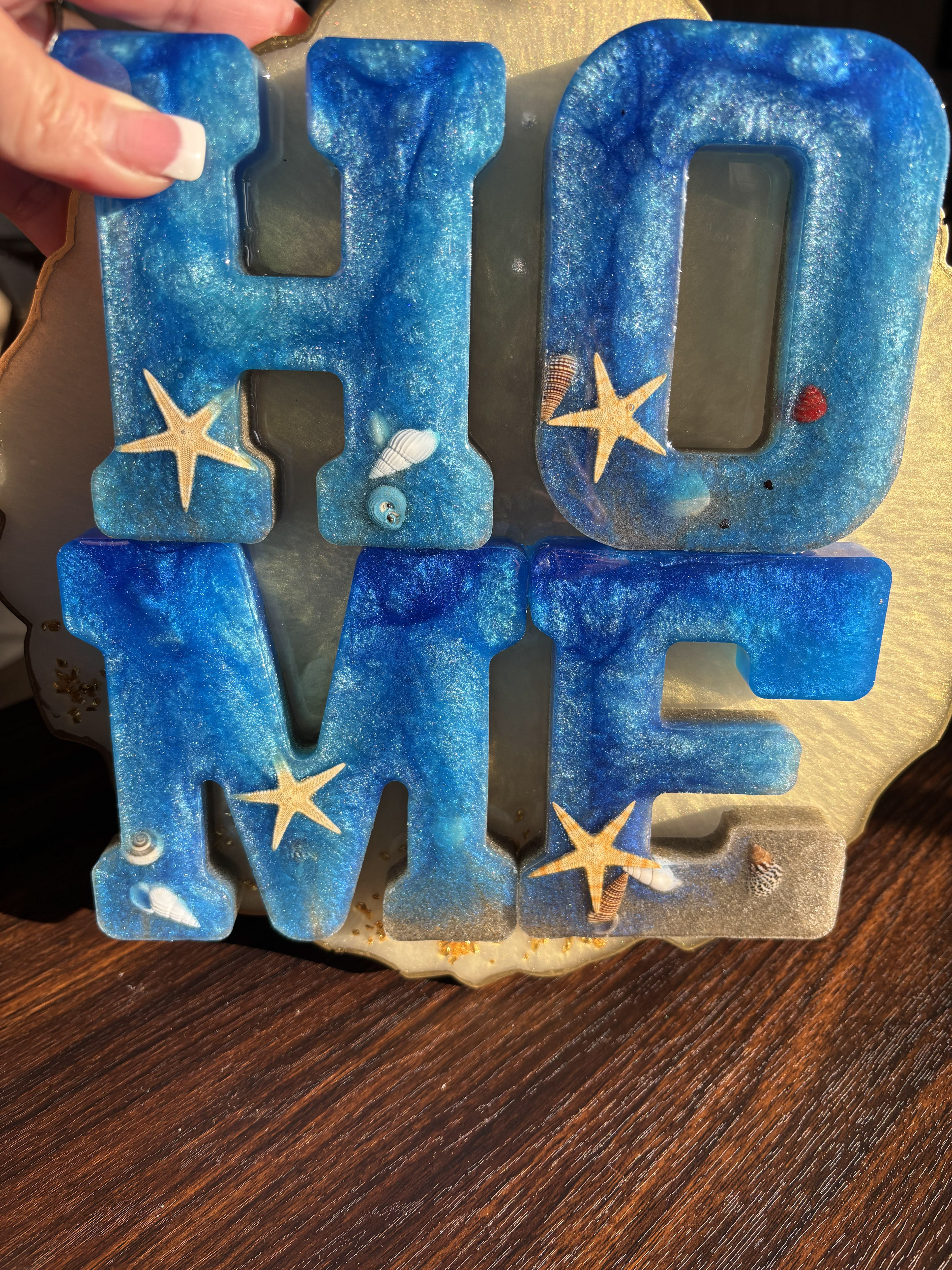 Bring the beauty of the coast into your home with this handcrafted Resin HOME Wall Sign, designed with ocean blues, shimmering waves, real starfish, and seashell accents. Each letter is carefully poured by hand using premium resin, creating a glossy, ocean-inspired finish that looks like a miniature beach displayed on your wall.