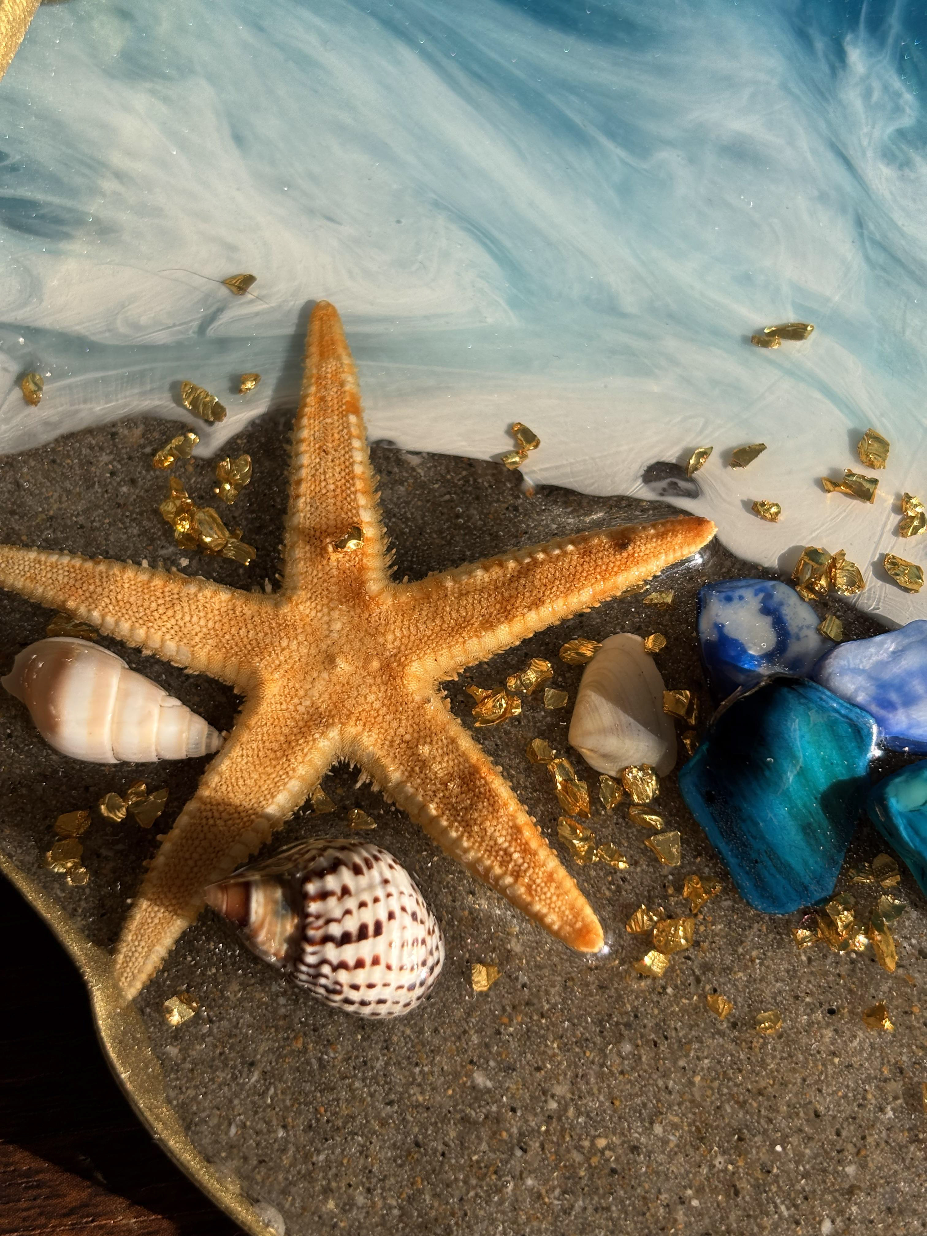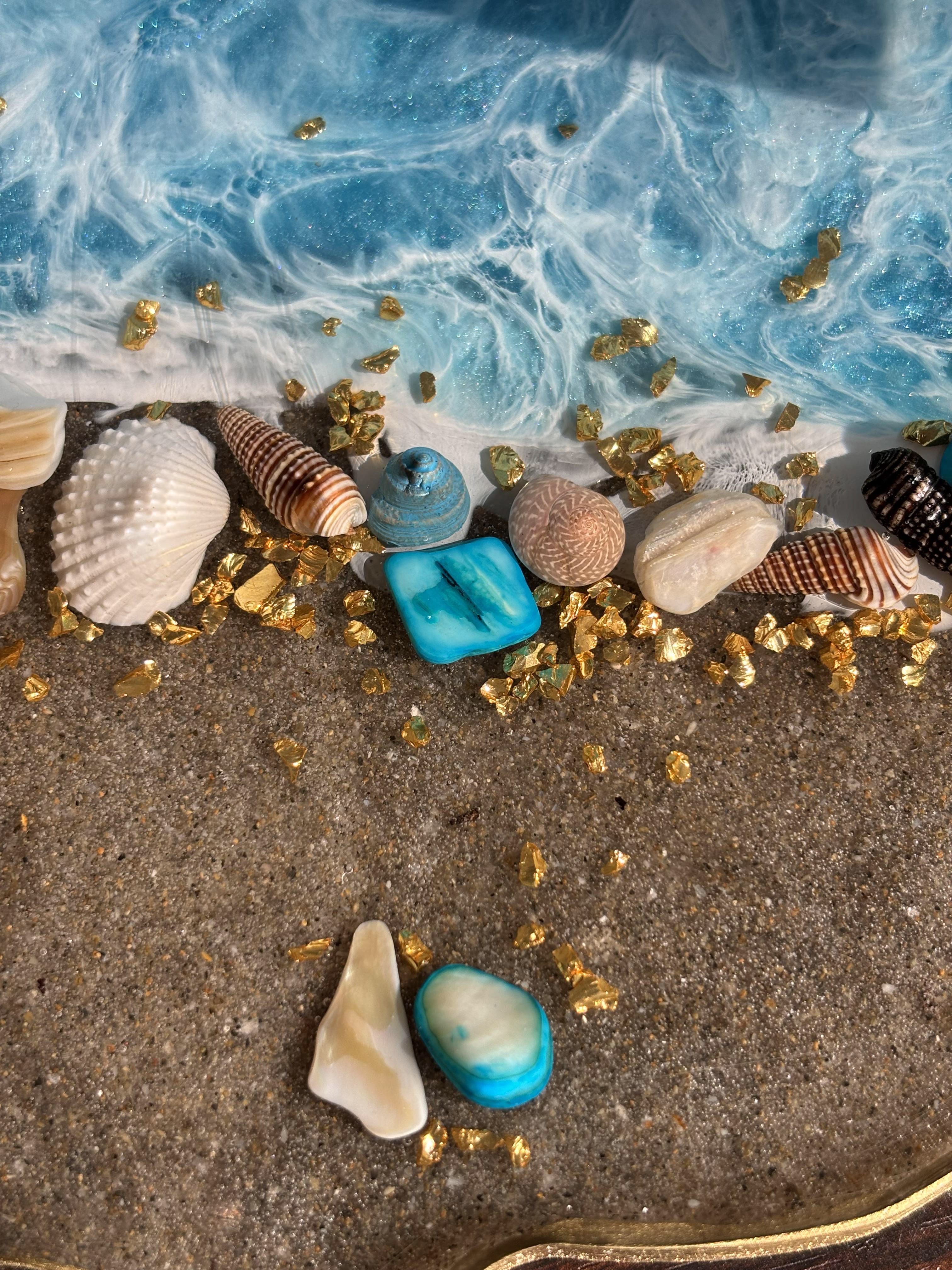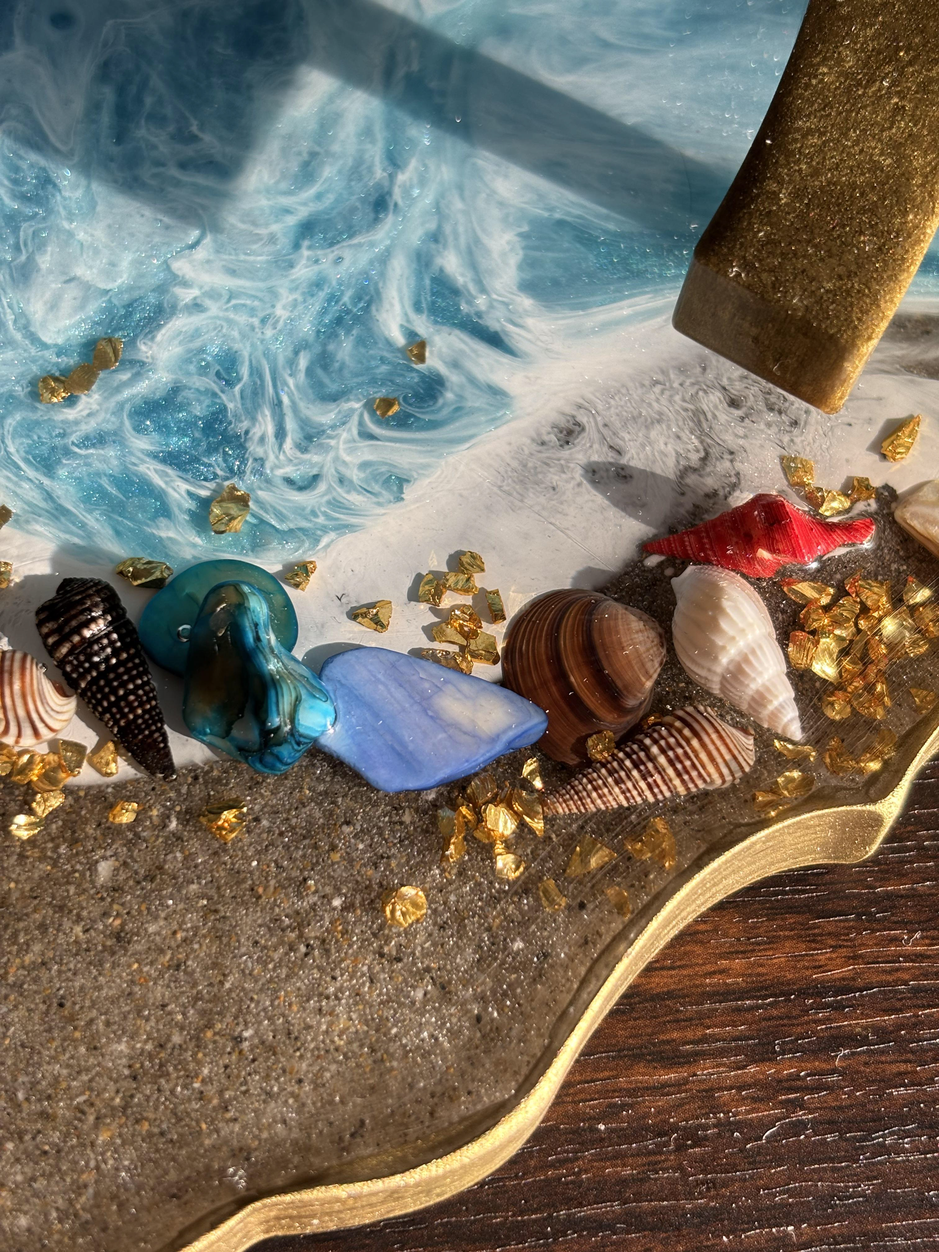 Large 13” x 13” Ocean Resin Tray – Real Shells & Gold Nugget Accents and Handles