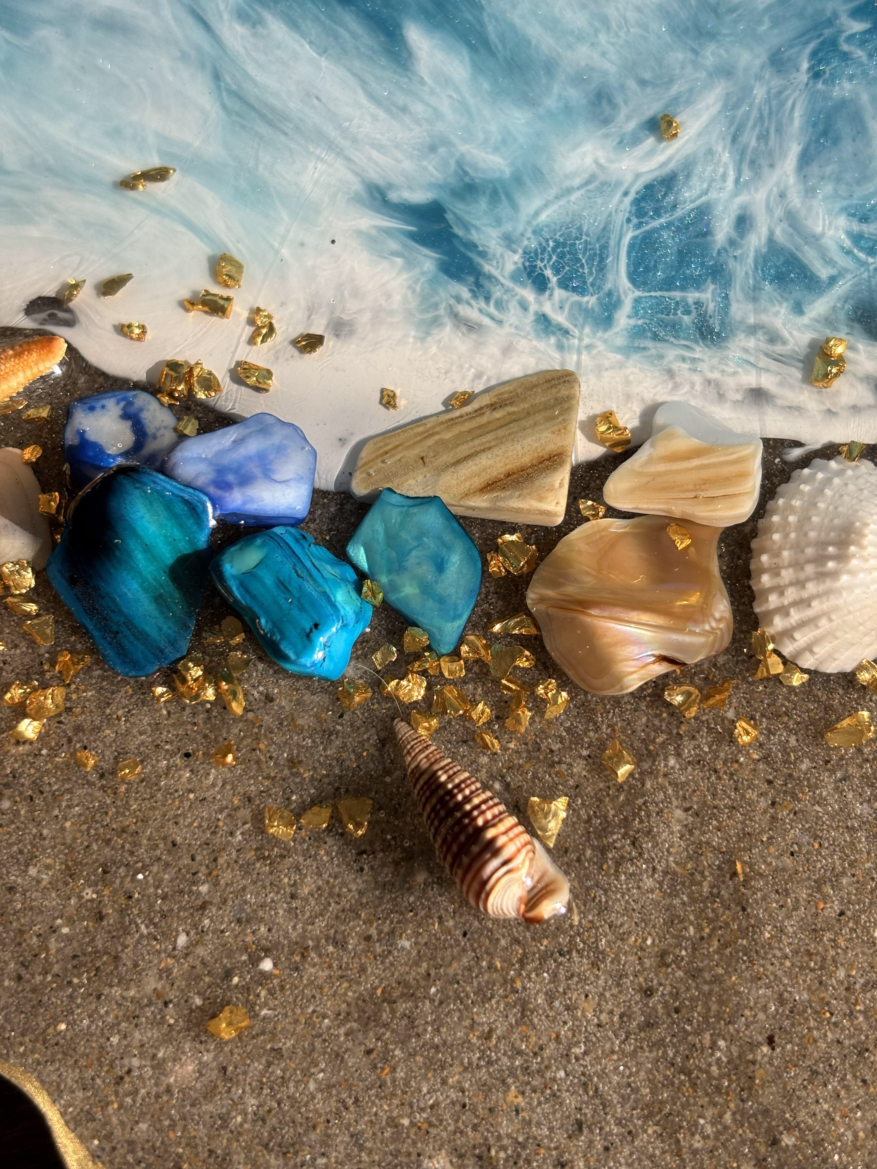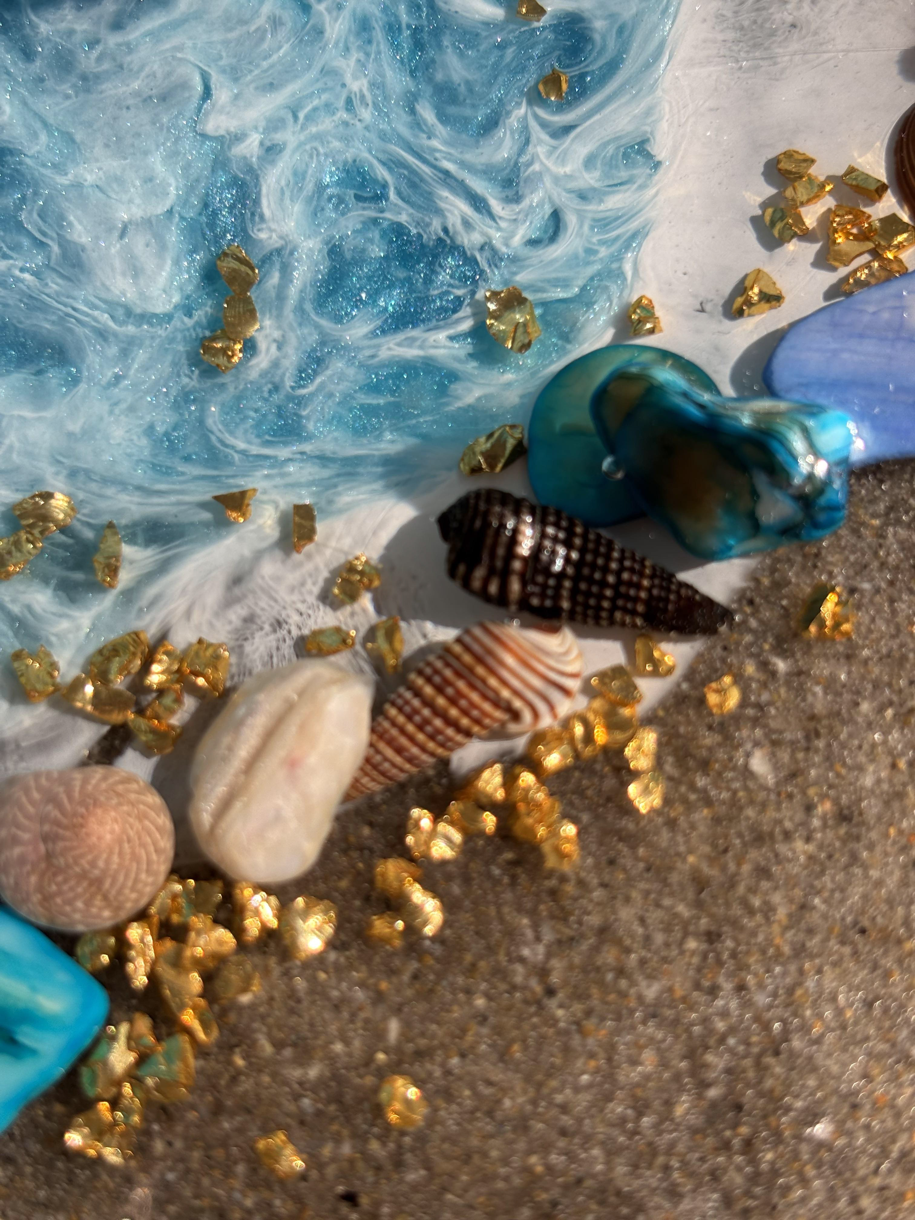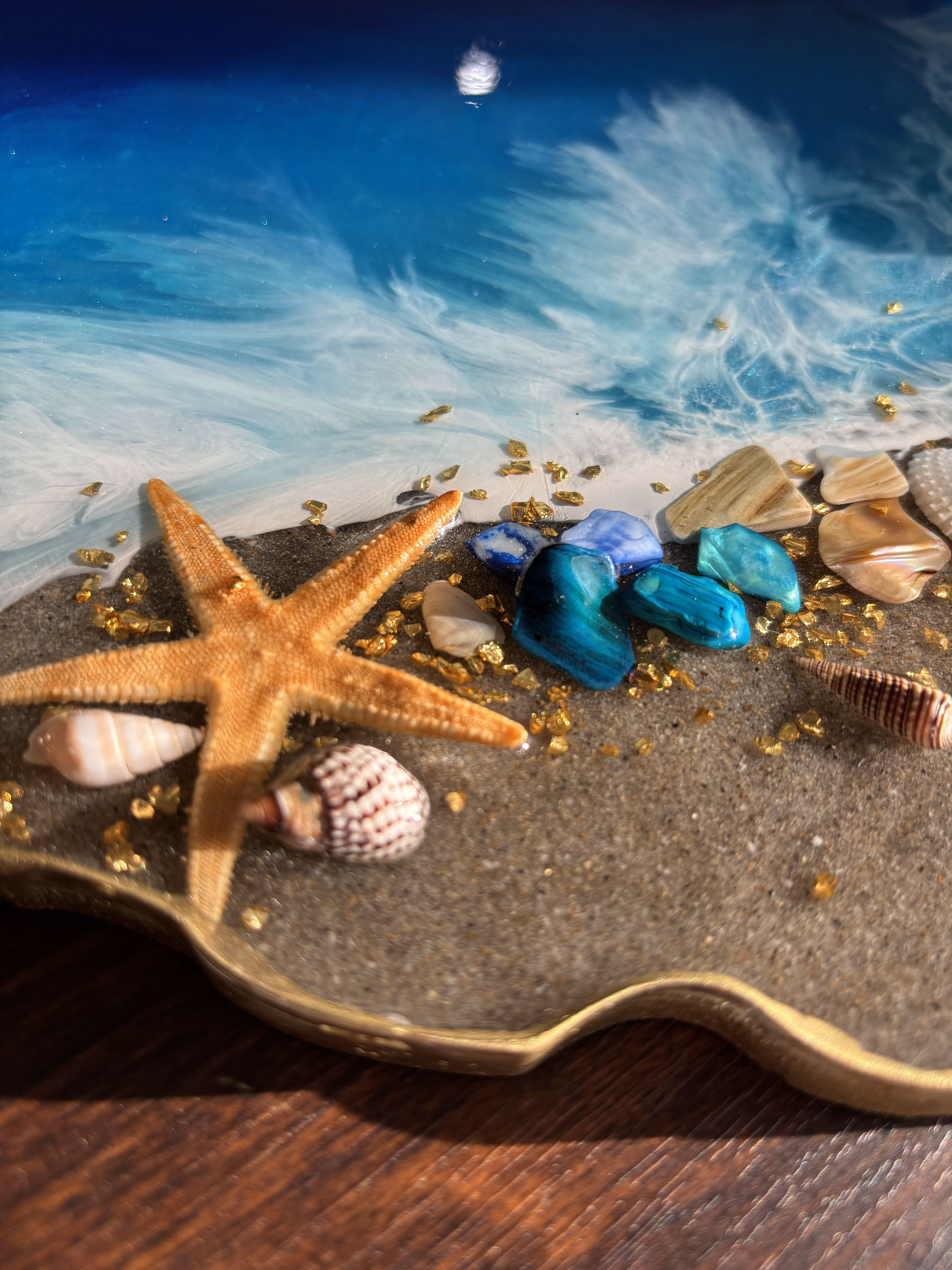 Bring the beauty of the shoreline into your home with this large handmade ocean resin tray, featuring layered blue waves, realistic shoreline texture, real seashells, and shimmering gold nugget accents.