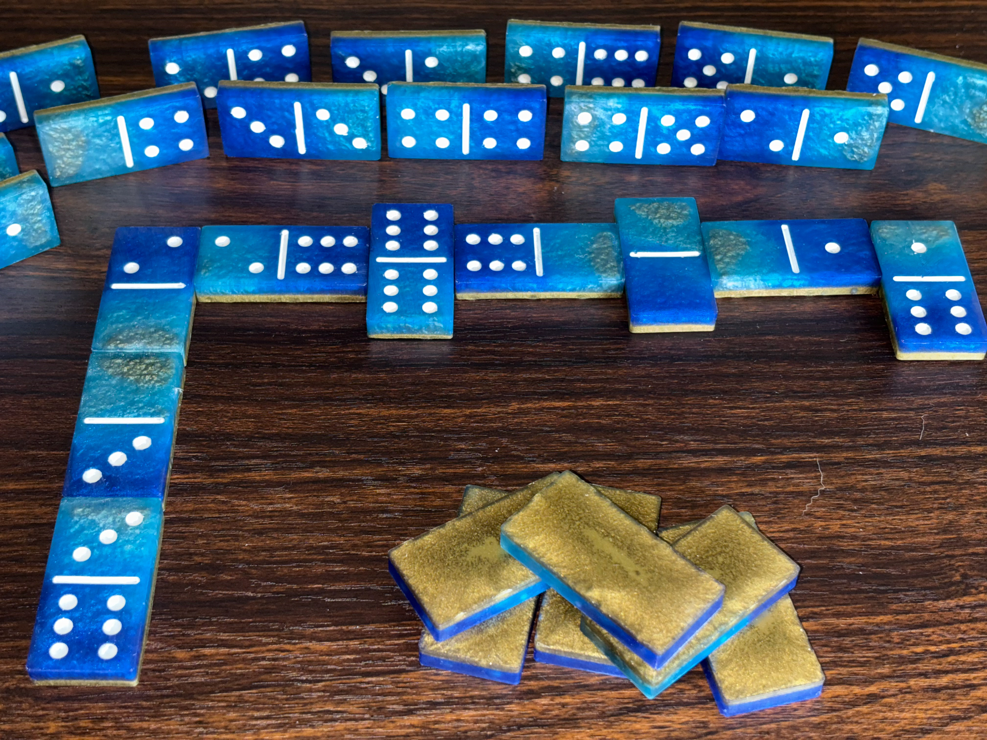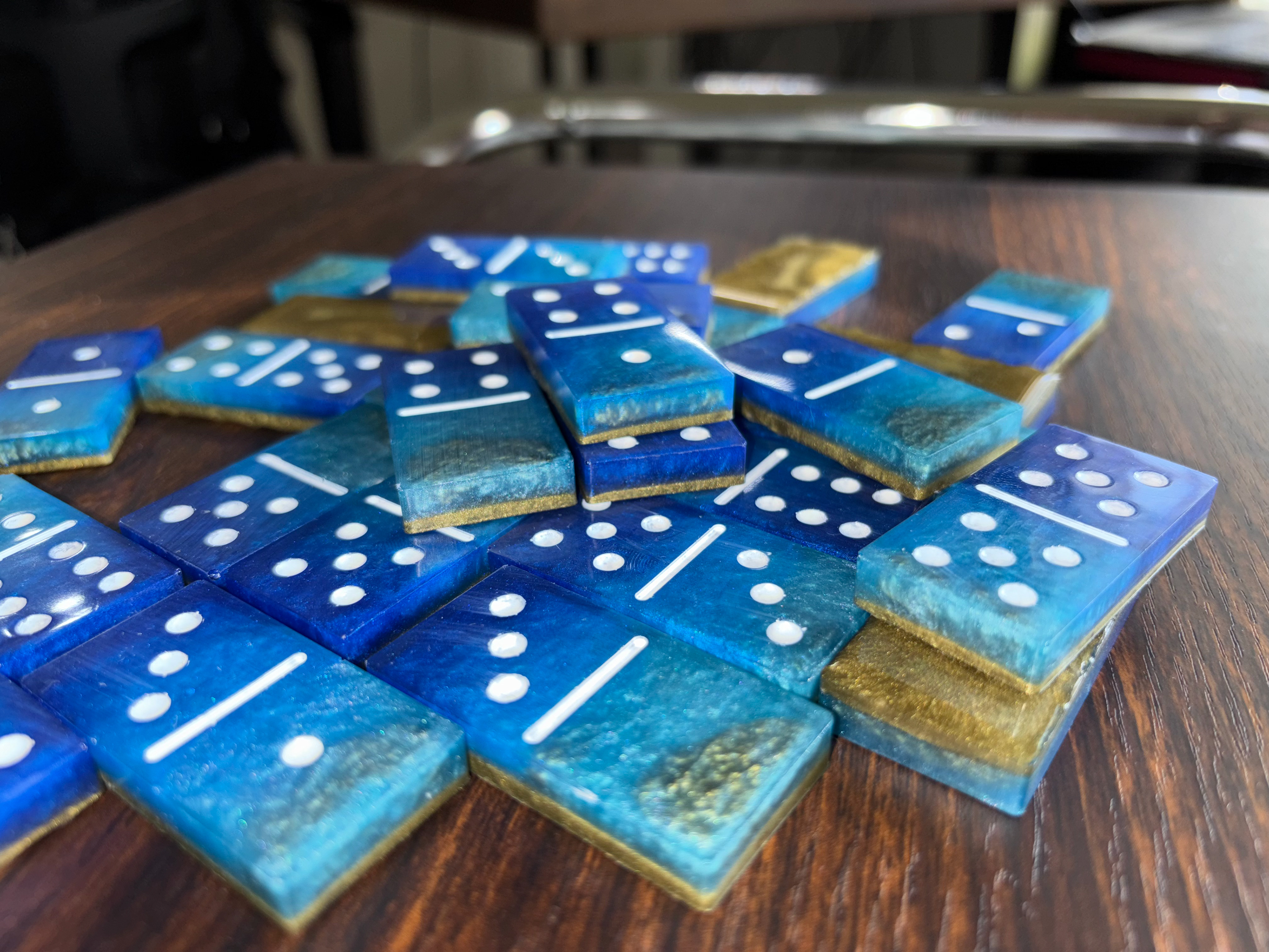 Handcrafted Blue Resin Domino Set With Gold Backing (Double-6)