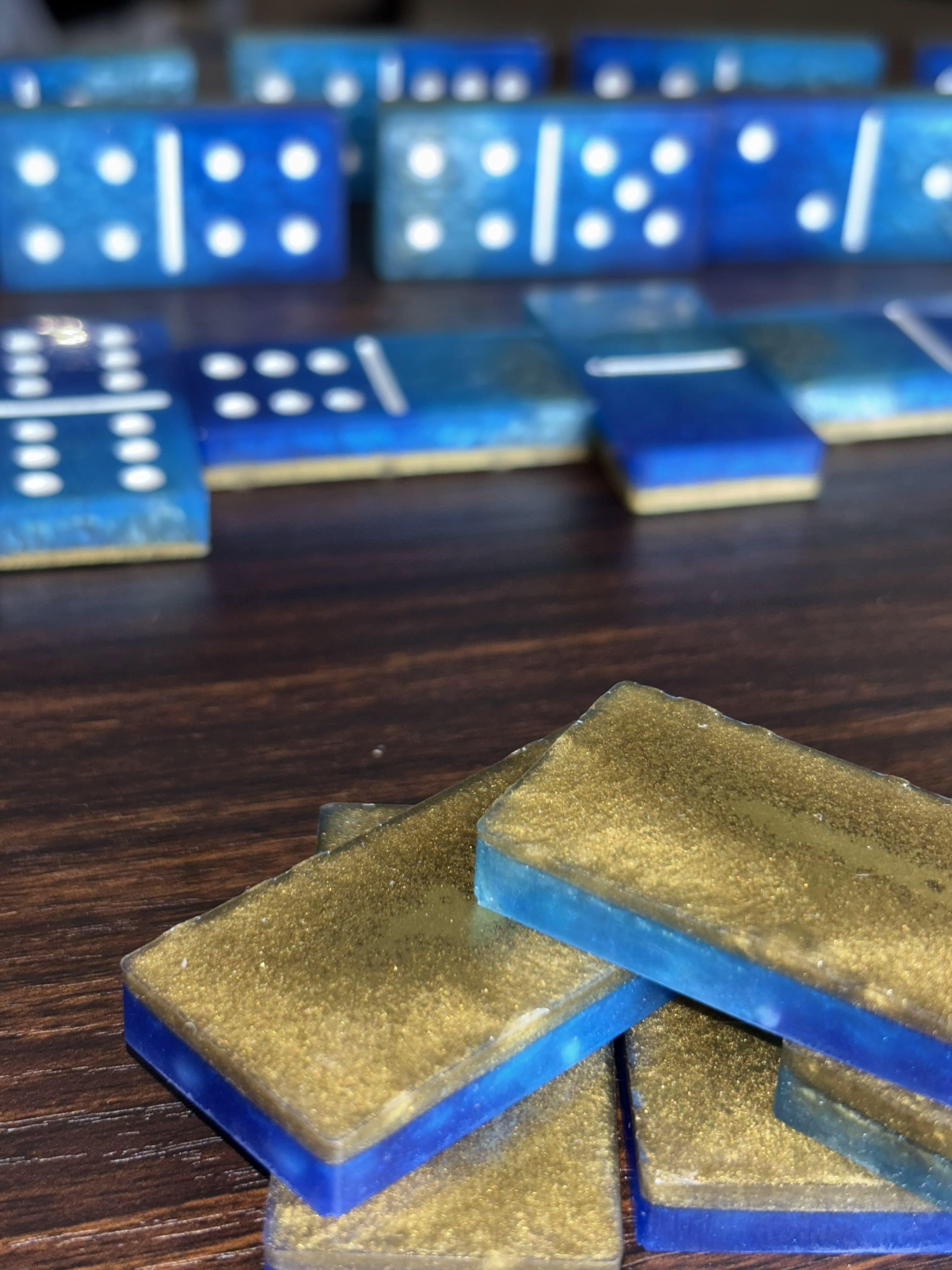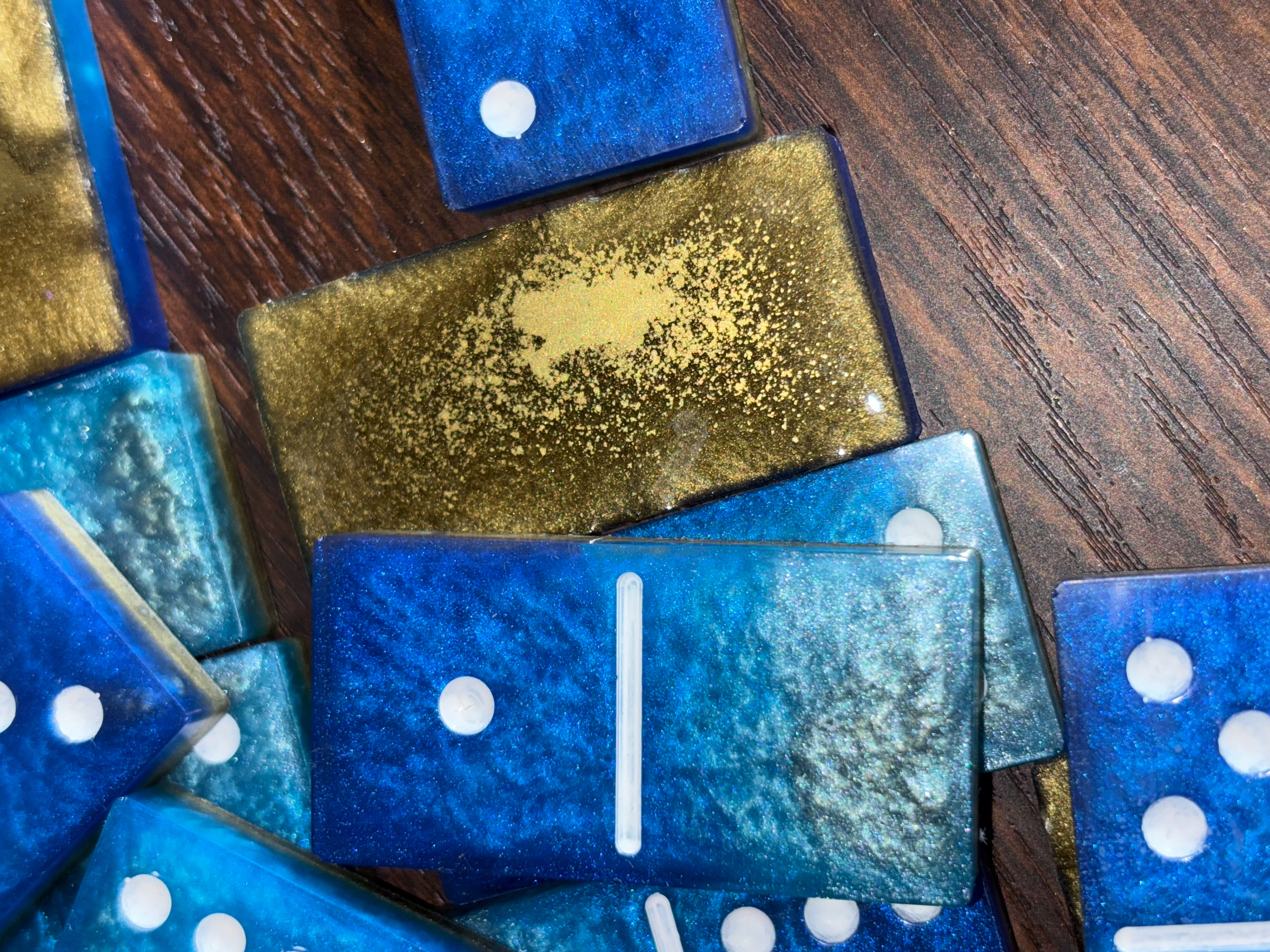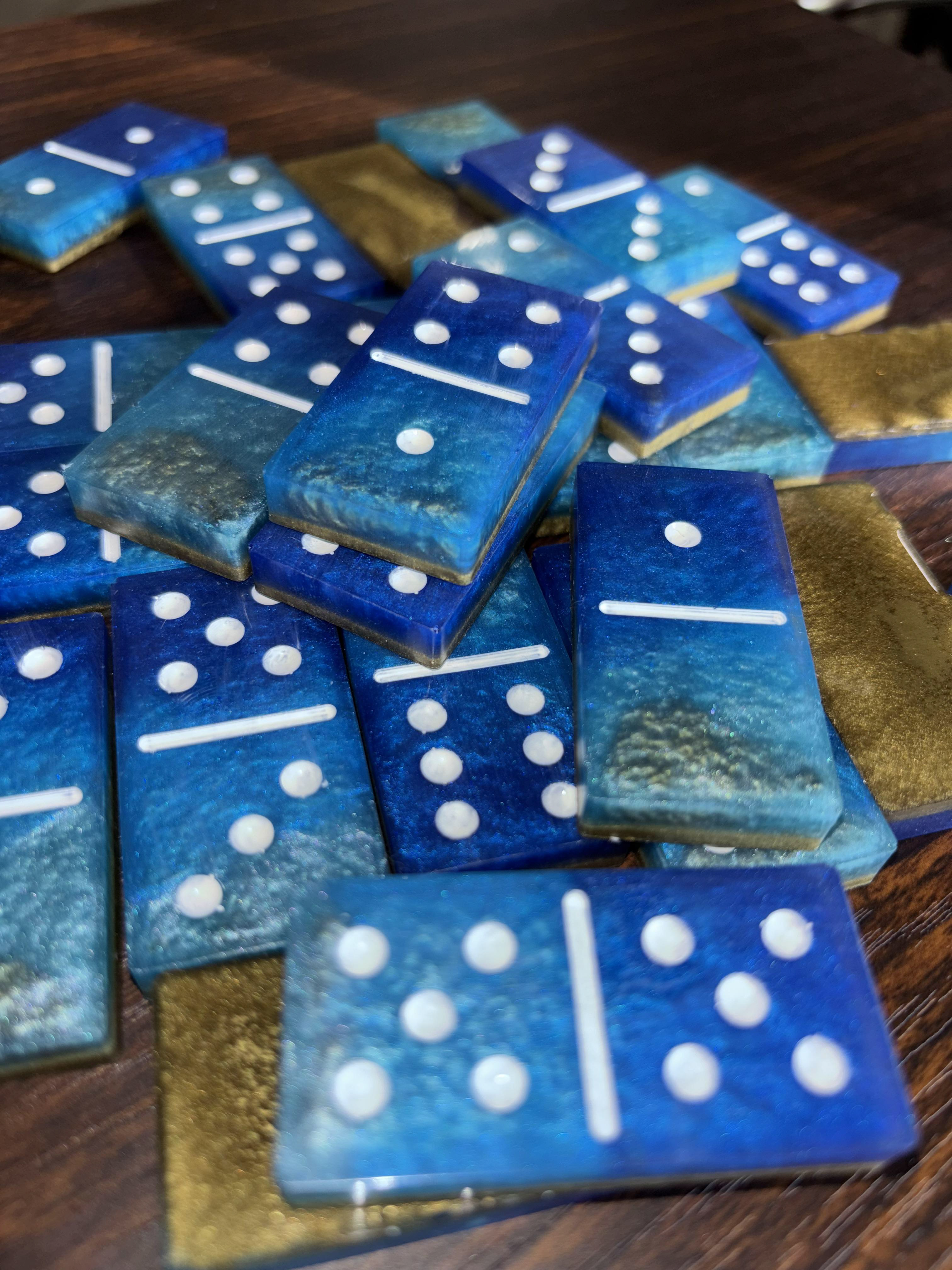 Bring luxury and coastal style to your game night with this handmade blue resin domino set, featuring rich ocean-inspired blues and a shimmering gold resin backing. Each piece in this Double-6 domino set is poured by hand using premium resin, creating beautiful depth, color shift, and wave-like movement.