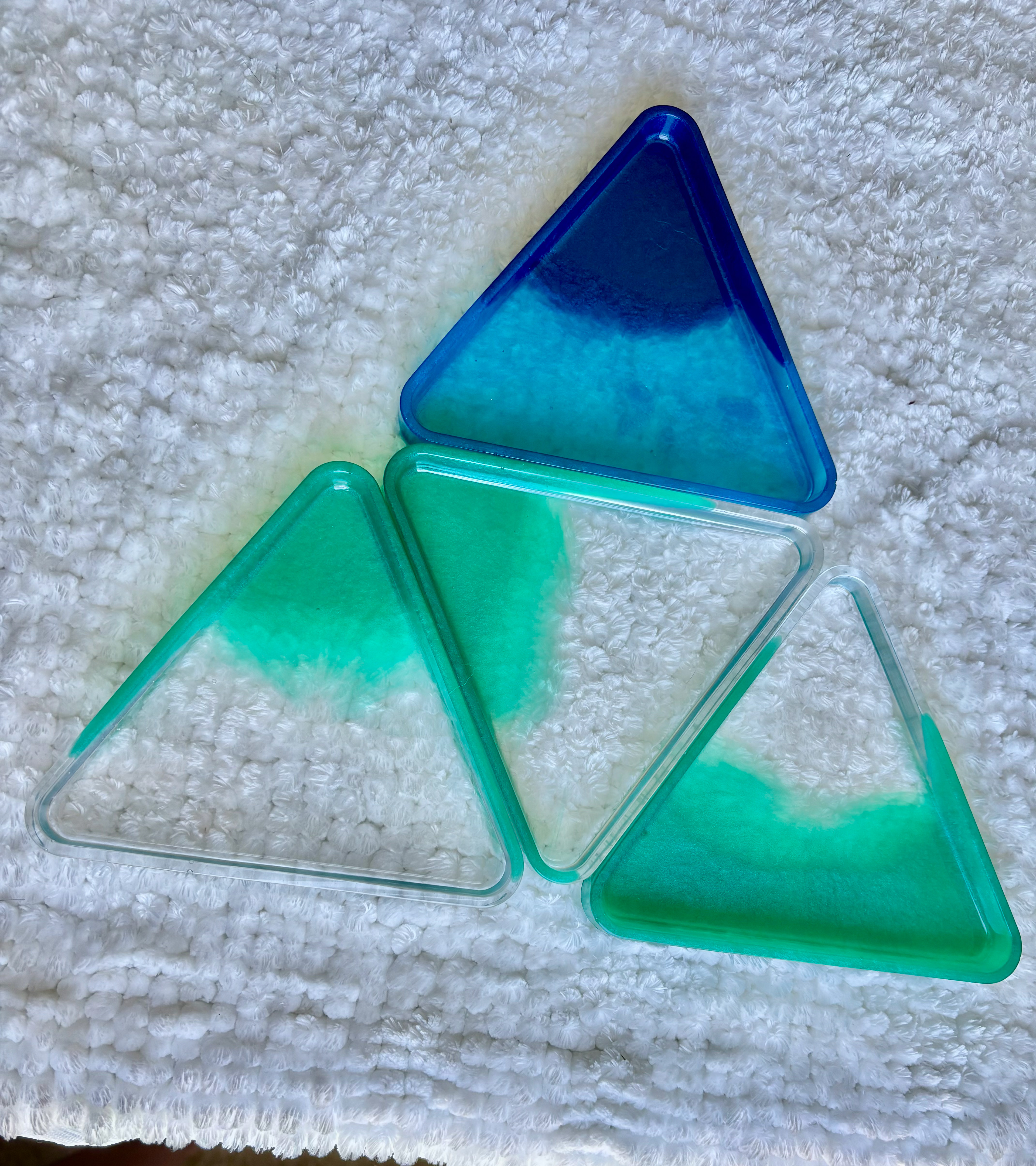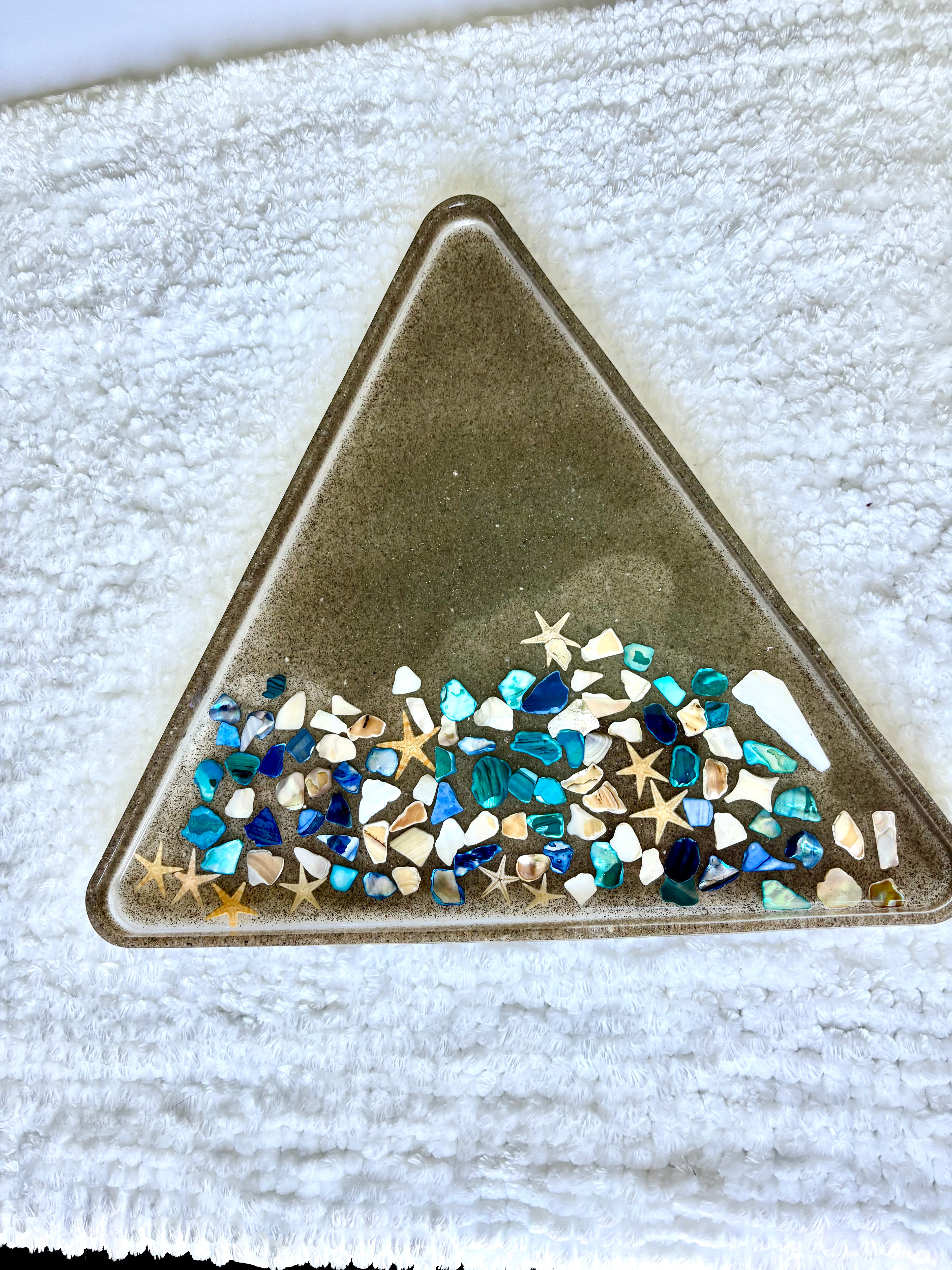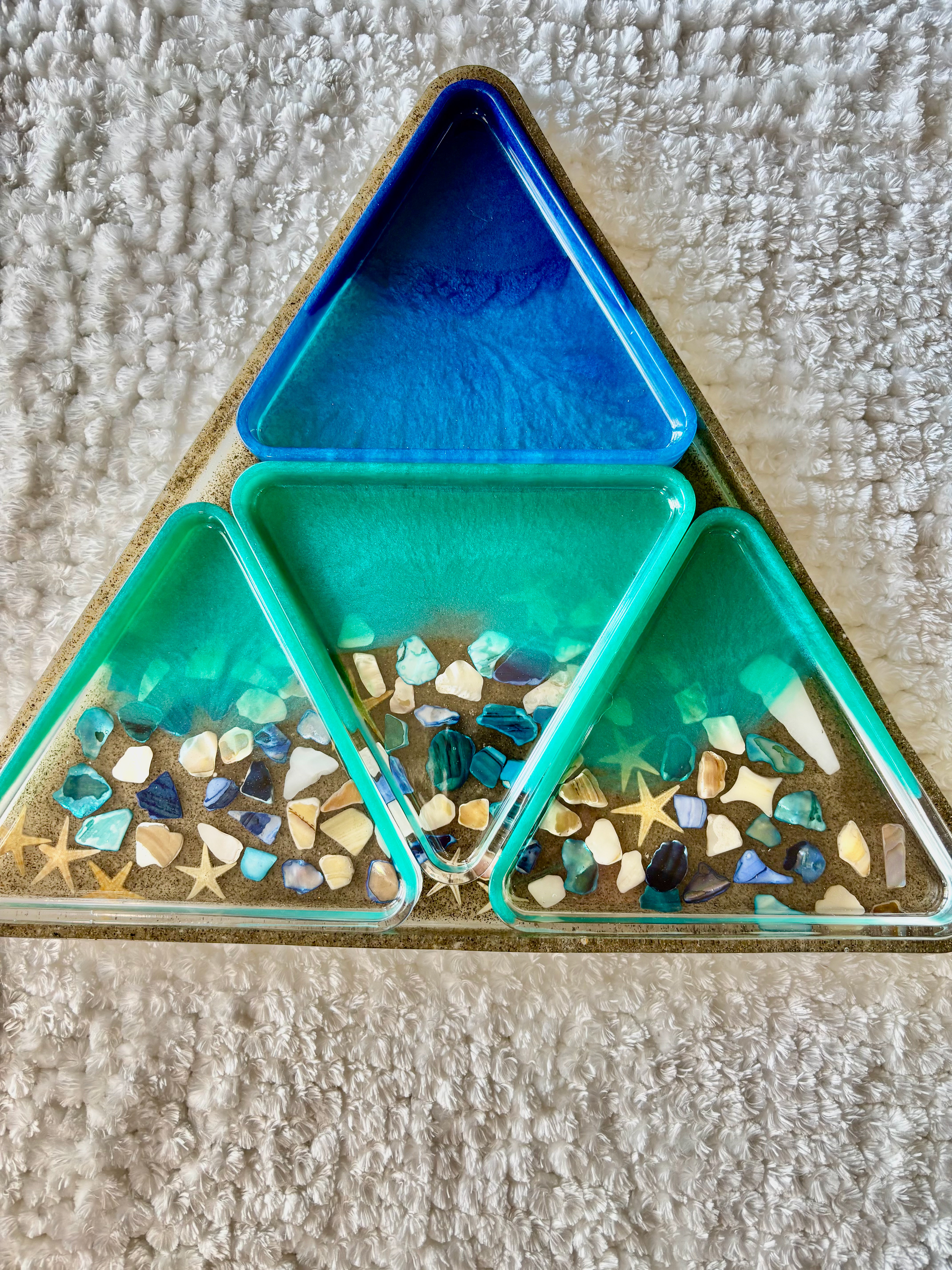 Each triangular piece flows from deep ocean blues to turquoise shallows, meeting a textured layer of real beach sand, starfish, and seashells — perfectly mimicking the look of waves meeting the shore. Together, they form a breathtaking centerpiece that’s both functional and decorative.