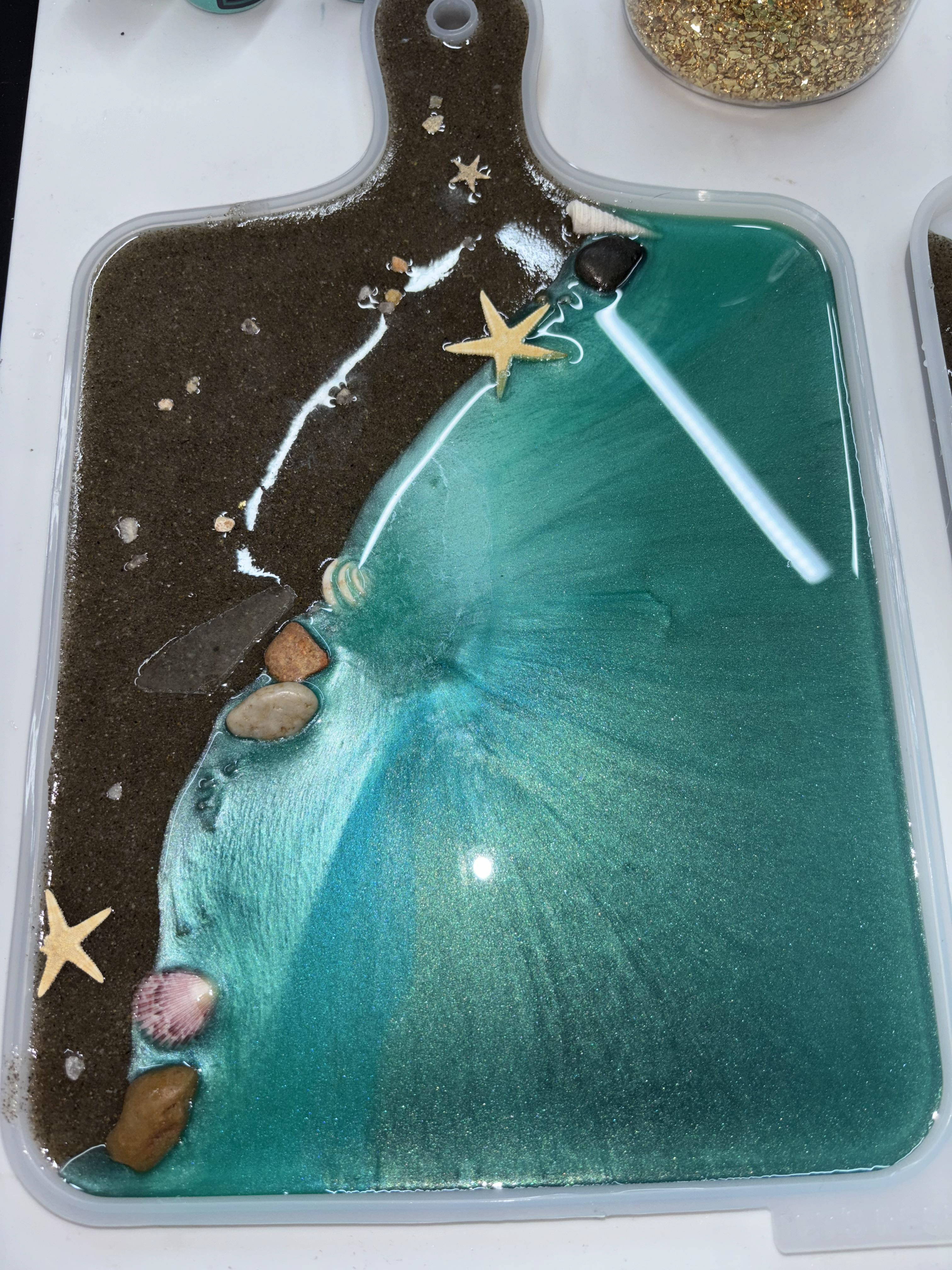 • Ocean wave resin pour featuring lacing, depth, and shimmer