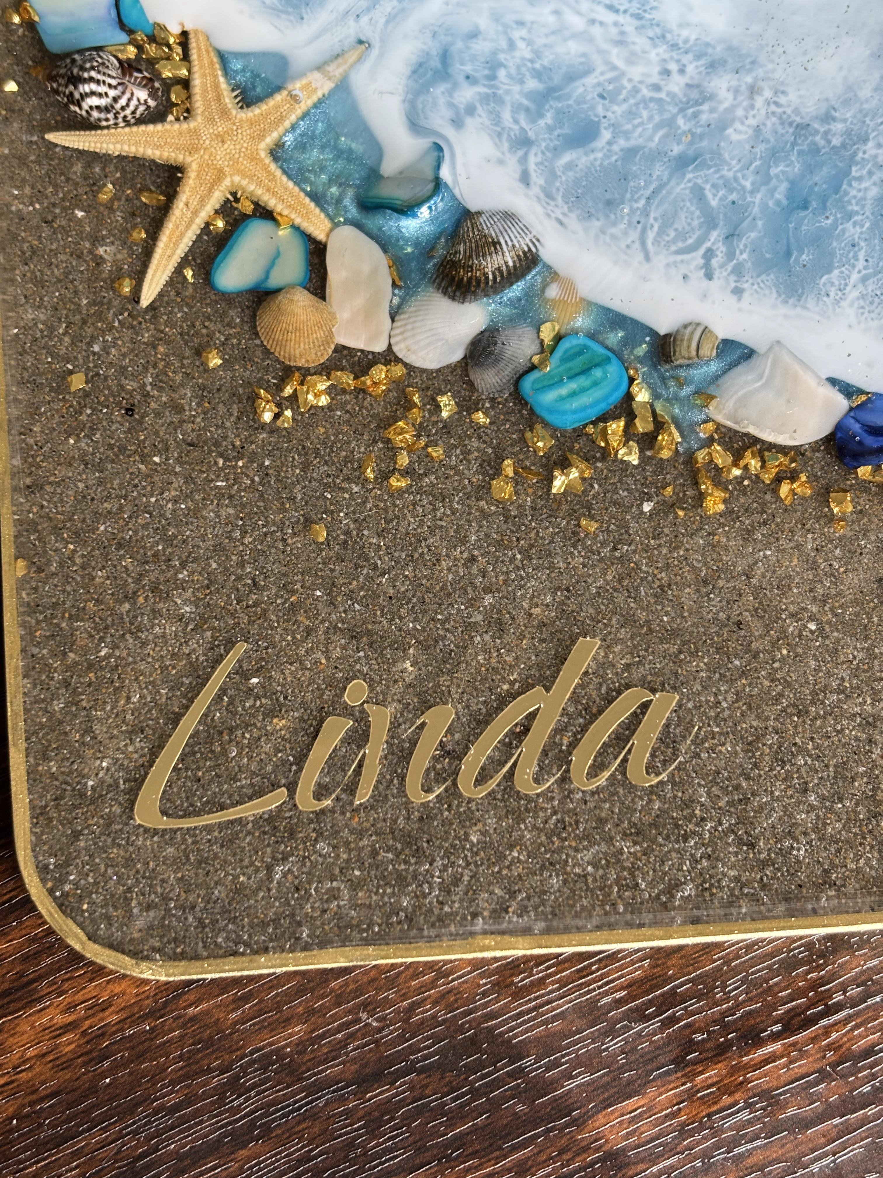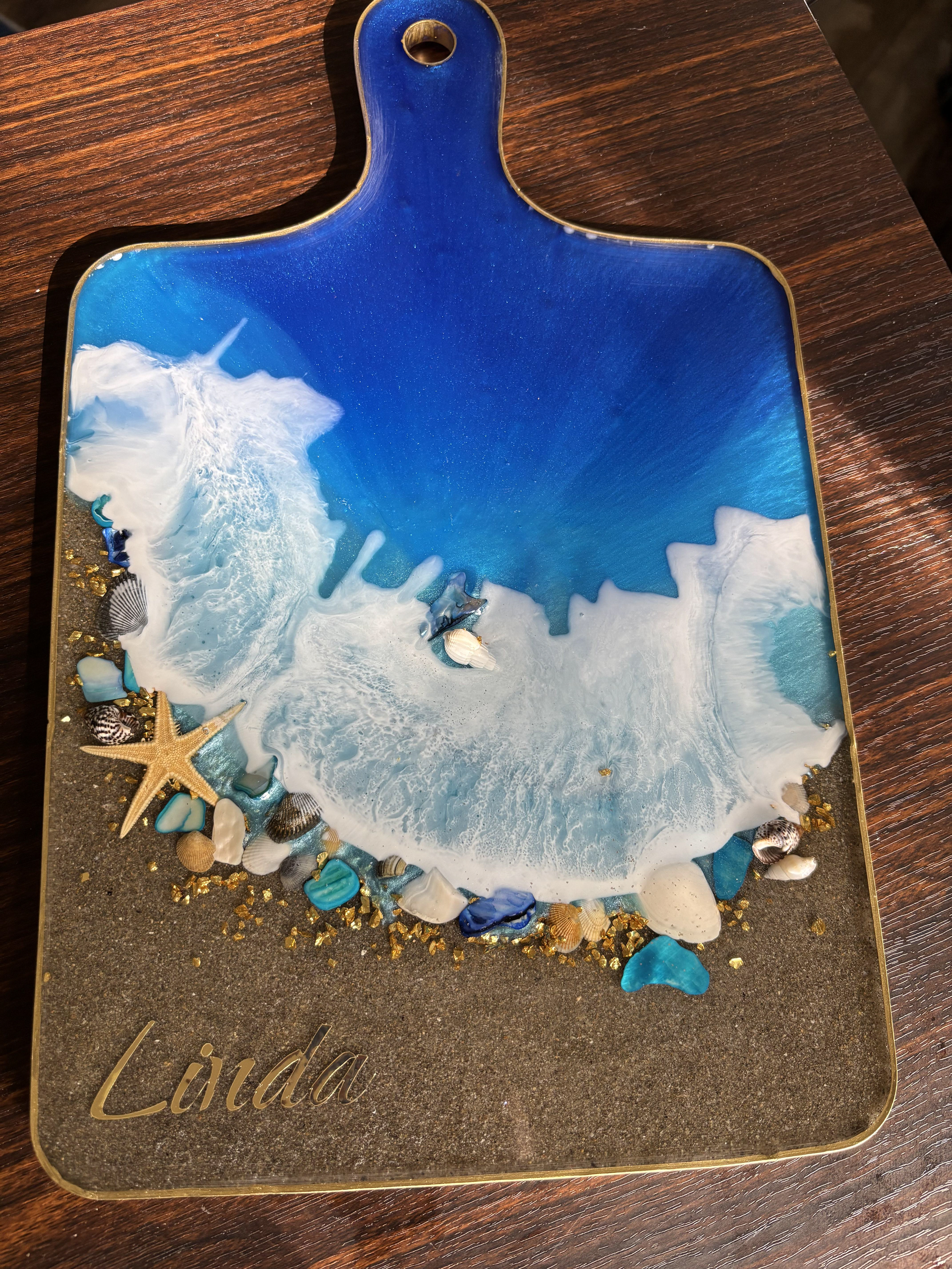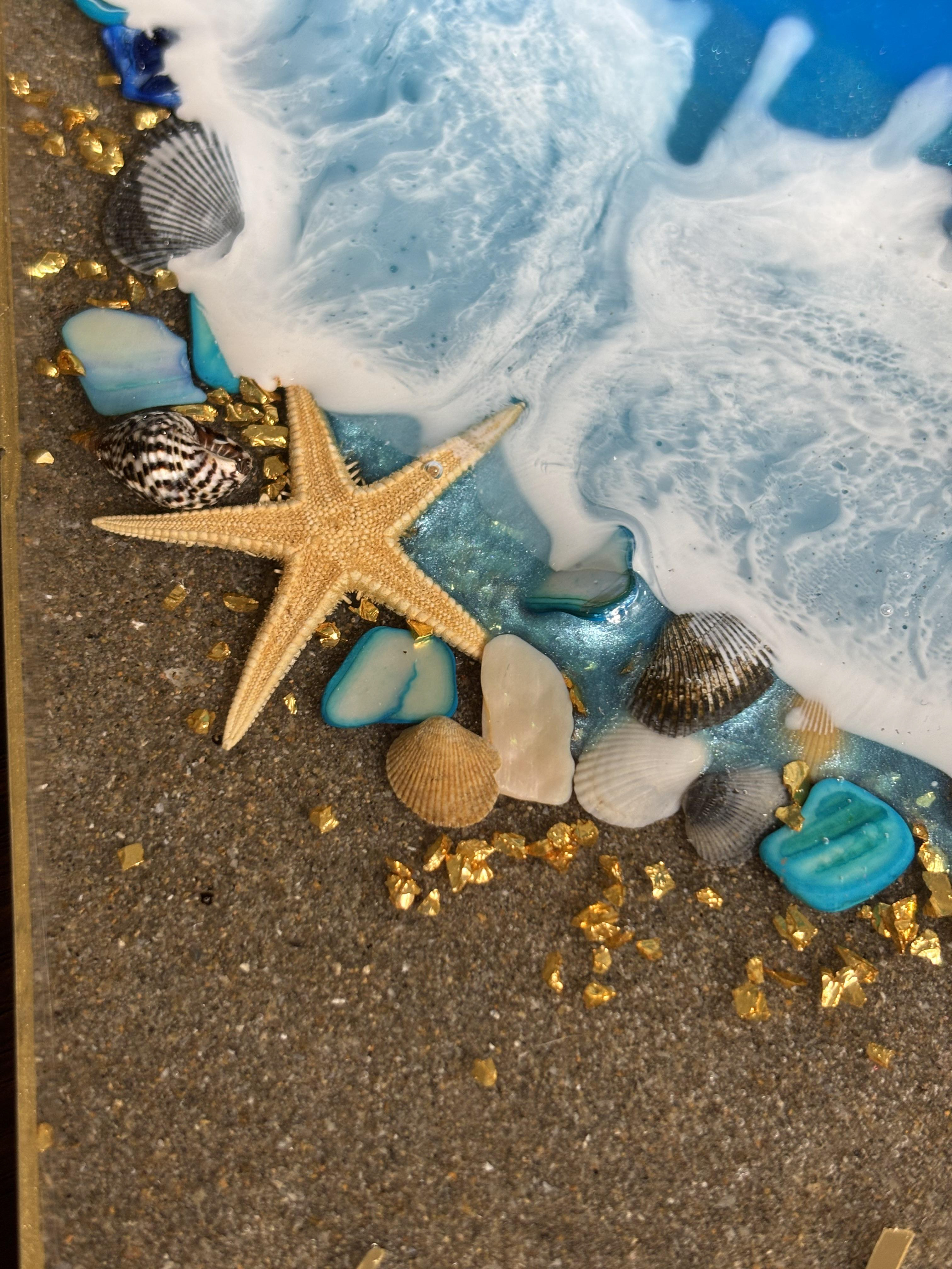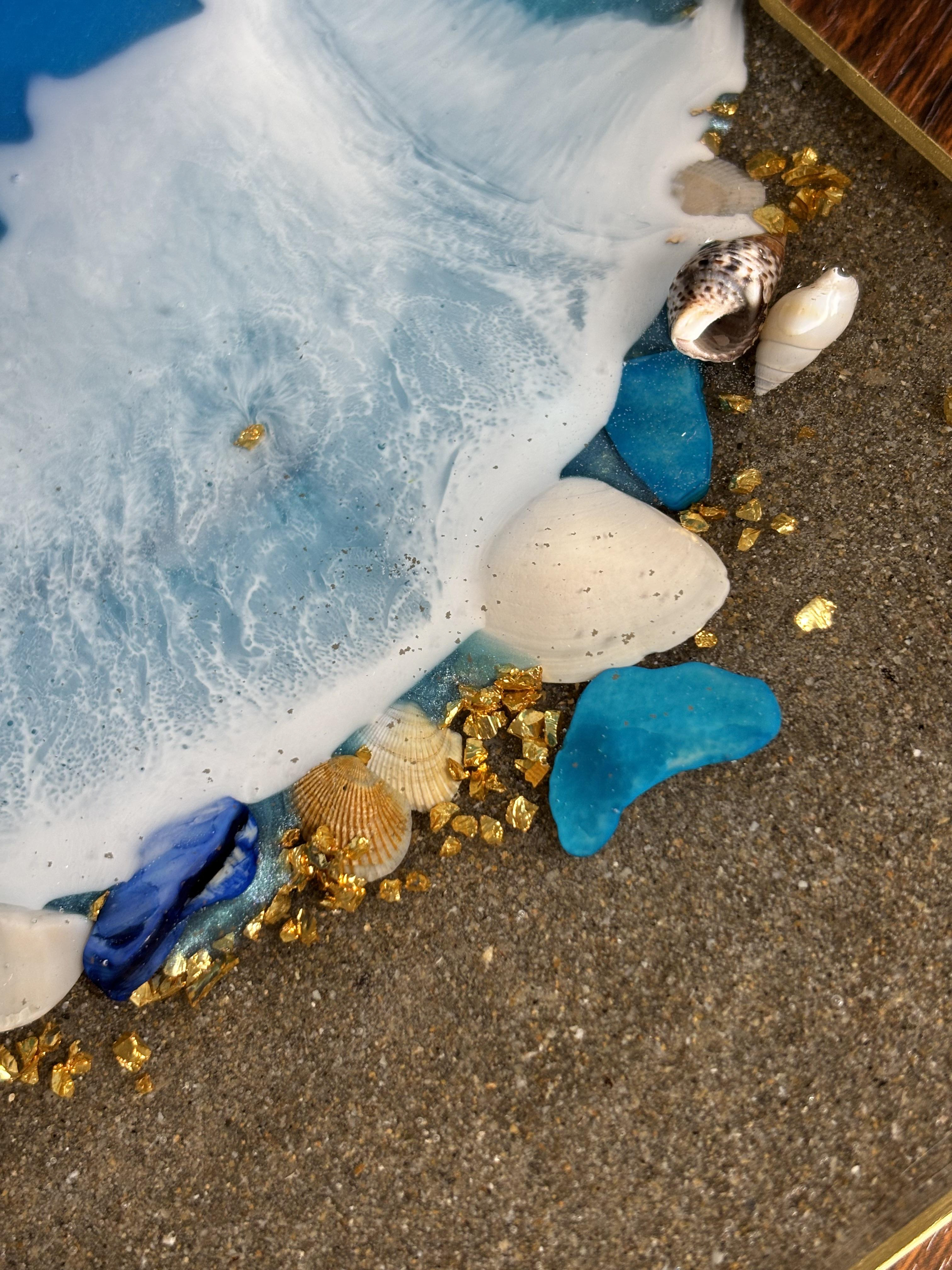 Bring the beauty of the beach into your home with a fully customizable decorative resin cutting board. This handmade board is designed to look like waves washing onto shore, complete with shimmering water colors, and real shells and gold accents.