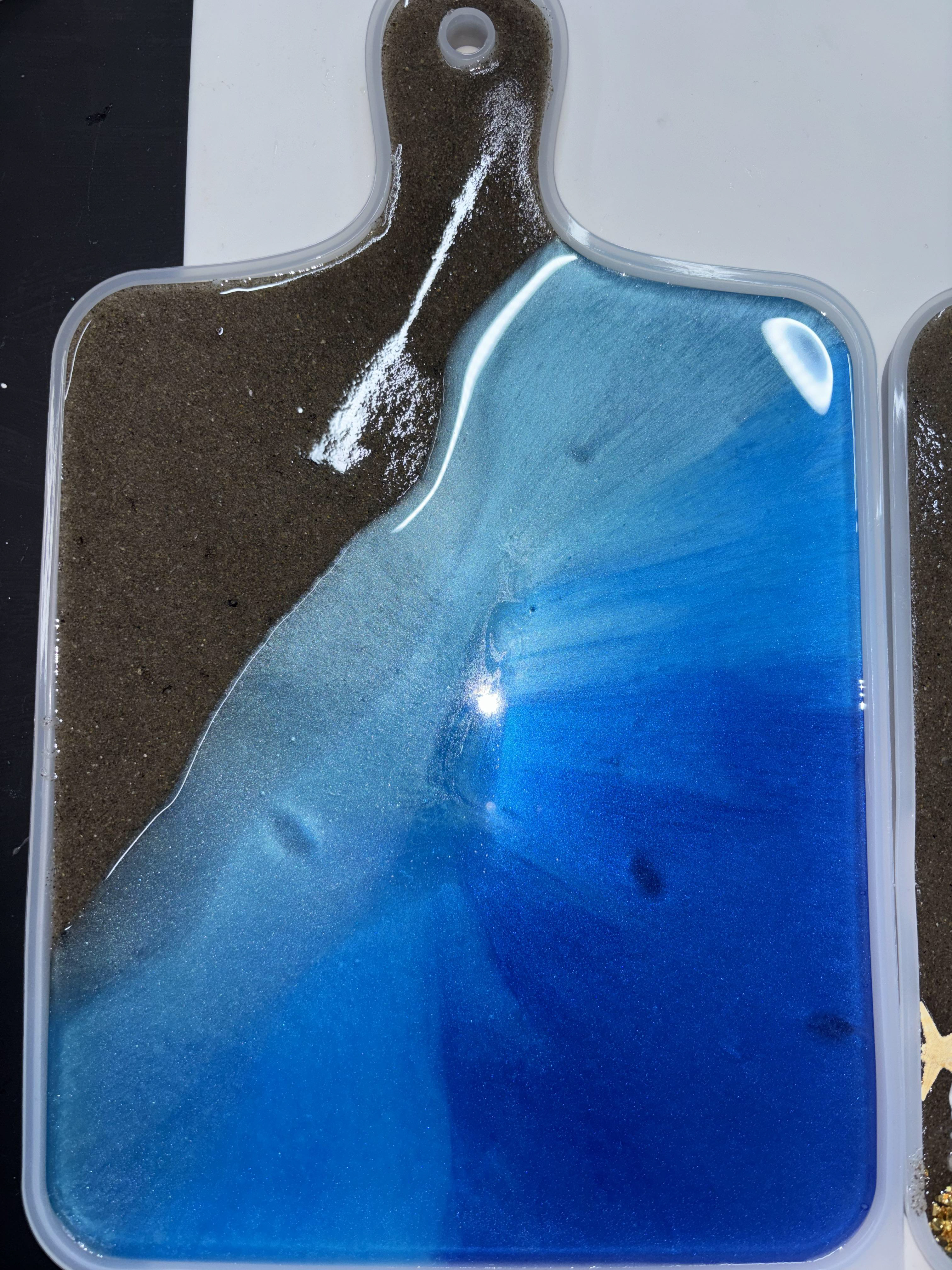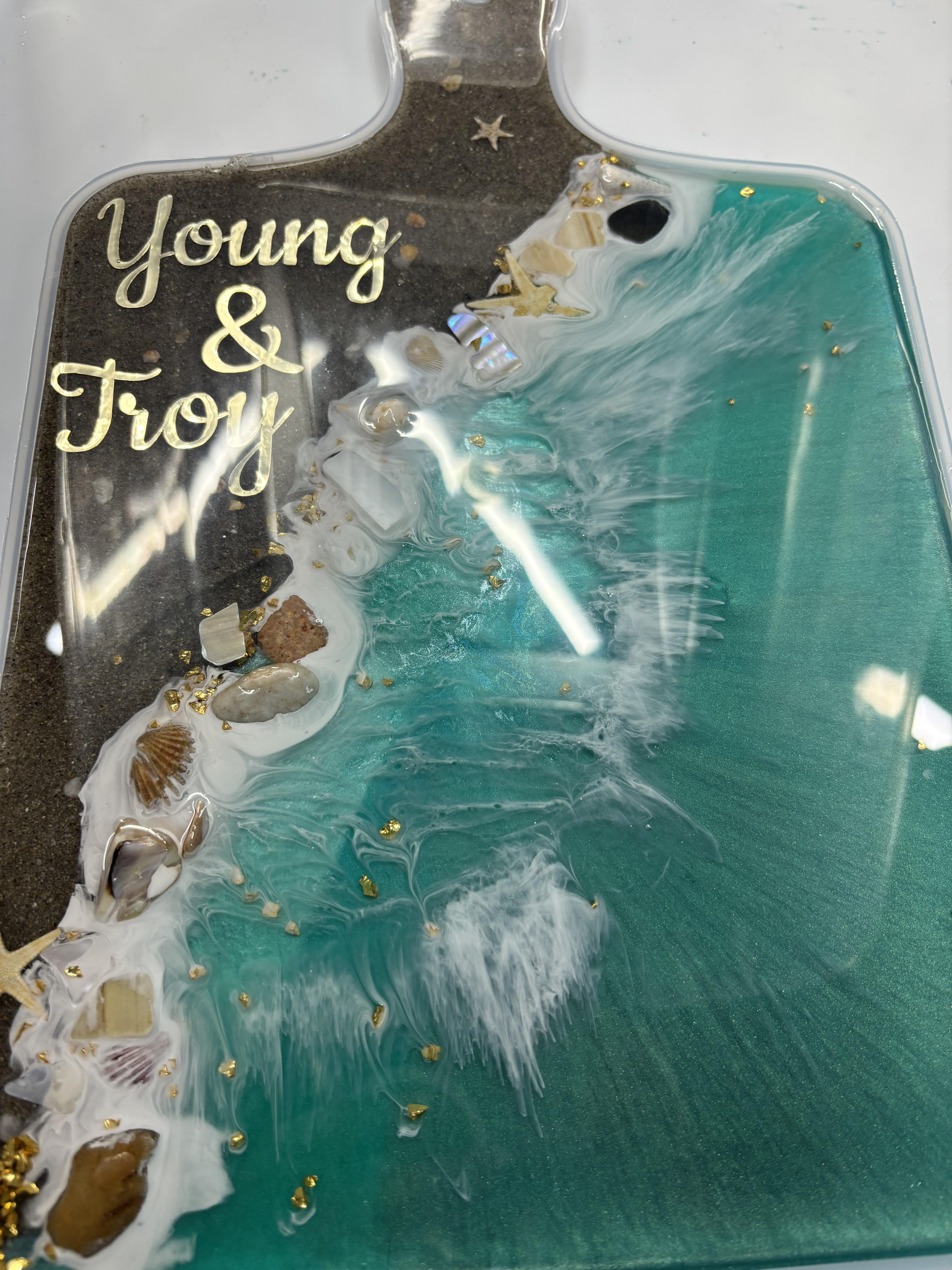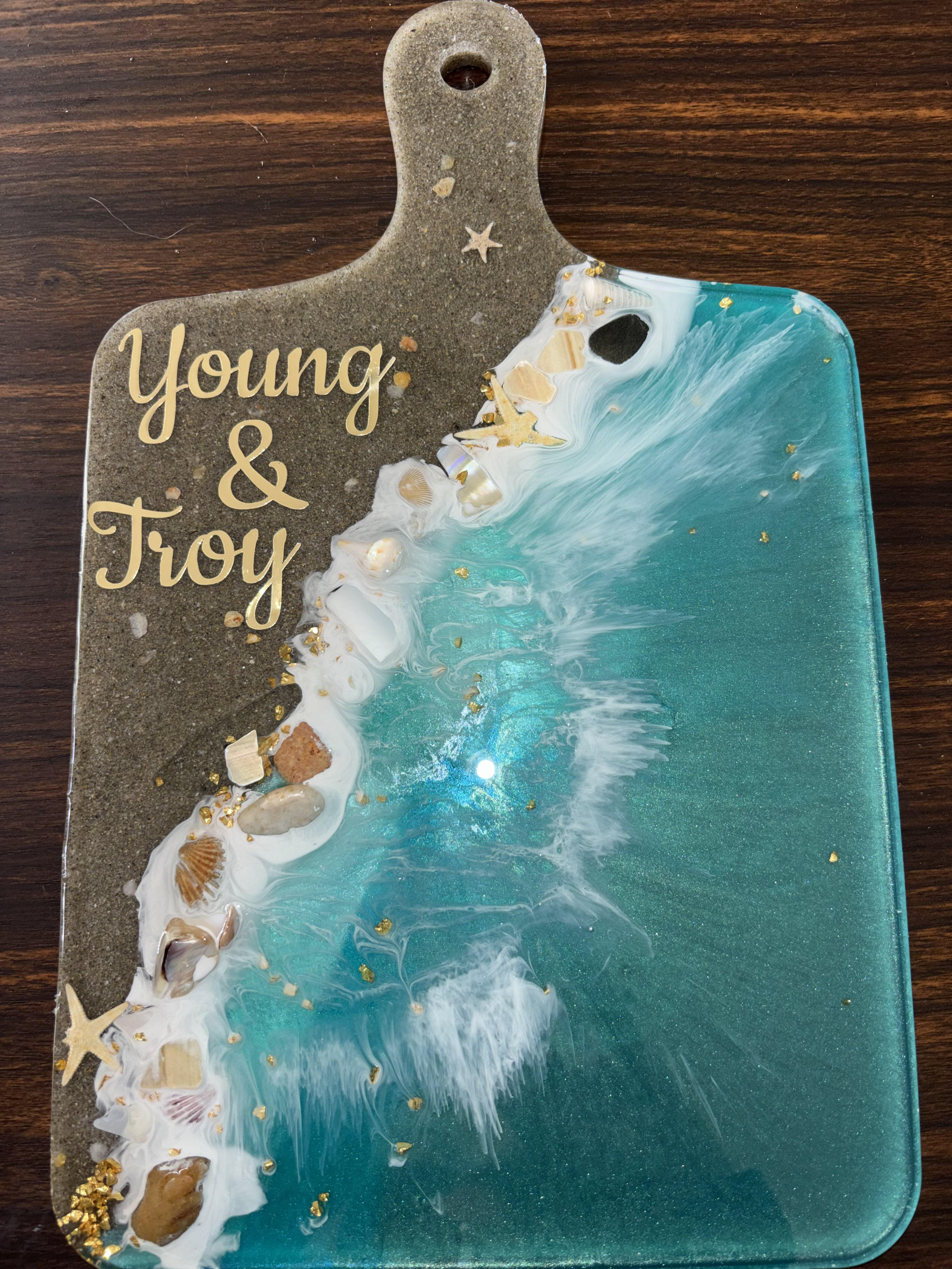 Whether you’re looking for a one-of-a-kind wedding gift, housewarming present, or a gorgeous statement piece for your kitchen or dining table, this ocean resin cutting board makes the perfect personalized keepsake.