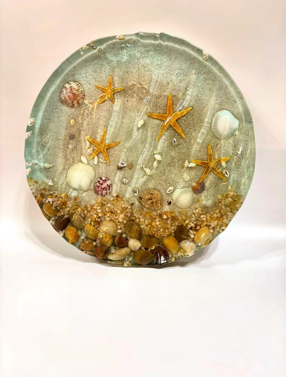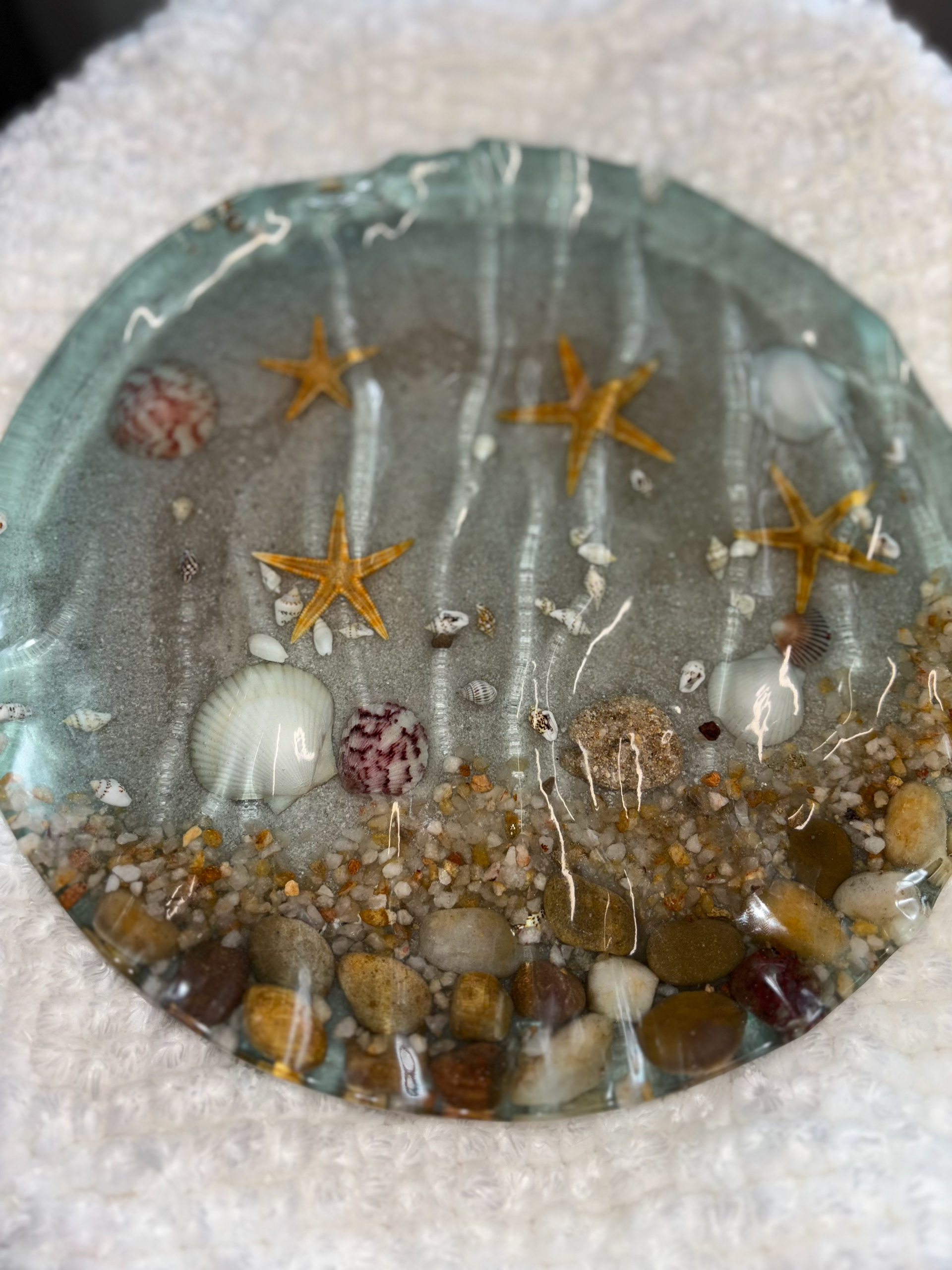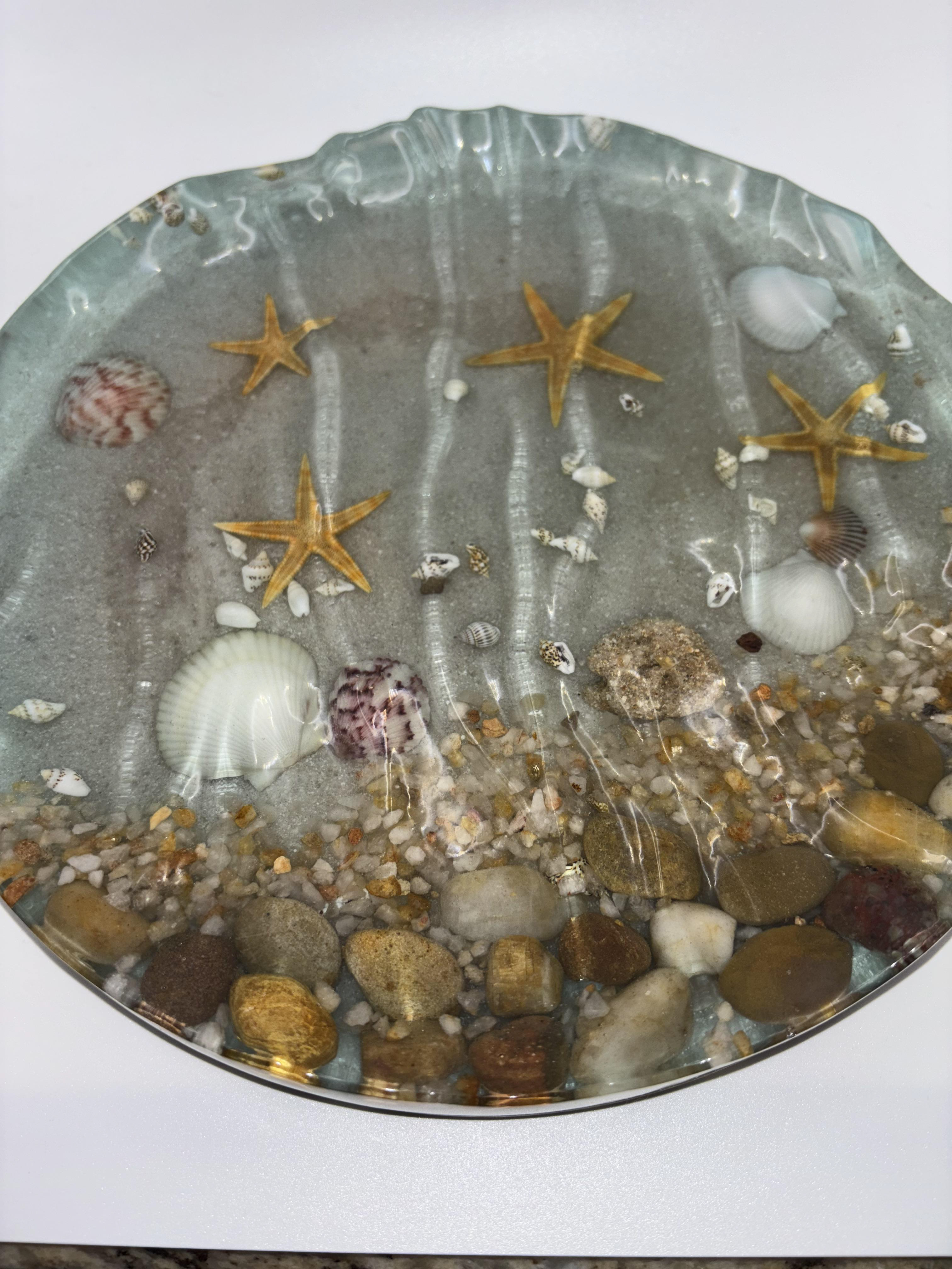 Bring the calm of the shoreline into your home with this handmade resin trinket tray and centerpiece. Designed to capture the beauty of the ocean, this unique piece features real shells, golden starfish, natural stones, and sandy textures preserved in crystal-clear resin. Pictures can't do this piece justice!