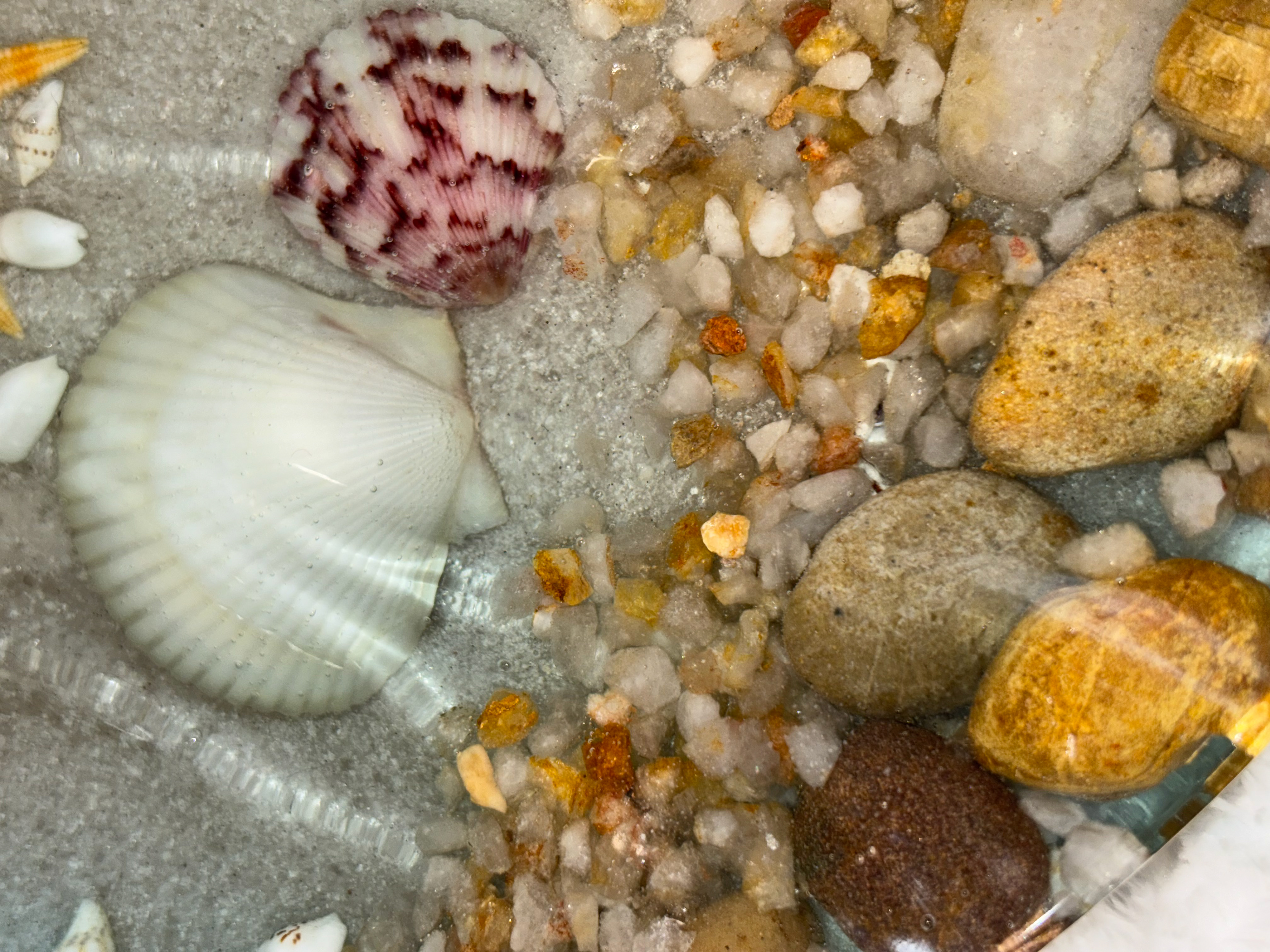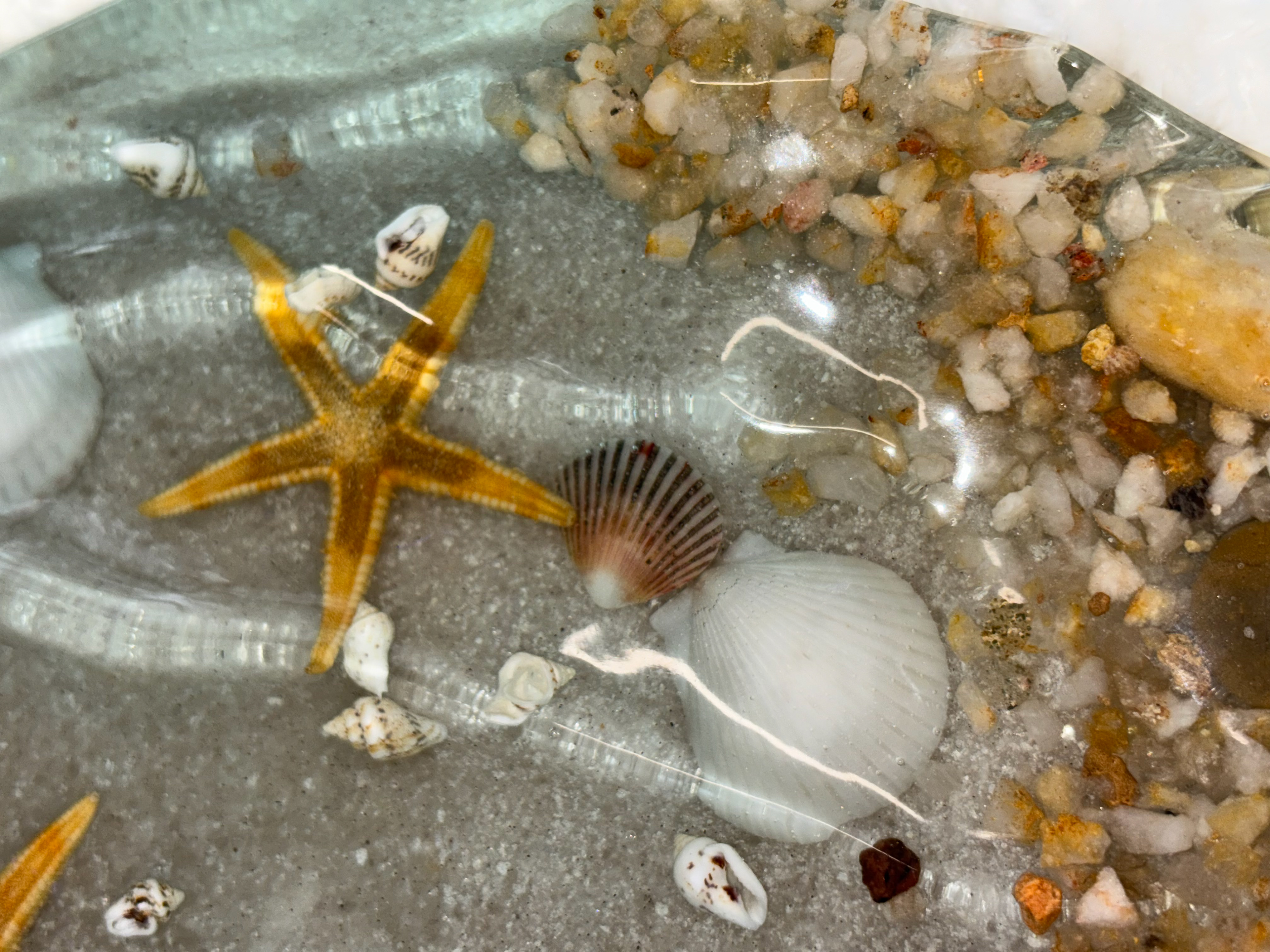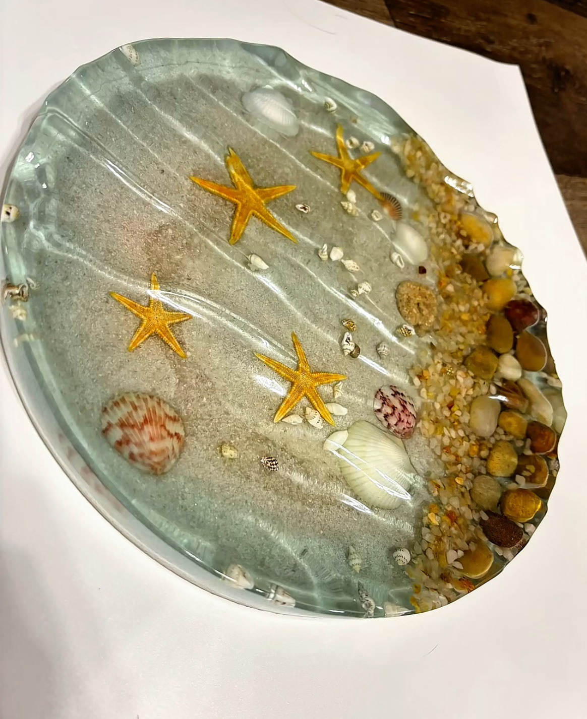 Bring the calm of the shoreline into your home with this handmade resin trinket tray and centerpiece. Designed to capture the beauty of the ocean, this unique piece features real shells, golden starfish, natural stones, and sandy textures preserved in crystal-clear resin. Pictures can't do this piece justice!