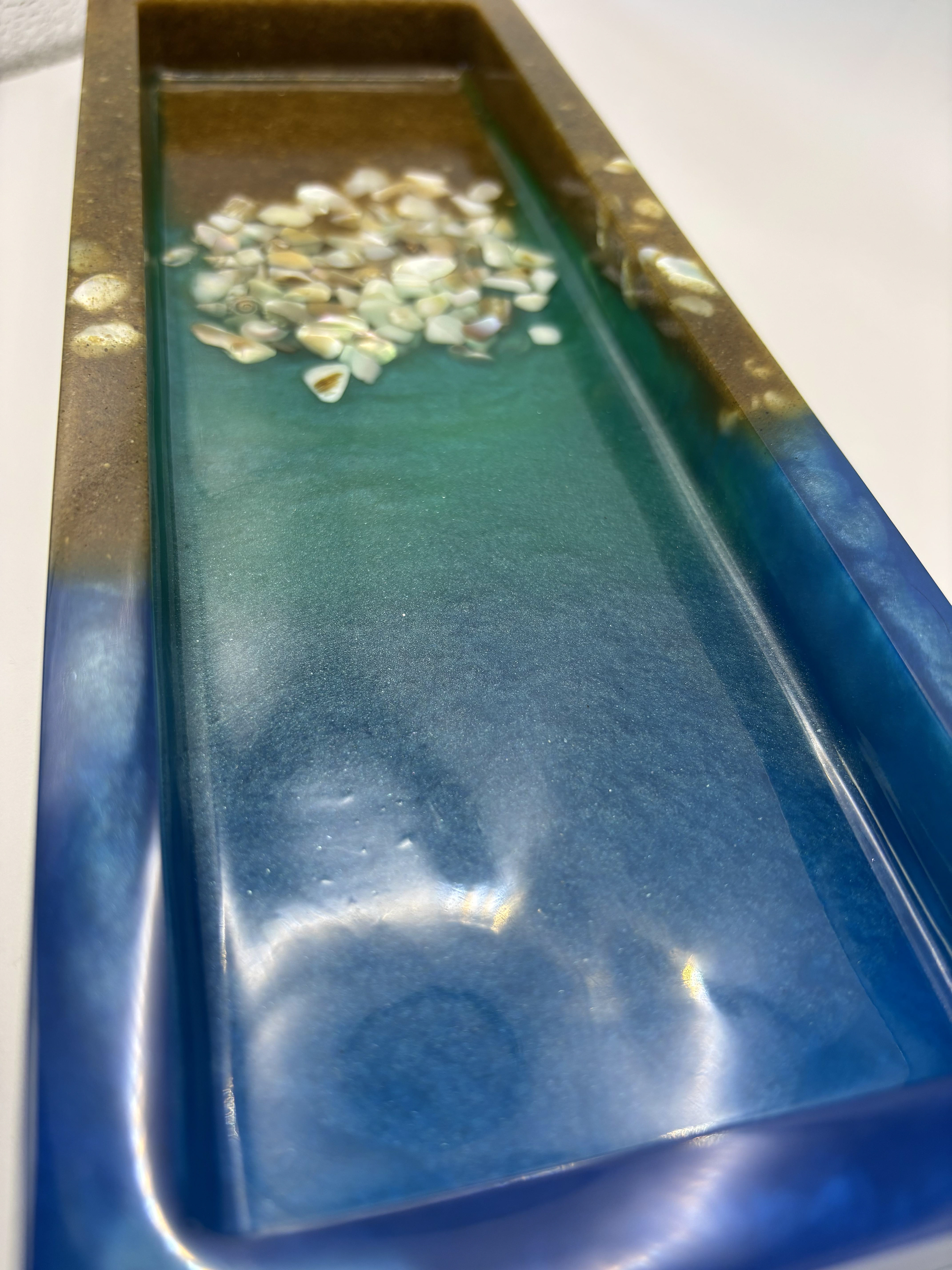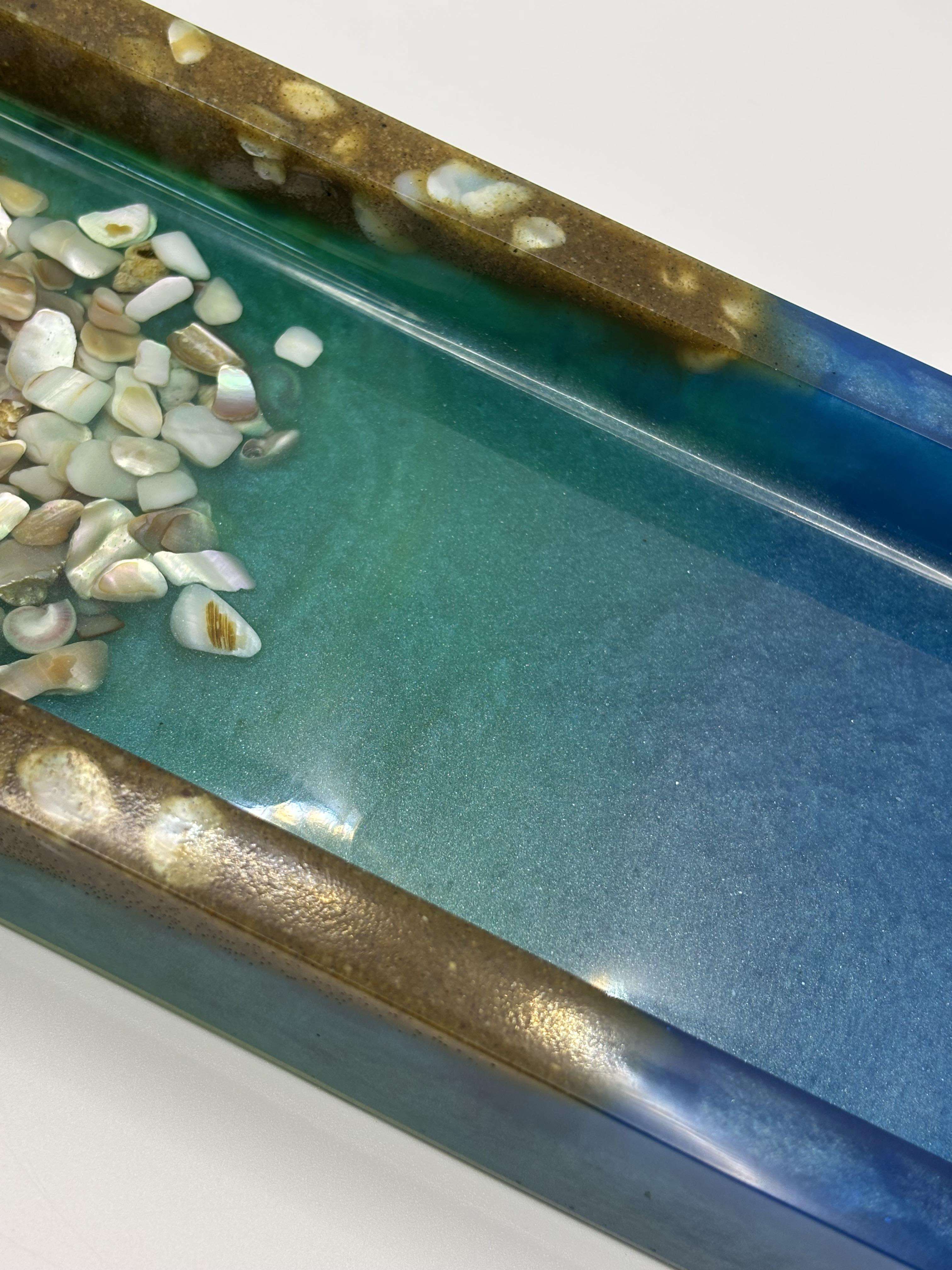 This handmade resin ocean tray captures the beauty of the shoreline with layers of blue and aqua resin, shimmering sand tones, and genuine seashell accents. Each tray is carefully crafted to reflect the calming waves of the sea, making it both a functional piece and a work of art.