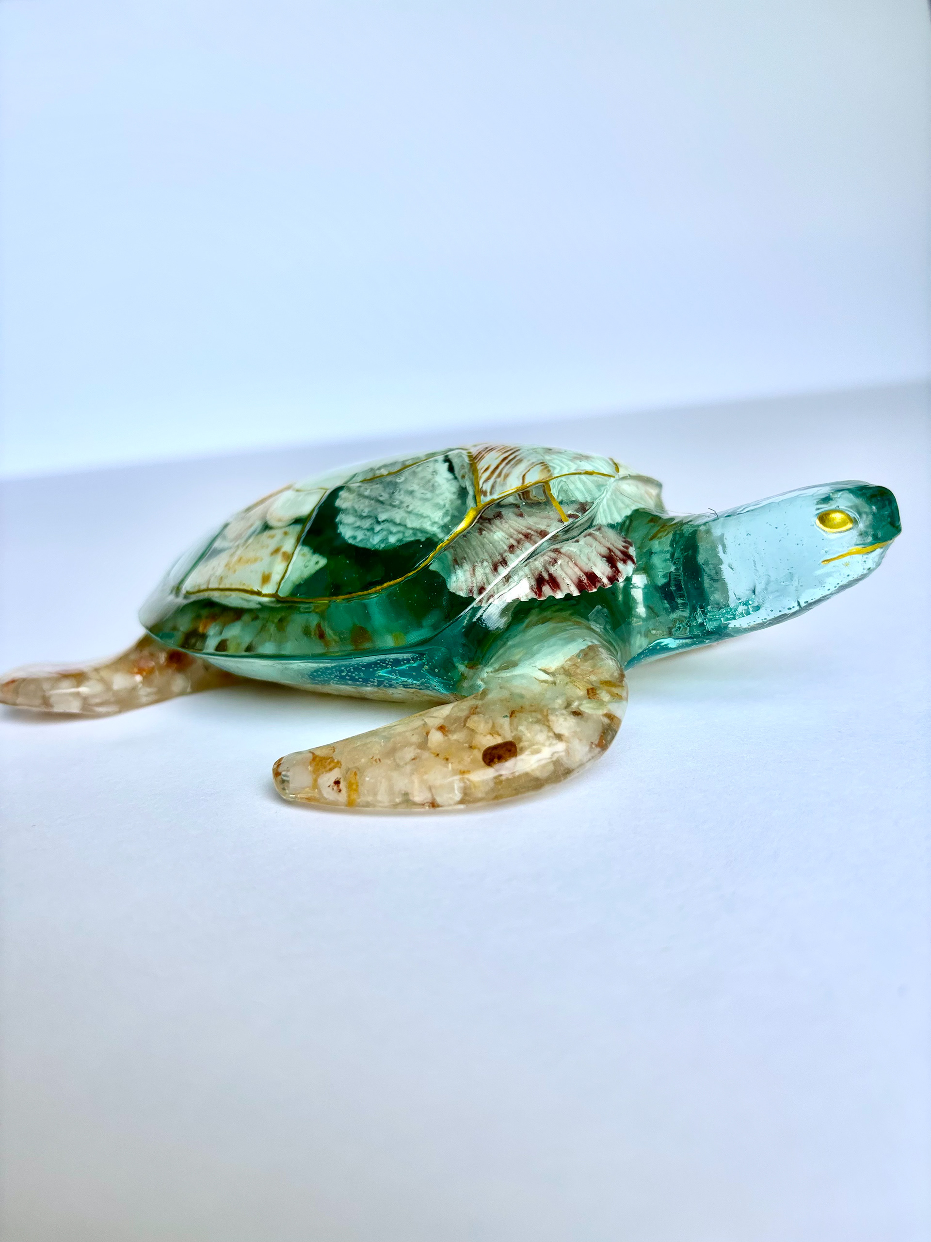 The turtle’s body features a crystal-clear resin shell with hand-placed shells and golden accents, while the flippers are textured with sand-like detail for an authentic coastal touch. Whether displayed on a coffee table, shelf, or as part of your nautical centerpiece, this sea turtle adds charm, serenity, and a splash of the ocean to your space.