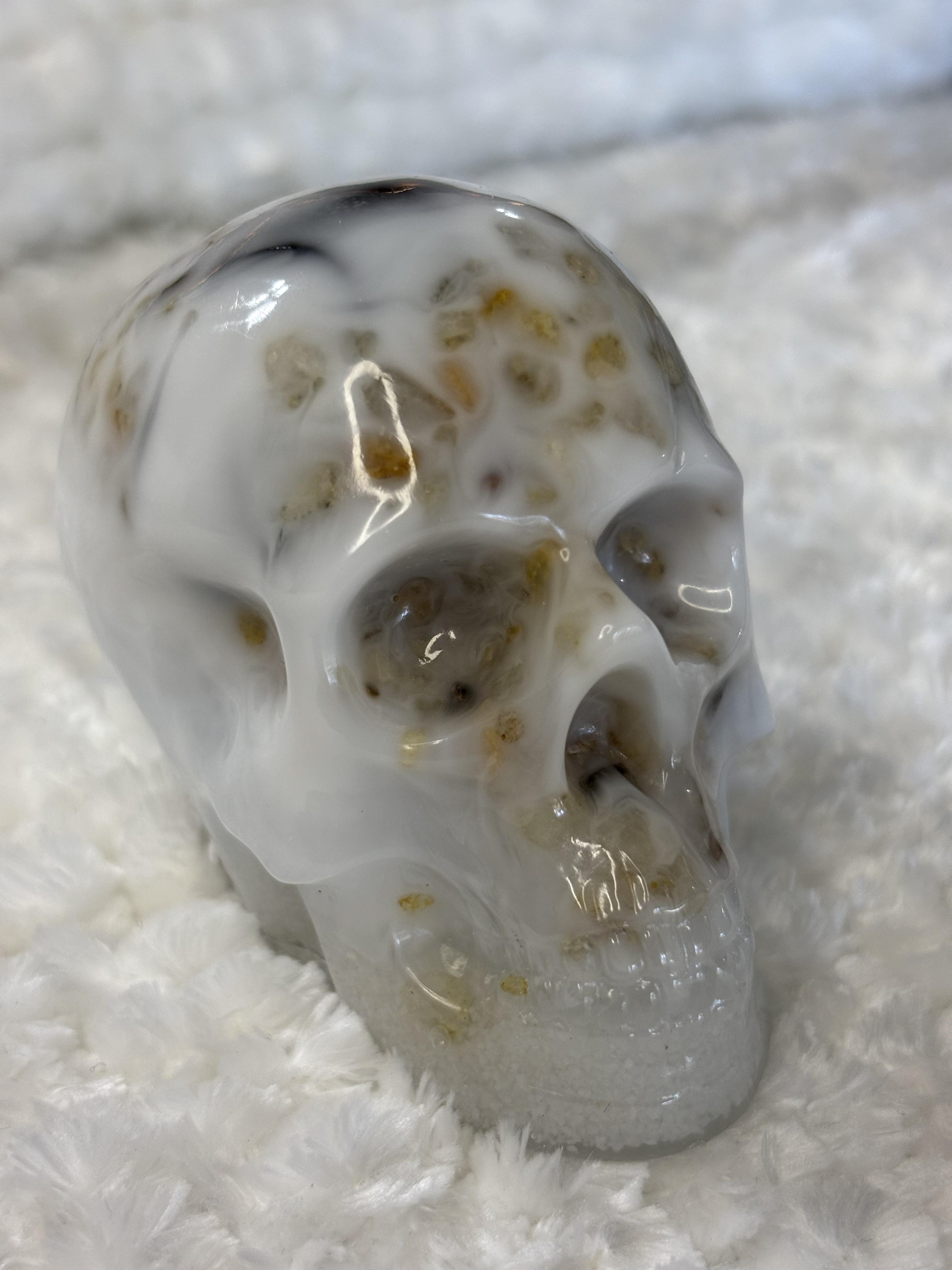 Whether displayed on a bookshelf, desk, or Halloween centerpiece, these resin skulls bring a mix of eerie charm and modern artistry. They also make thoughtful gifts for fans of gothic fashion, crystal skull lovers, or anyone who enjoys unique handmade décor.