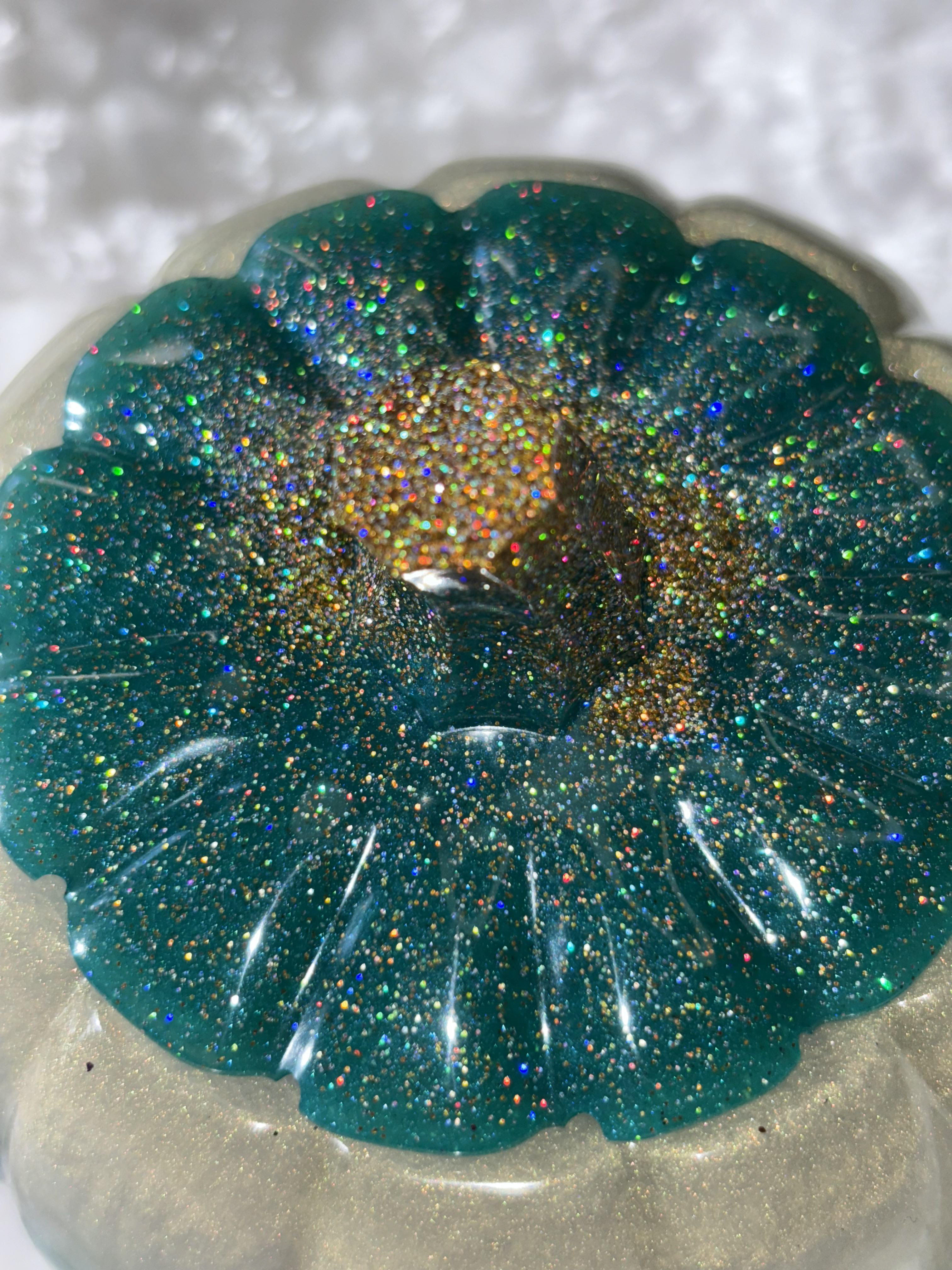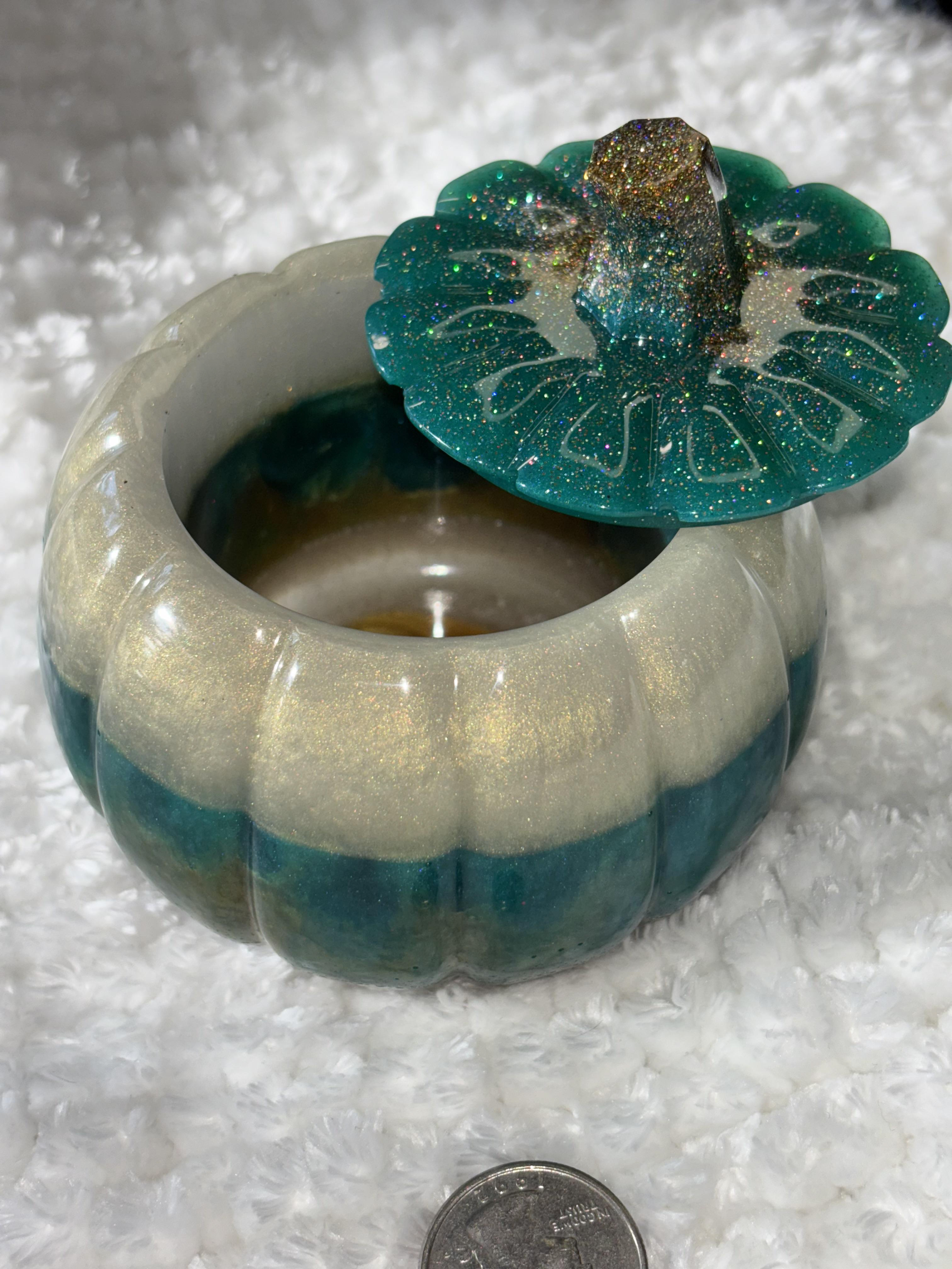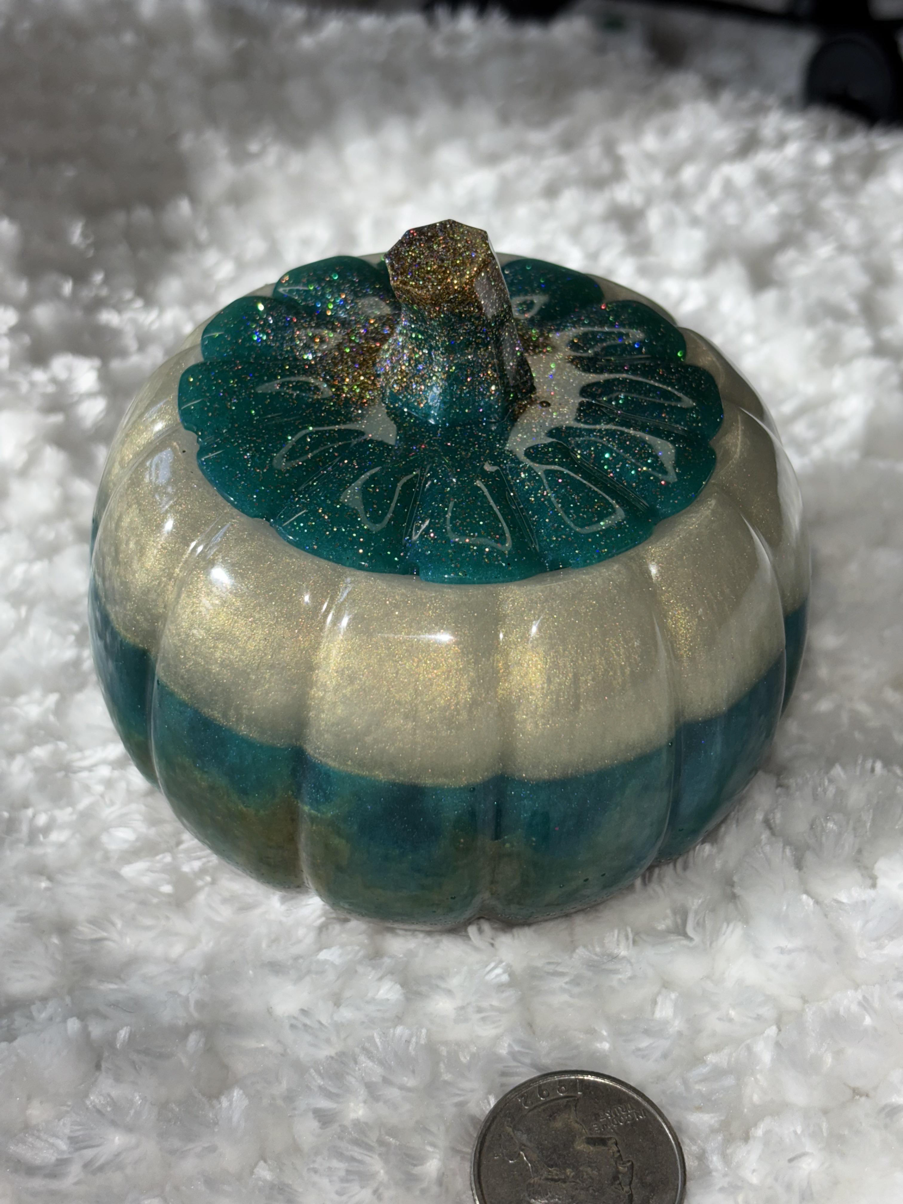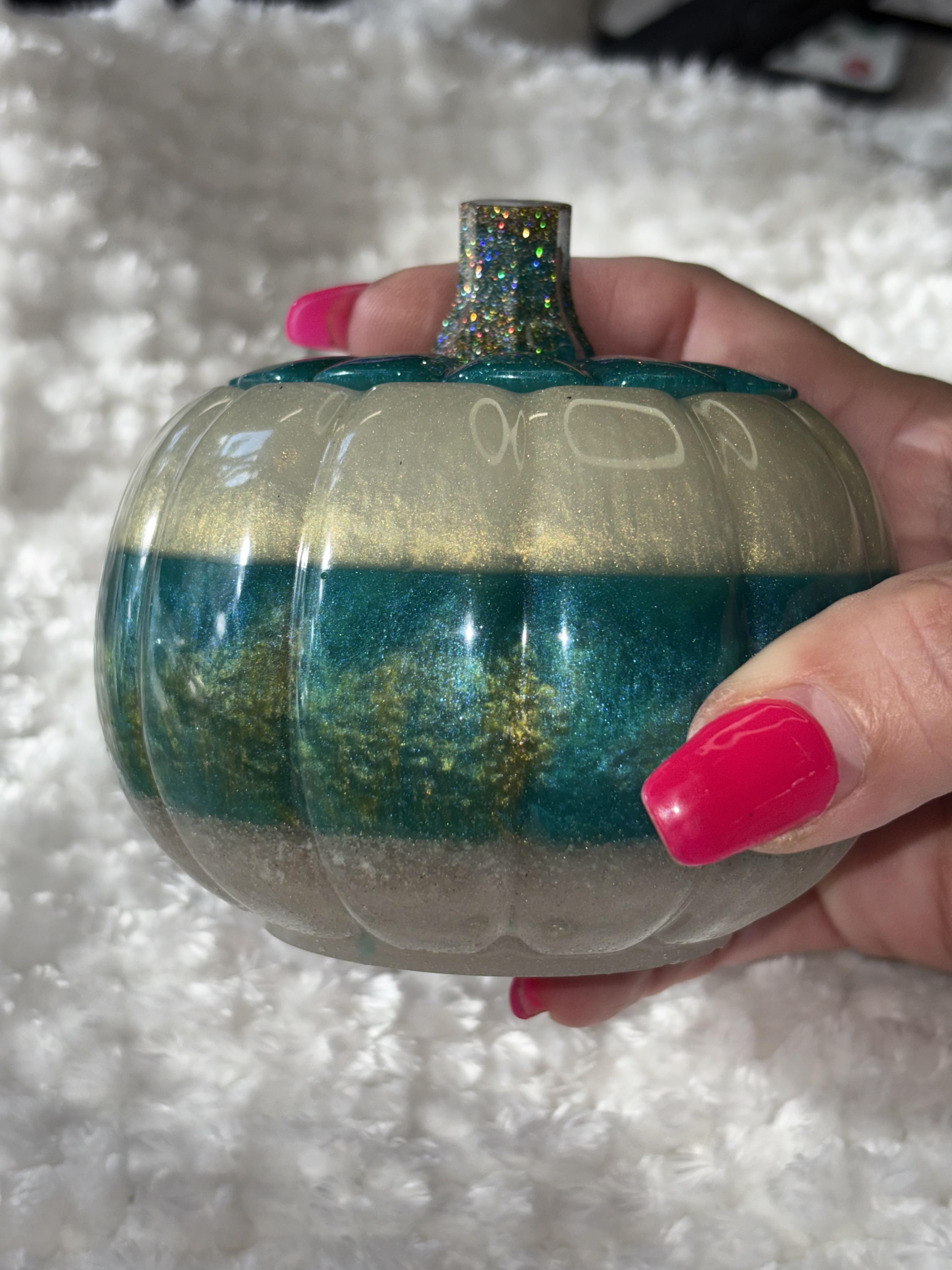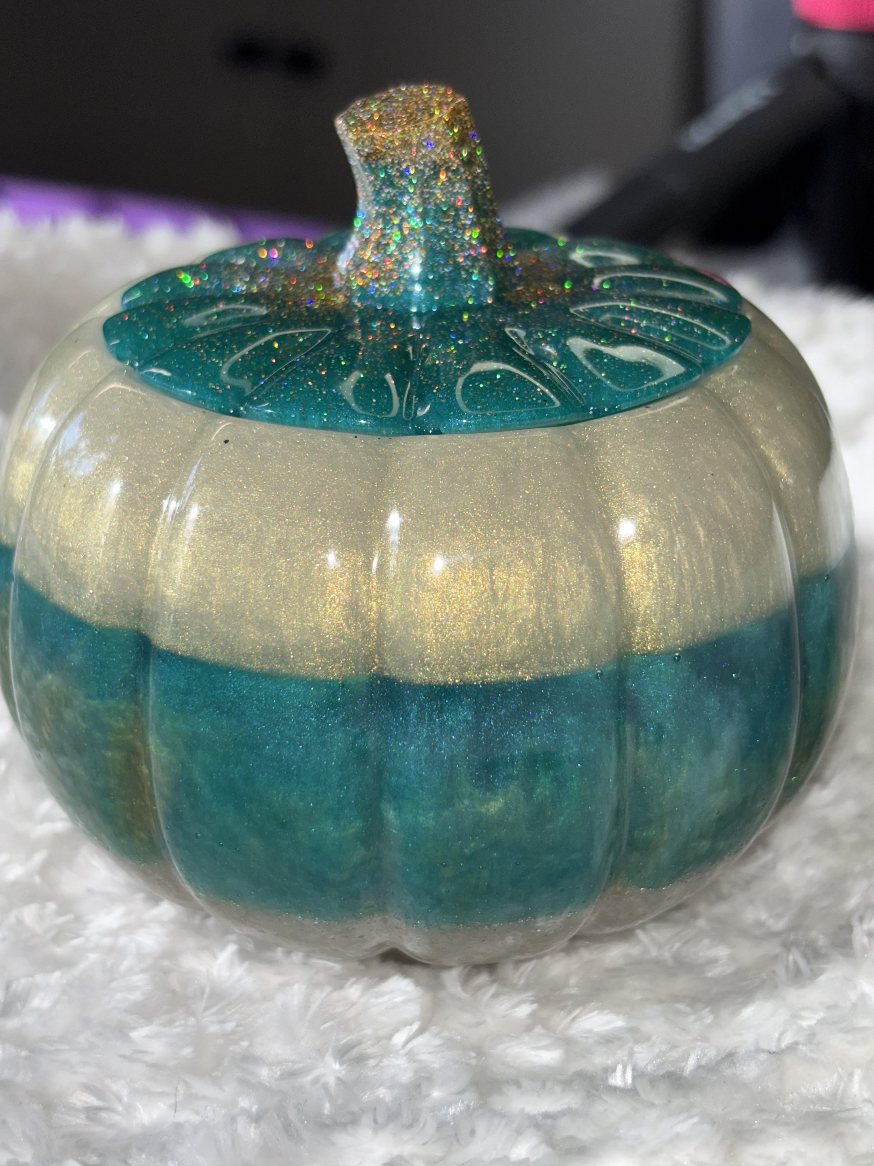 Add sparkle and elegance to your fall décor with this handmade resin pumpkin 🎃✨. Featuring a shimmering teal base, metallic gold middle, and a glitter-encrusted stem, this pumpkin is a true statement piece that brings luxury and charm to your seasonal decorating.