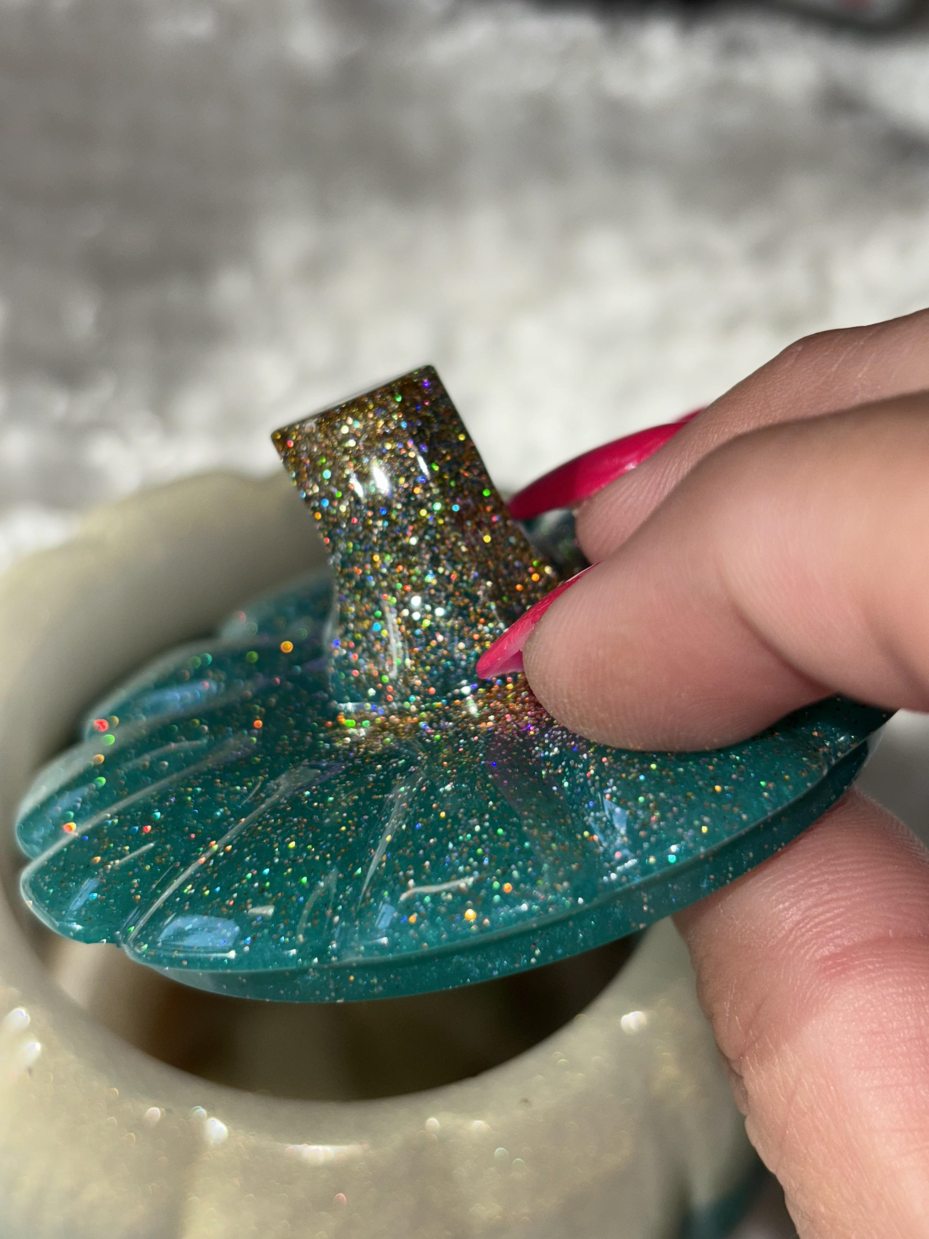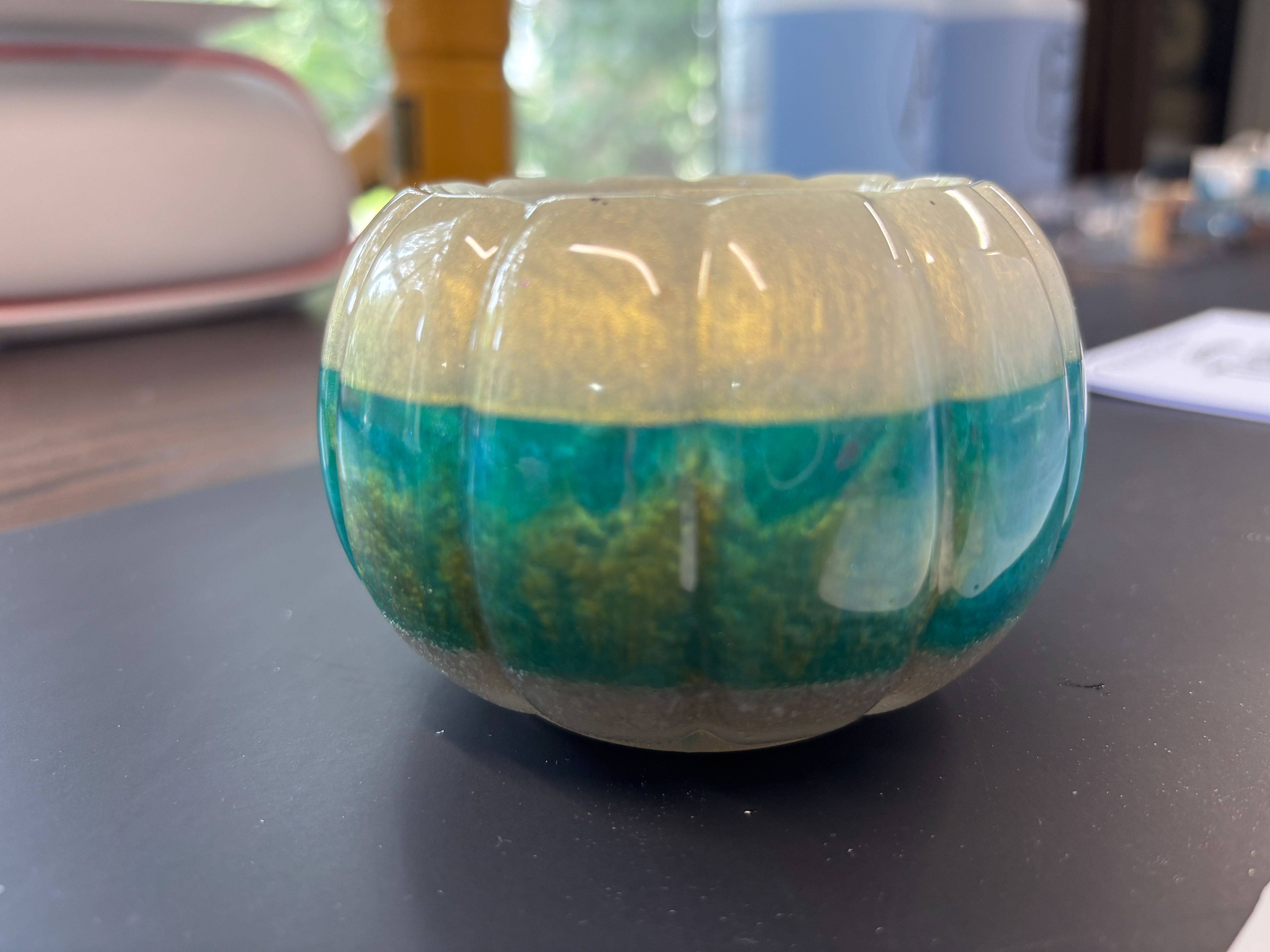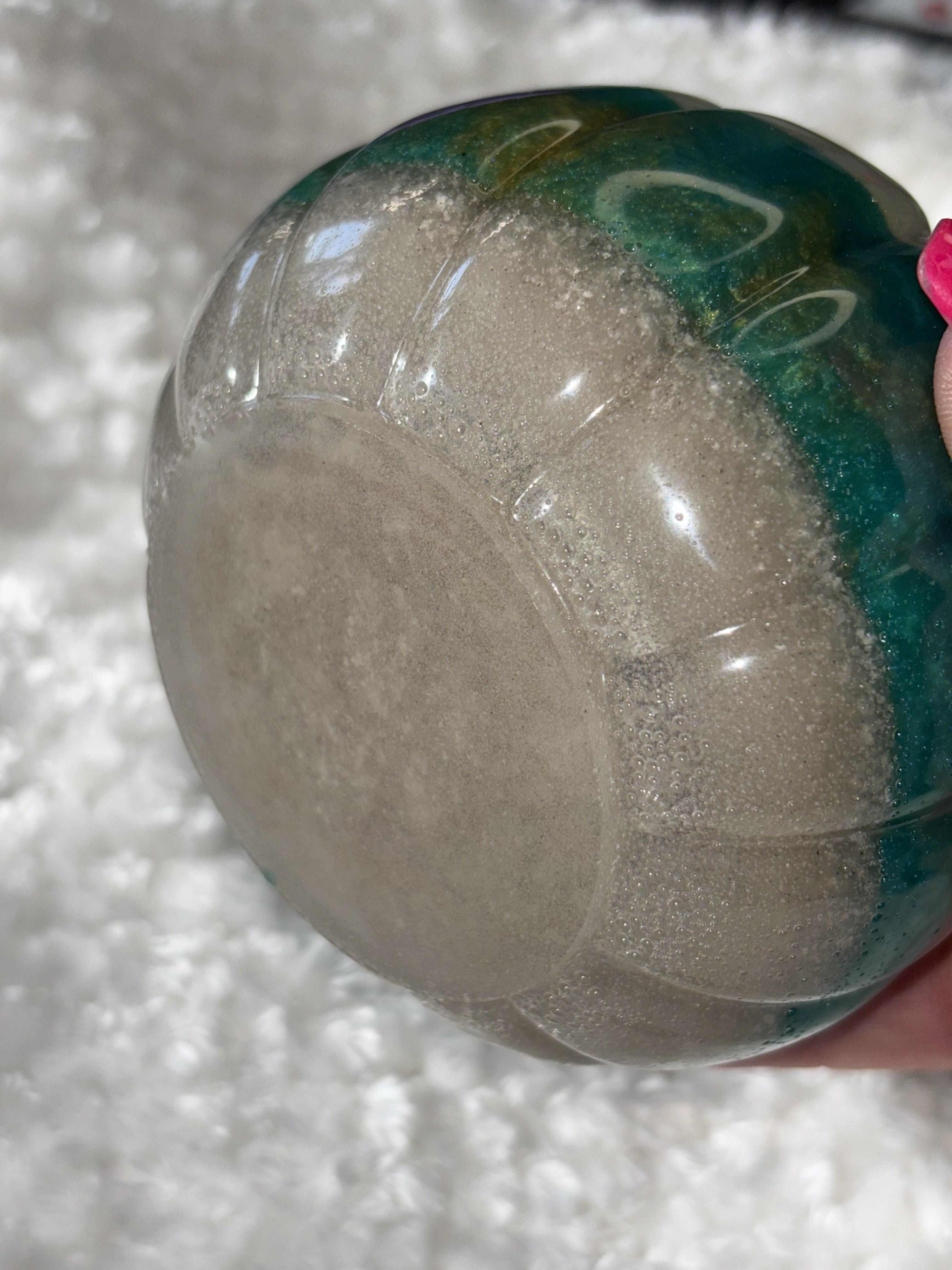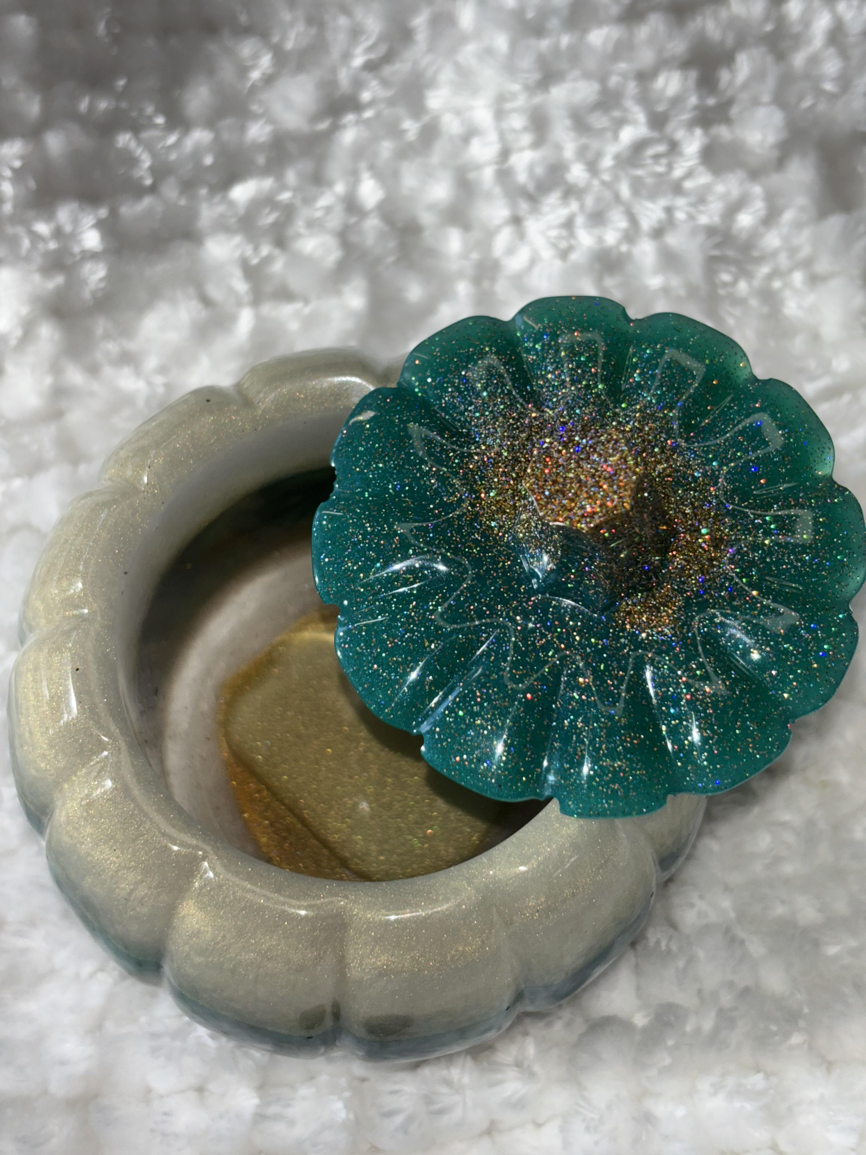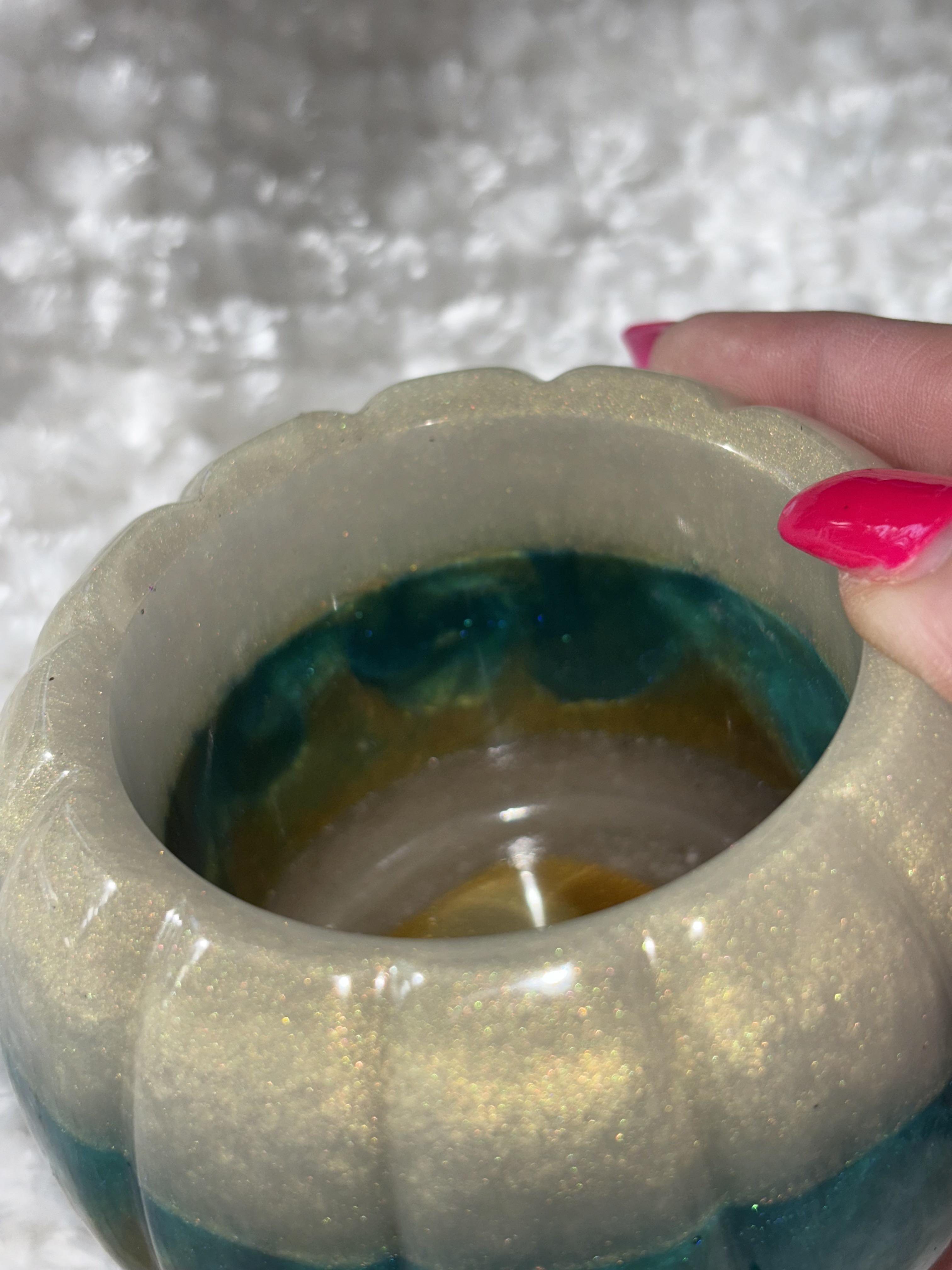 Add sparkle and elegance to your fall décor with this handmade resin pumpkin 🎃✨. Featuring a shimmering teal base, metallic gold middle, and a glitter-encrusted stem, this pumpkin is a true statement piece that brings luxury and charm to your seasonal decorating.